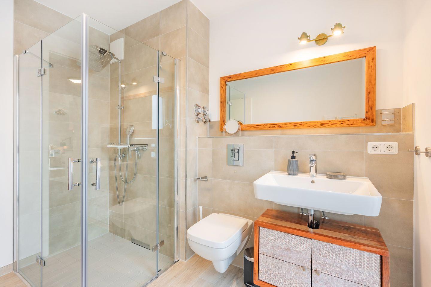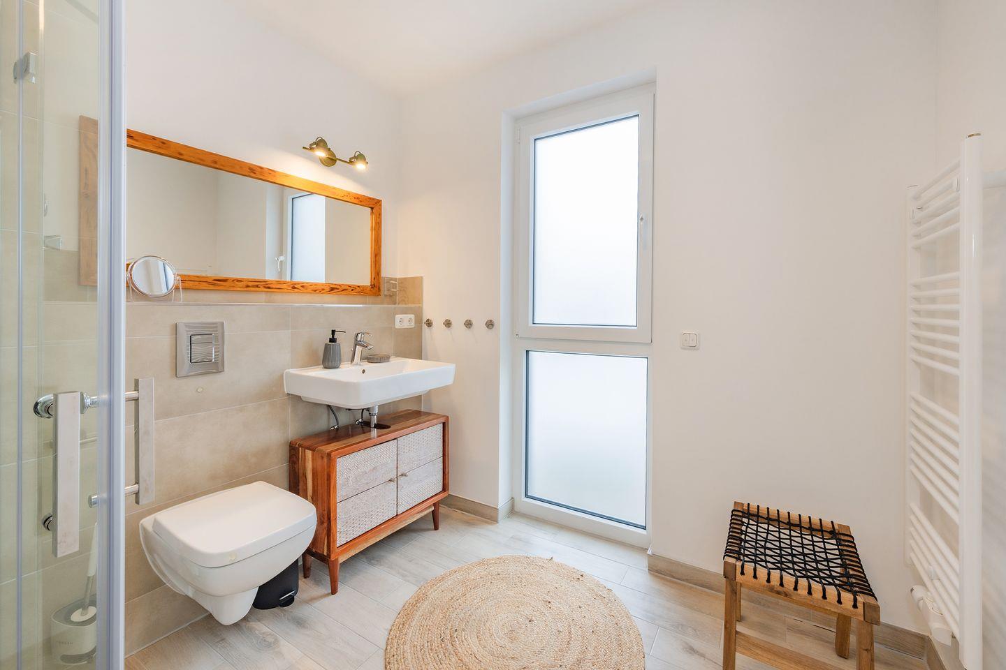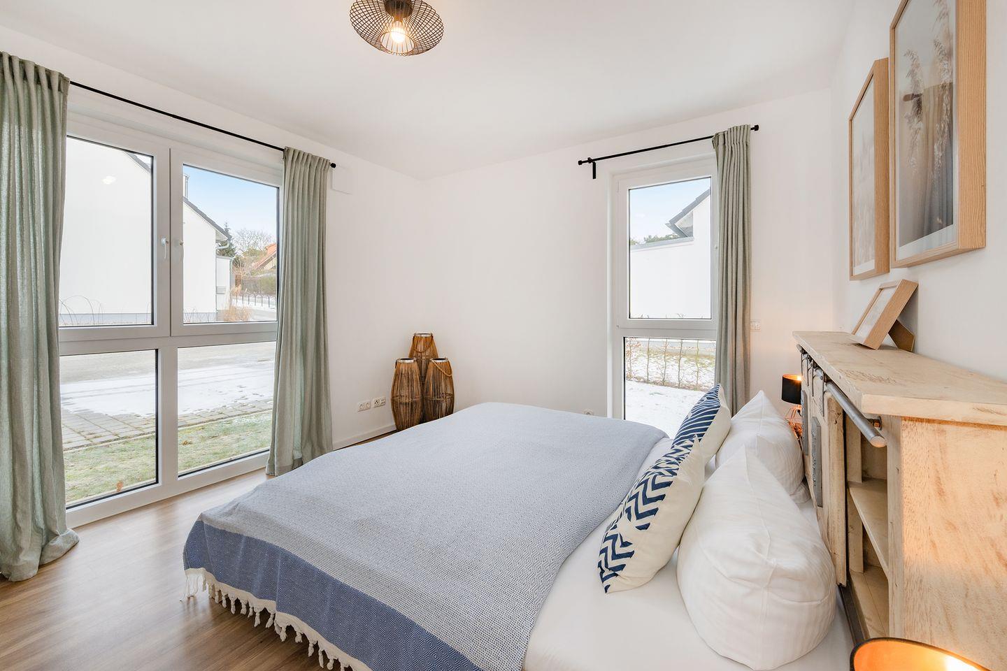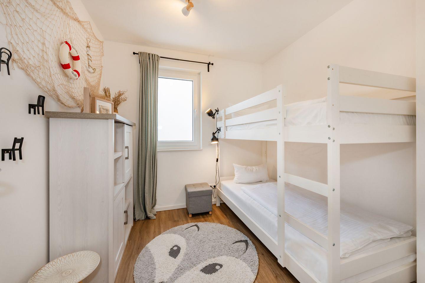 Die Ferienwohnung verfügt über zwei separate Schlafzimmer. Das Hauptschlafzimmer ist mit einem komfortablen Doppelbett mit einer Liegefläche von 1,80 m x 2,00 m sowie einem Kleiderschrank ausgestattet. Im zweiten Schlafzimmer stehen ein Etagenbett und eine Kommode zur Verfügung, ideal für Kinder oder zusätzliche Mitreisende. Das moderne und stilvolle Badezimmer überzeugt mit einer Dusche und bodengleichem Einstieg. Eine angenehme Fußbodenheizung sorgt ganzjährig für ein komfortables Wohnklima. Zusätzlich stehen eine Waschmaschine, ein Kinderbett und ein Hochstuhl bereit.
