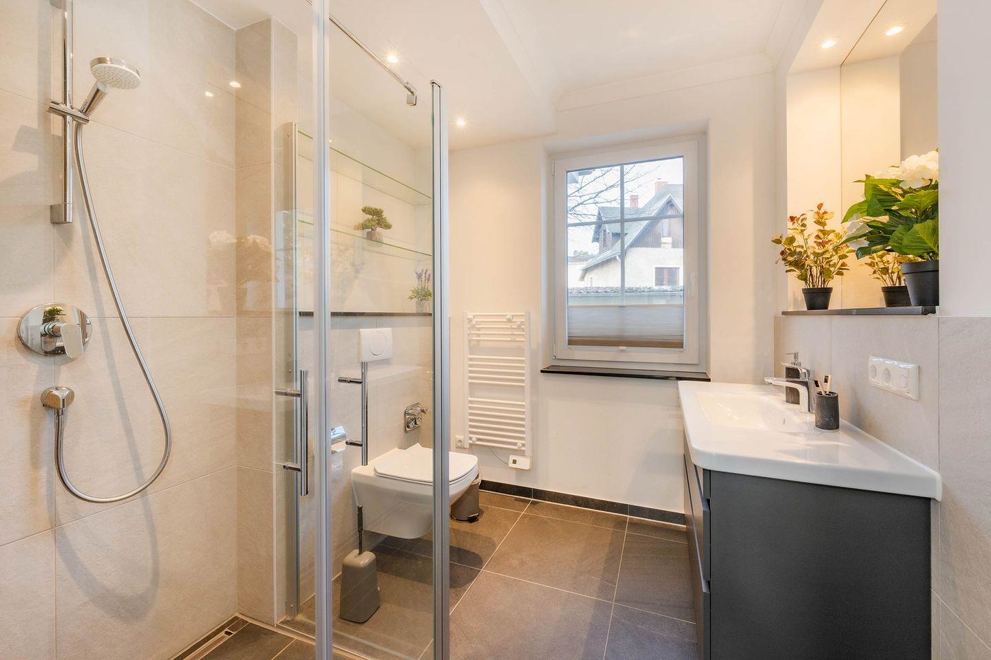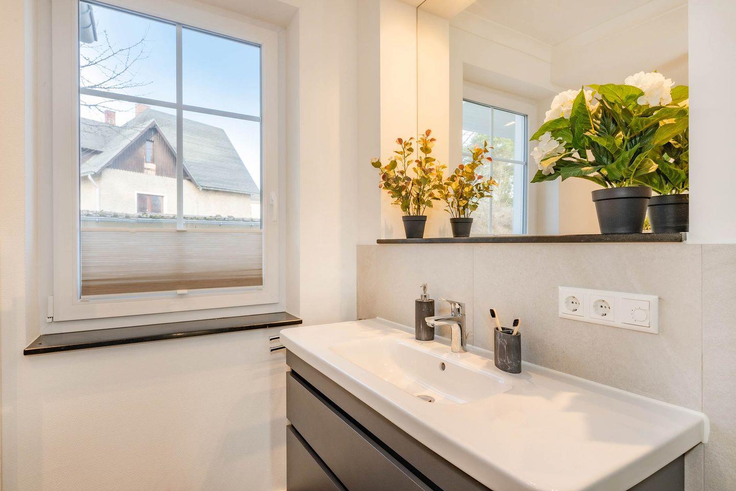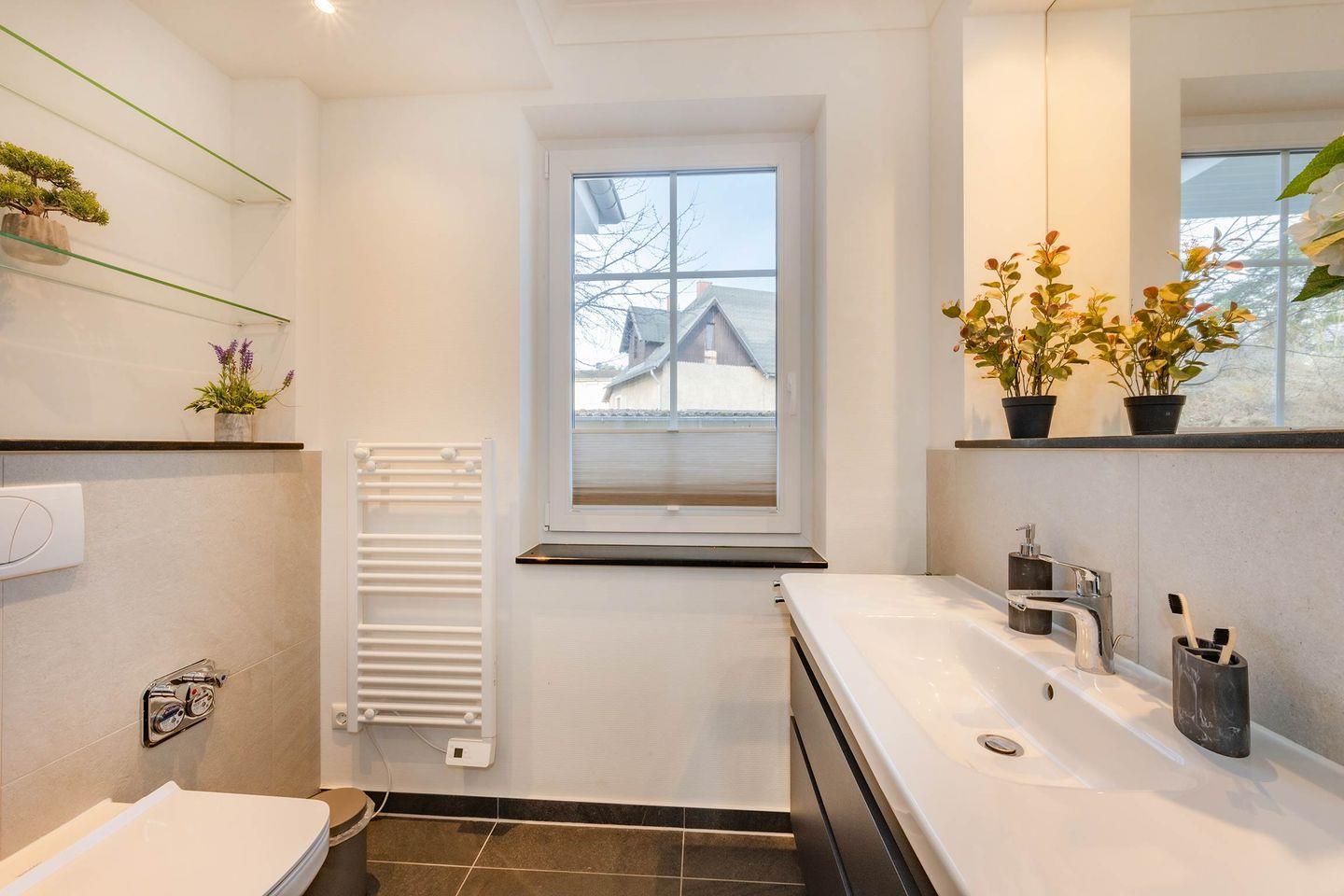 Das stilvolle Badezimmer verfügt über eine bodengleiche Dusche, einen Handtuchheizer sowie Fußbodenheizung und sorgt damit für zusätzlichen Komfort. Für einen sorgenfreien Start in den Urlaub sind alle Betten bereits bezogen, Handtücher liegen in ausreichender Anzahl bereit und eine Grundausstattung an wichtigen Dingen ist vorhanden.
