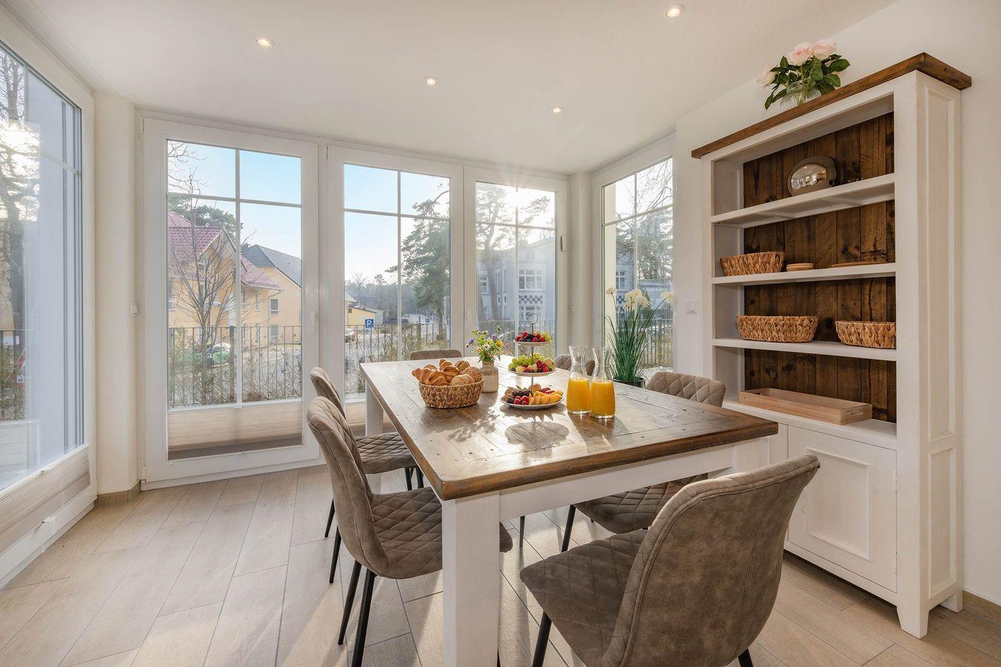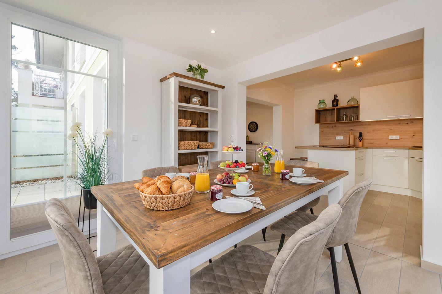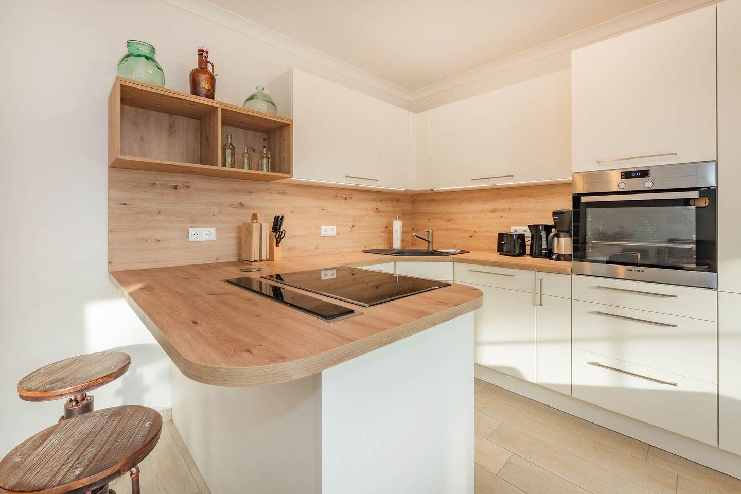 Die großzügige Ferienwohnung mit 76 Quadratmetern Wohnfläche befindet sich im Erdgeschoss des Hauses und überzeugt durch ein modernes, lichtdurchflutetes Wohnkonzept. Große Fensterflächen, eine helle Einrichtung und sorgfältig ausgewählte Dekoration schaffen eine angenehme Wohlfühlatmosphäre. Herzstück der Wohnung ist die stilvolle, moderne Küche, die mit Backofen, Mikrowelle, Induktionskochfeld und Spülmaschine ausgestattet ist. Ein lichtdurchfluteter Erker mit großem Esstisch lädt zu gemeinsamen Mahlzeiten ein und bietet den idealen Platz für ein ausgedehntes Frühstück oder ein entspanntes Abendessen.
