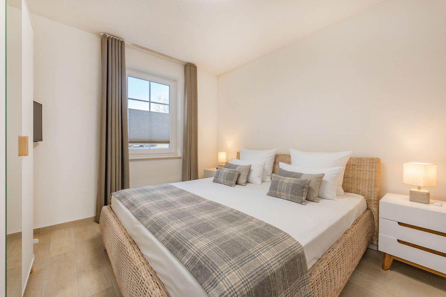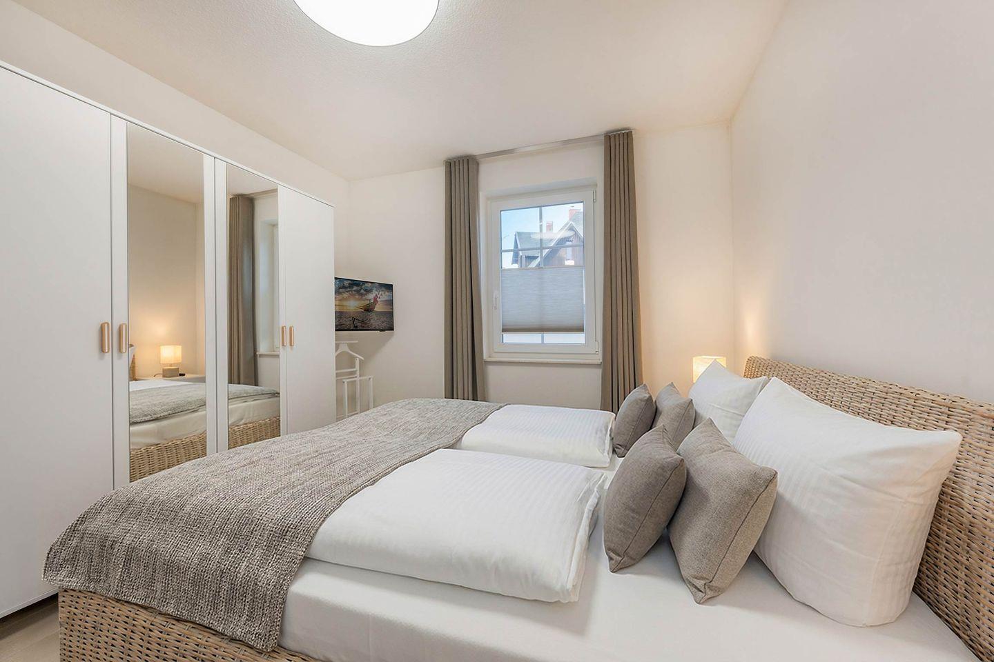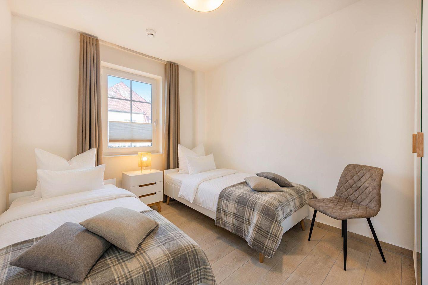 Die Ferienwohnung verfügt über zwei Schlafzimmer. Das Hauptschlafzimmer ist mit einem Doppelbett (1,80 m x 2,00 m), Verdunklungsmöglichkeiten und einem großzügigen Kleiderschrank ausgestattet. Das zweite Schlafzimmer bietet zwei Einzelbetten sowie ebenfalls Verdunkelung und ausreichend Stauraum. Beide Räume sind modern eingerichtet und bieten angenehme Rückzugsorte für erholsame Nächte.