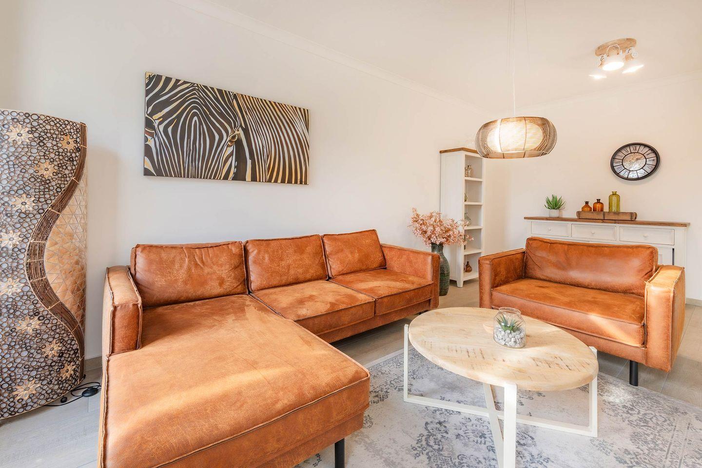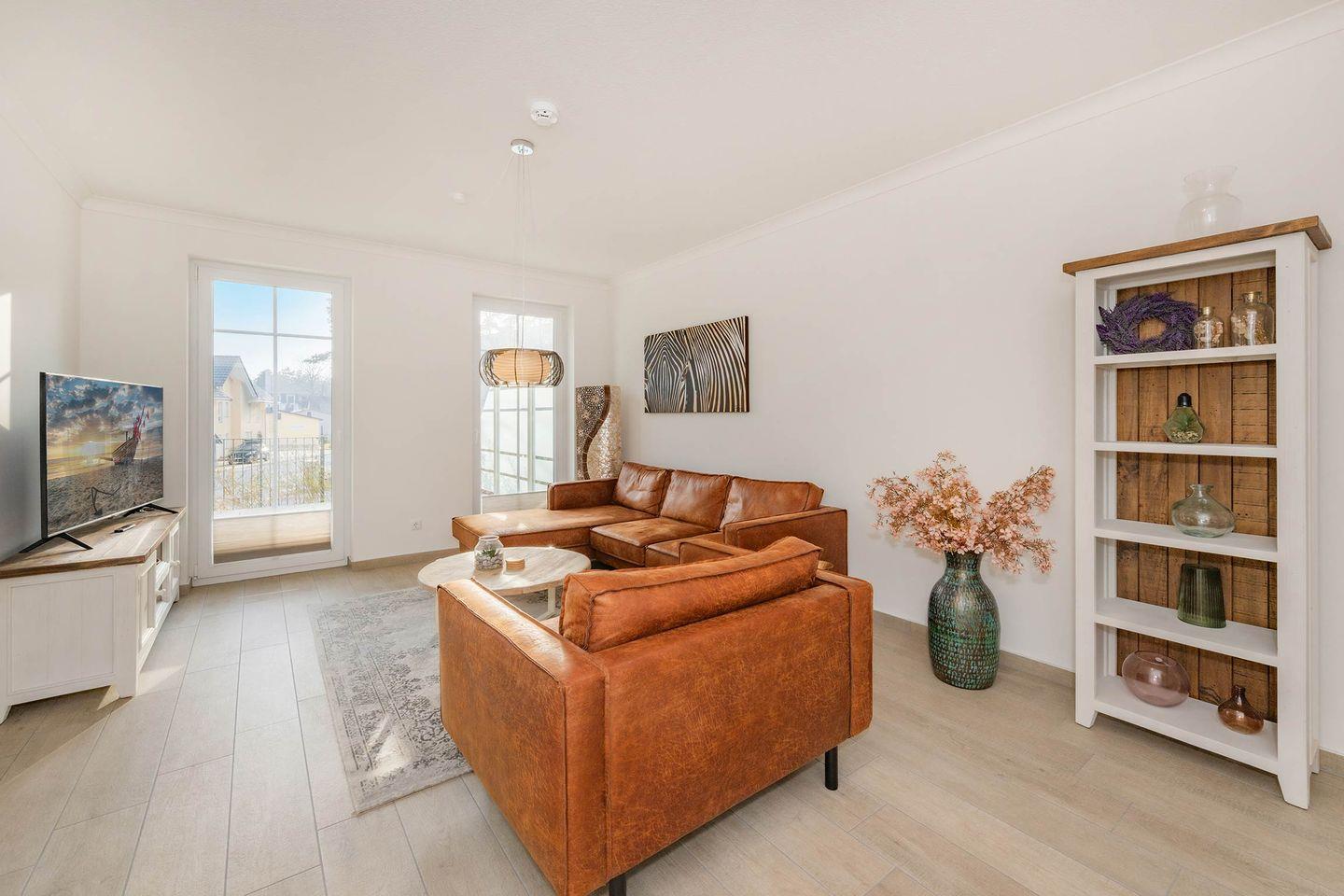 Der offene Übergang zum Wohnbereich sorgt für ein großzügiges Raumgefühl. Hier erwartet Sie eine gemütliche Sitzecke mit Flat-TV und der Möglichkeit zur Nutzung von Amazon Prime und Netflix über den eigenen Account. Die große Fensterfront sorgt für viel Tageslicht und unterstreicht die moderne, freundliche Gestaltung der Räume.