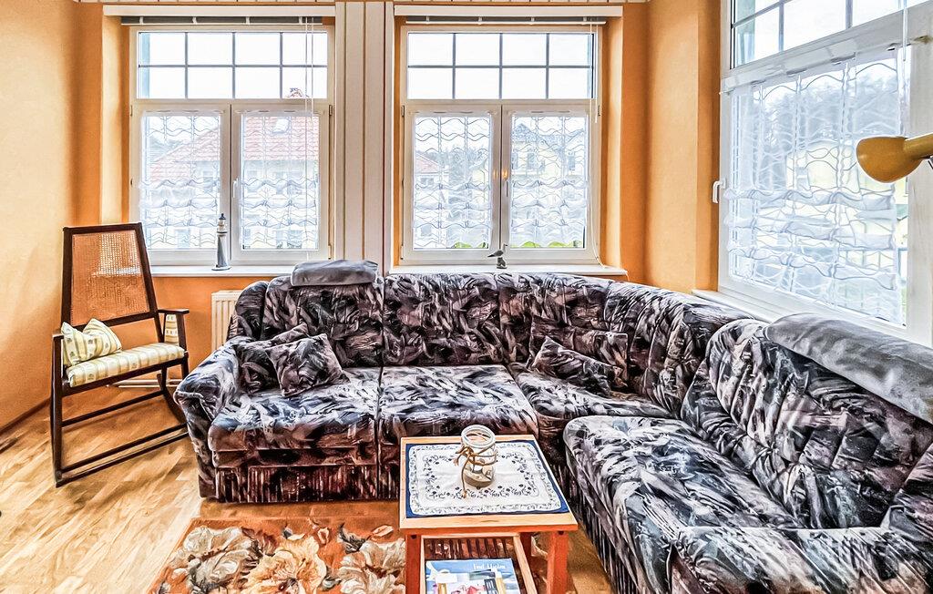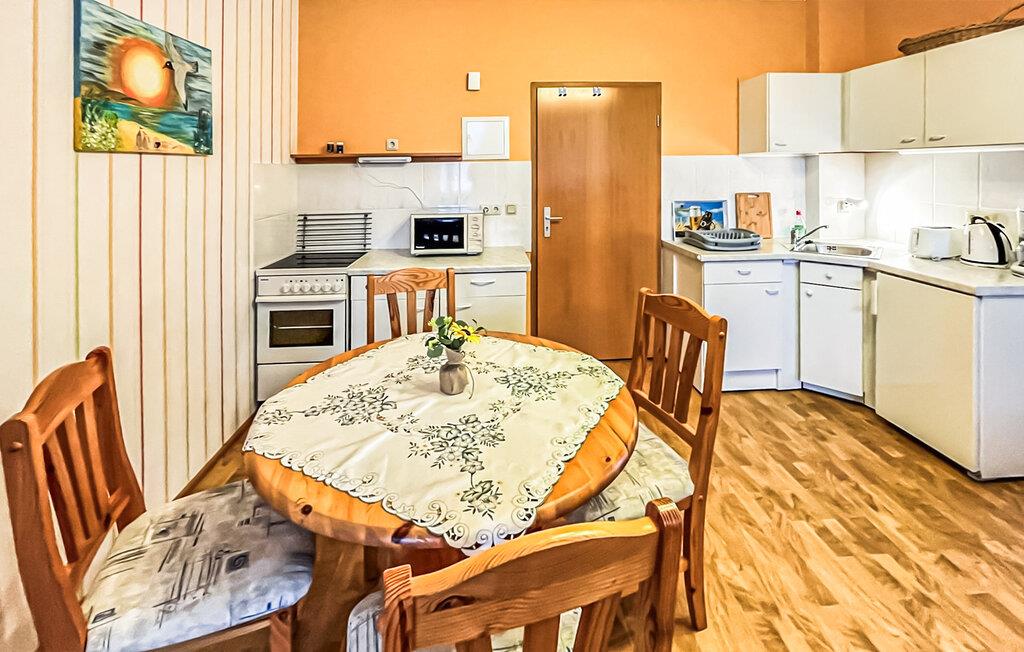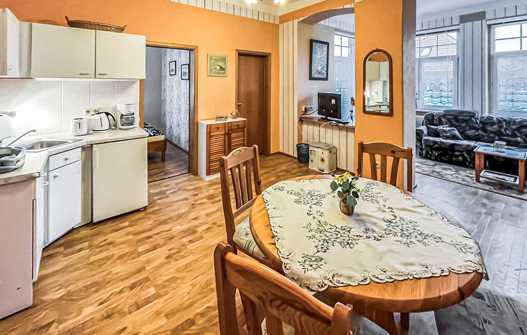 De seks ikke-ryger ferielejligheder af forskellig størrelse og indretning ligger separat i stueetagen og øverste etage i en lejlighedsbygning med en central beliggenhed. Der er også et sommerhus (DZV870) på ejendommen. Østersøstranden med strandpromenade, restauranter/caféer og Usedomer Bäderbahn togstation ligger inden for cirka 500 m. Toværelseslejligheden til 2 til maks. 4 personer ligger på øverste etage og har en møbleret balkon. Den er udstyret med opholdsstue (polstrede møbler med sovefunktion som ekstra seng til 2 personer, fladskærms-tv), åbent tekøkken (spisebord, el-komfur med ovn, køleskab med fryser, mikroovn, diverse køkkenmaskiner) , et soveværelse (dobbeltseng) og et badeværelse med bruser/toilet. Der er et centralt udendørs opholdsområde med grillfaciliteter på den 820 kvm store ejendom. Der er også opbevaringsplads til cykler og parkeringsplads til biler. En barneseng og høj stol kan stilles til rådighed for små børn. Der er også gratis WiFi. Lejeprisen inkluderer slutrengøring, sengetøj samt vand- og elforbrug. Håndklæder skal medbringes. Der skal betales en spaskat i feriestedet Kölpinsee ved Østersøen (betales på stedet) Kæledyr er ikke tilladt på denne ejendom. Badebyen Kölpinsee er et distrikt i Loddin kommune i den midterste del af øen Usedom, på det smalle punkt mellem Østersøen og Achterwasser. Østersøstranden i Kölpinsee er bred og særlig fin. Samtidig lover stedet fred og afslapning ved Achterwassers indre kyst og er et interessant sted at opholde sig, især for lystfiskere takket være den fiskerige Kölpinsee. Der er en multi-generation legeplads på promenaden. Forskellige arrangementer finder sted fra maj til oktober i den lokale spa-pavillon med udsigt over søen Kölpinsee. Restauranter og indkøbsmuligheder, en ridestald og udlejning af cykel, båd og strandstole er også placeret i byen.
