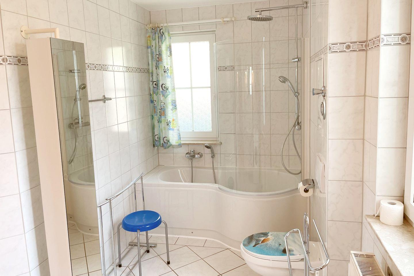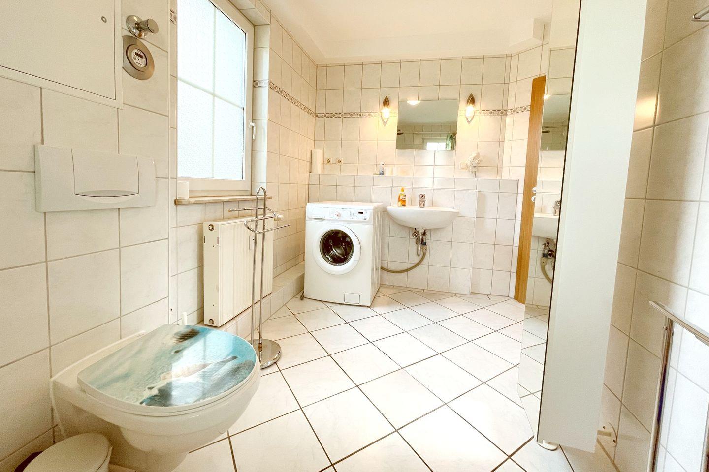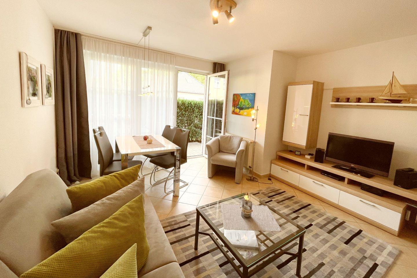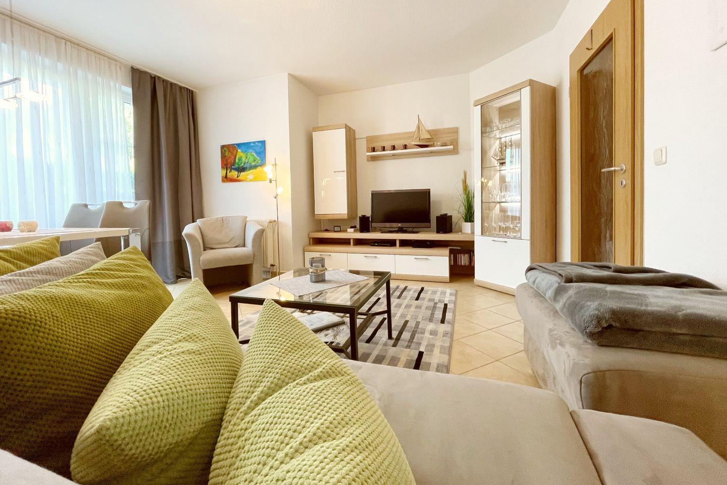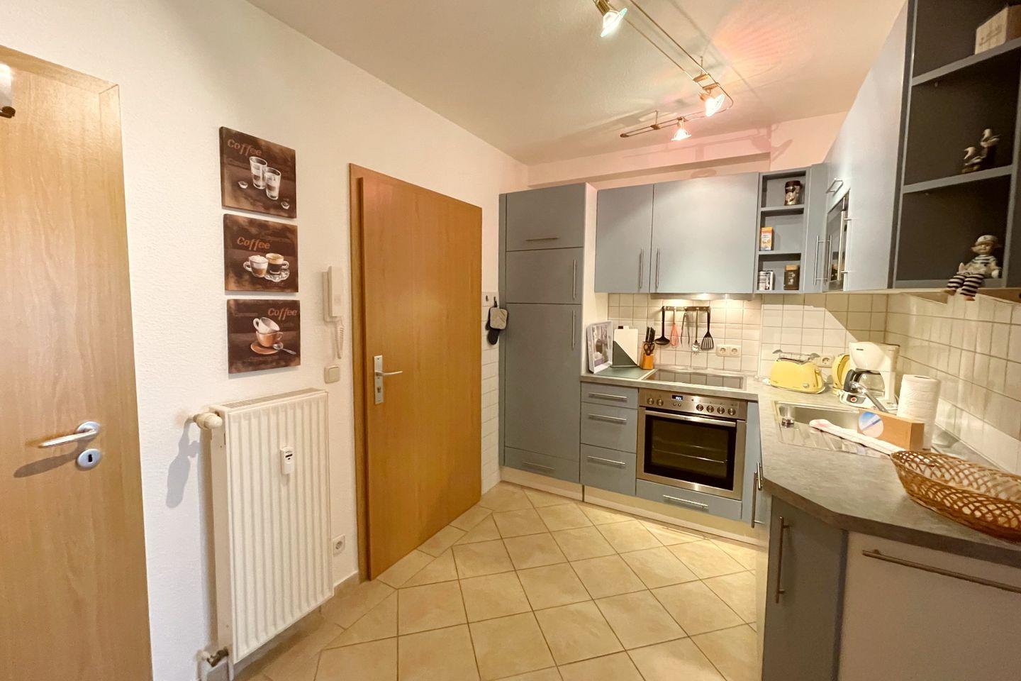 Die Ferienwohnung besteht aus einem großzügigen Schlafzimmer und einem einladenden Wohnzimmer, das mit einer Sofaecke, einem Esstisch und Fernseher ausgestattet ist. Hier können Sie entspannte Abende verbringen und die Zeit gemeinsam genießen. Die voll ausgestattete, geschlossene Küche lässt keine Wünsche offen: Von einem Cerankochfeld über einen Backofen und eine Spülmaschine bis hin zu Geschirr und Besteck – alles ist vorhanden, um sich selbst zu versorgen. Wenn Sie nach einem langen Tag am Strand zurückkehren, können Sie sich in der hellen, freundlich gestalteten Dusche mit Badewanne erfrischen oder entspannen.