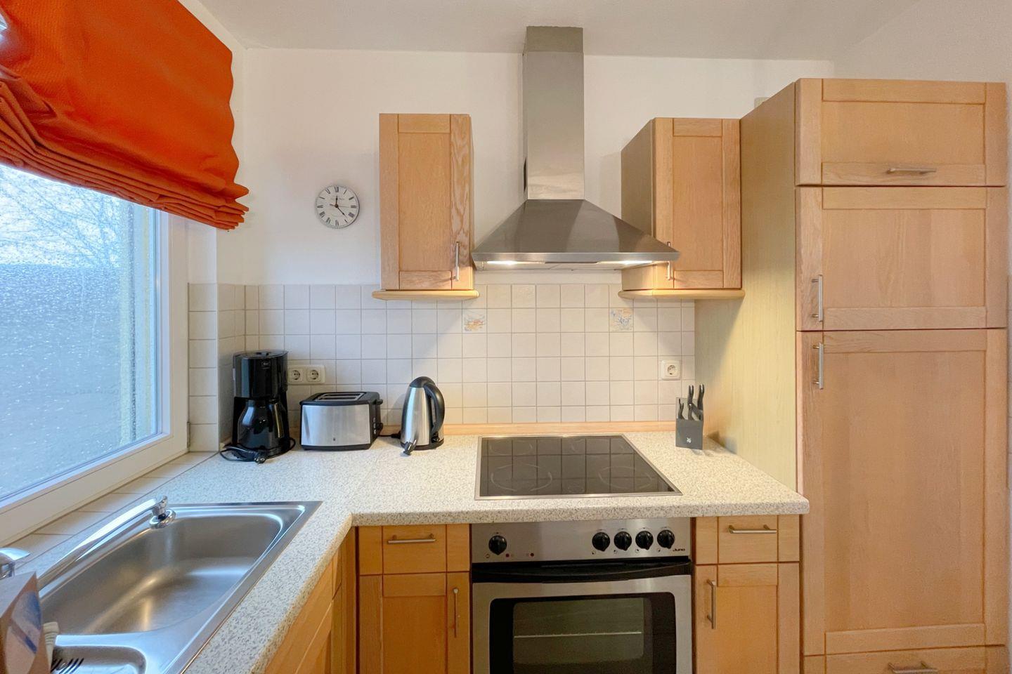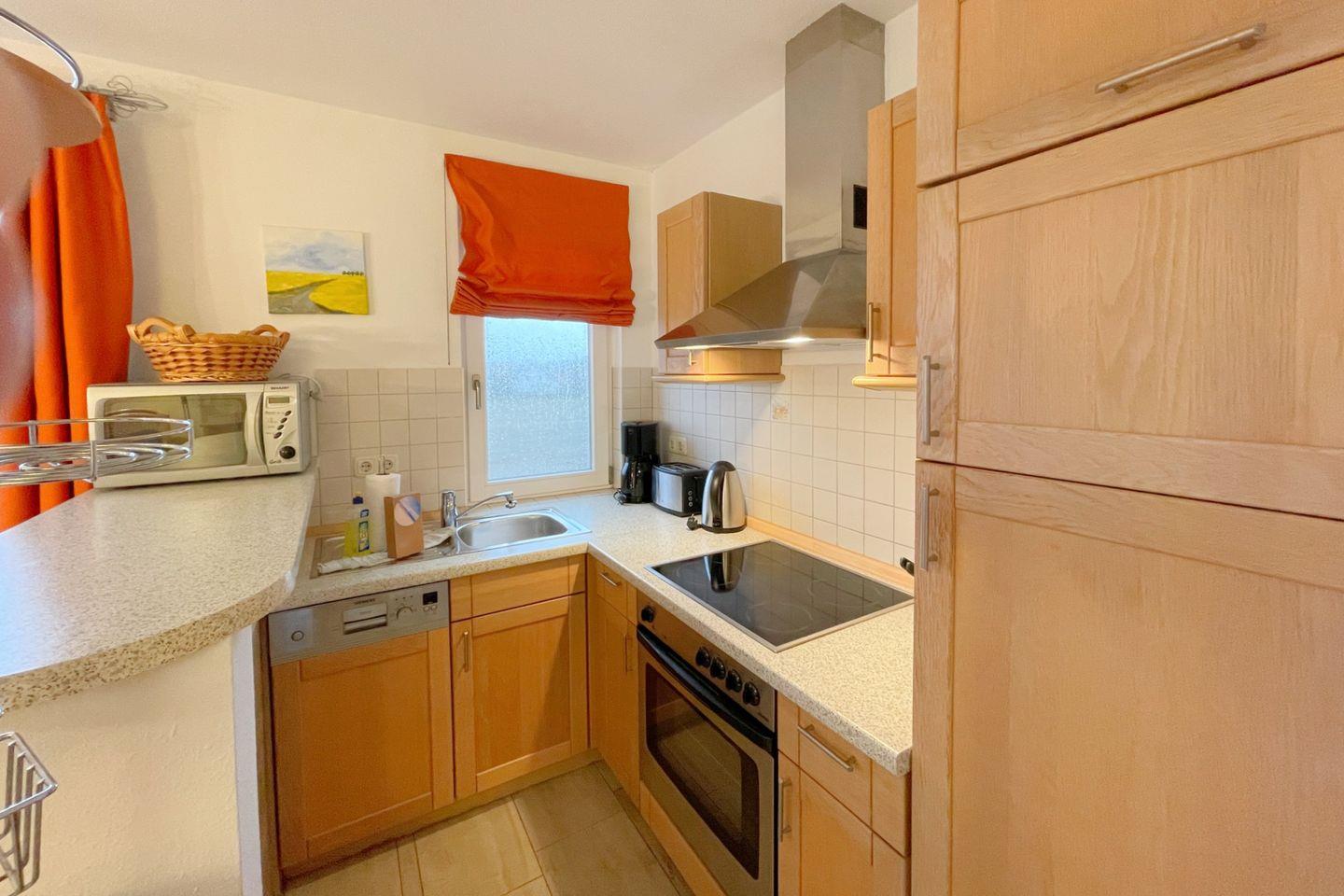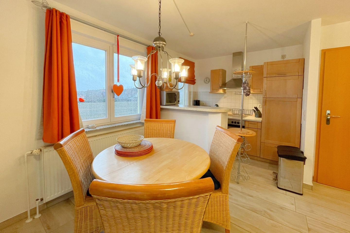 In der ersten Etage des gemütlichen Hauses erwartet Sie ein lichtdurchflutetes Wohnzimmer, das mit einer komfortablen Sofaecke und einem Esstisch ausgestattet ist – der perfekte Ort, um gemeinsame Mahlzeiten zu genießen oder sich nach einem erlebnisreichen Tag zu entspannen. Die angrenzende, offene Küche ist modern eingerichtet und bietet alles, was Sie für die Zubereitung kulinarischer Köstlichkeiten benötigen. Mit Geräten wie einem Backofen, einer Mikrowelle, einem Ceran-Herd sowie einer Spülmaschine steht einem leckeren Dinner in der eigenen Ferienwohnung nichts im Wege.