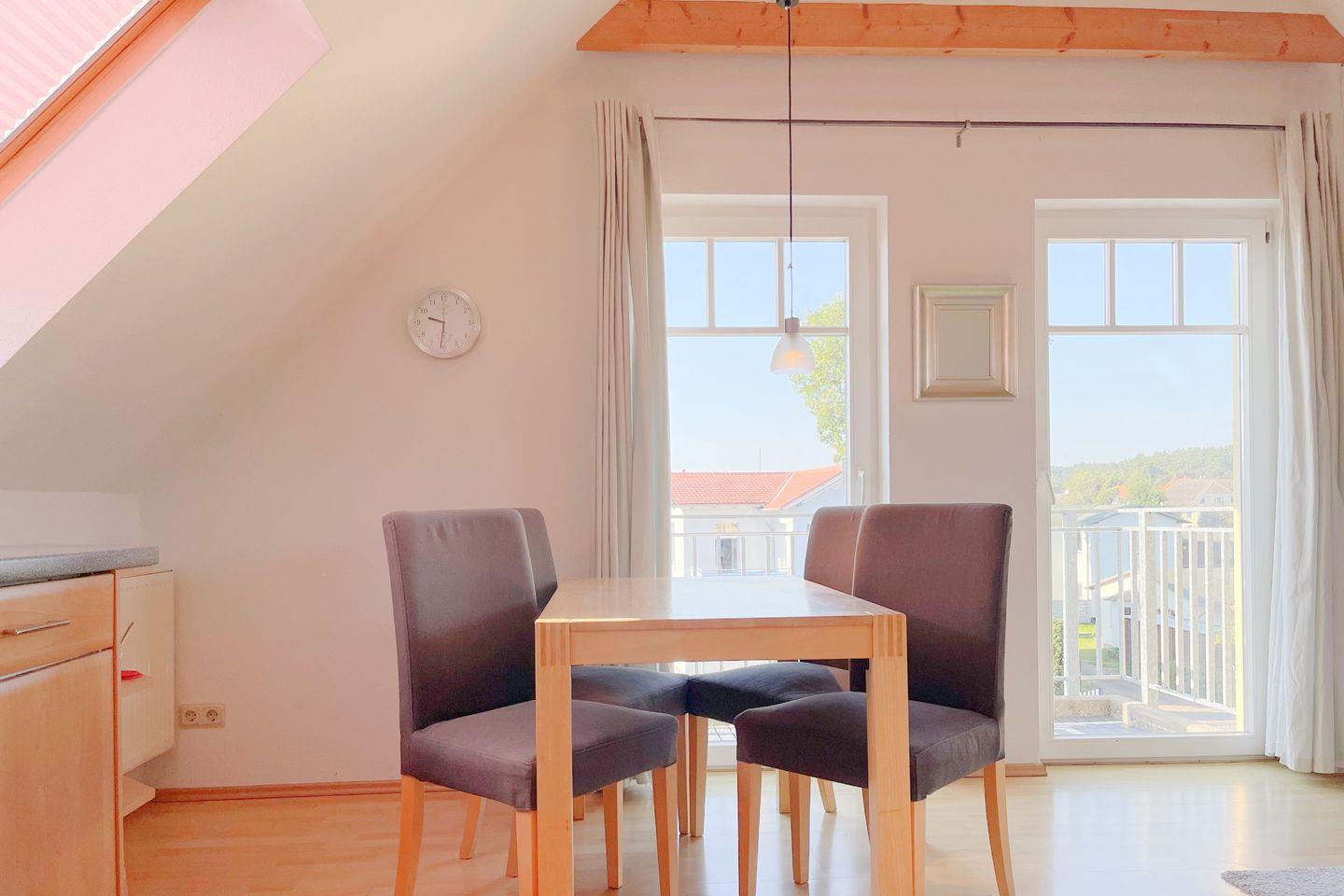 Die Wohnung verfügt über zwei komfortable Schlafzimmer, die sowohl Ruhe als auch Gemütlichkeit bieten. Der offene Wohn- und Essbereich lädt zu geselligen Abenden ein und ist mit einer modernen Küche ausgestattet, die alles bietet, was Sie zur Zubereitung Ihrer Lieblingsgerichte benötigen – von einem Cerankochfeld über einen Backofen bis hin zu einer Spülmaschine und umfangreichen Küchenutensilien. Genießen Sie Ihre Mahlzeiten am Esstisch oder auf dem Balkon, der einen herrlichen Blick auf die umliegende Natur bietet.