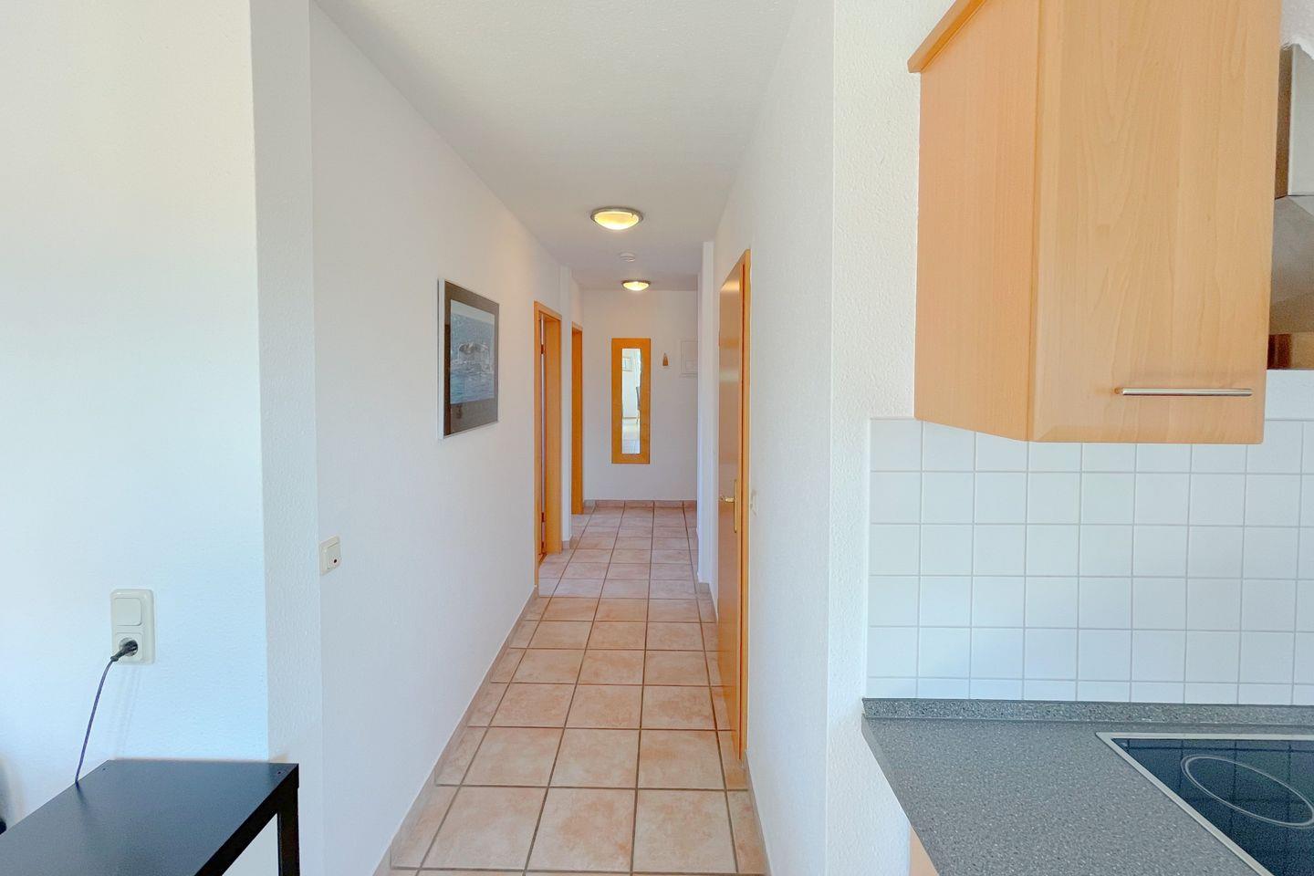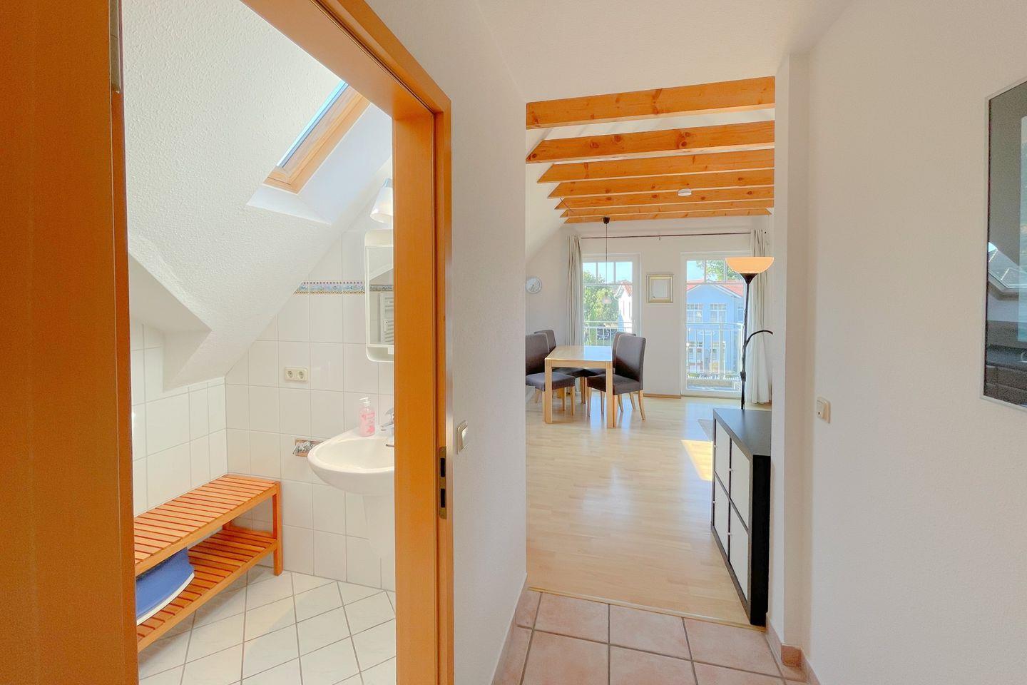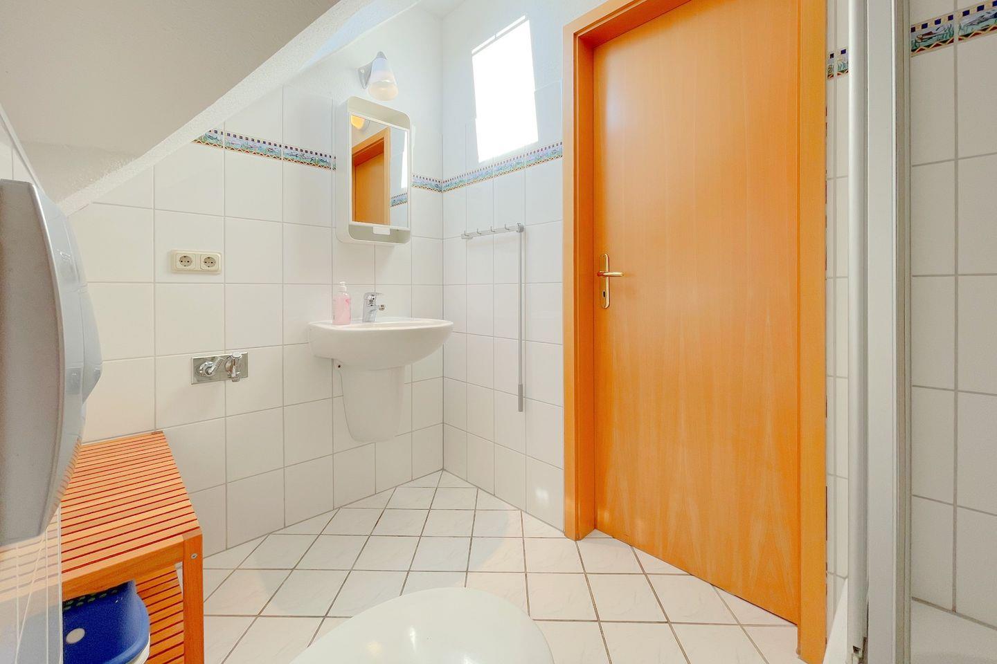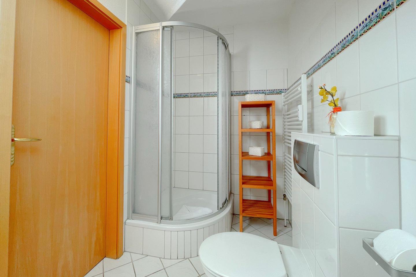 Für zusätzliche Entspannung sorgt das Badezimmer mit einer Dusche, ideal nach einem erlebnisreichen Tag in der Natur oder am Strand. Die gesamte Wohnung ist mit Zentralheizung ausgestattet, sodass Sie auch in den kühleren Monaten eine angenehme Atmosphäre genießen können.