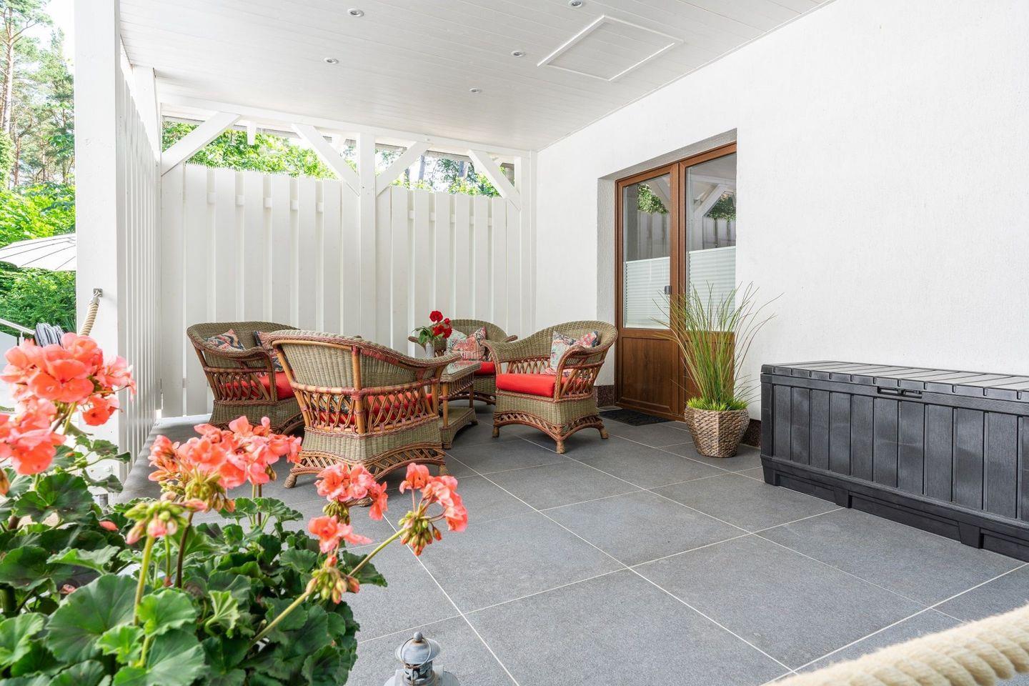 Ein Highlight des Ferienhauses ist die überdachte Terrasse, die einen herrlichen Ausblick in den Garten bietet. Hier können Sie entspannen, die frische Luft genießen oder einfach nur die Seele baumeln lassen. Die zum Garten gehörenden Gartenmöbel laden ein, um die Sonnenstrahlen zu genießen oder gemütliche Abendessen im Freien abzuhalten.