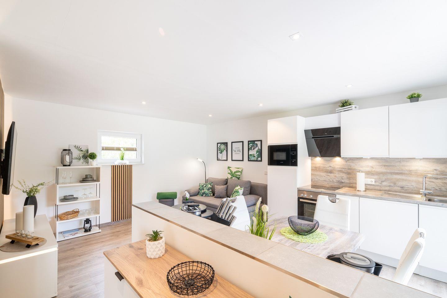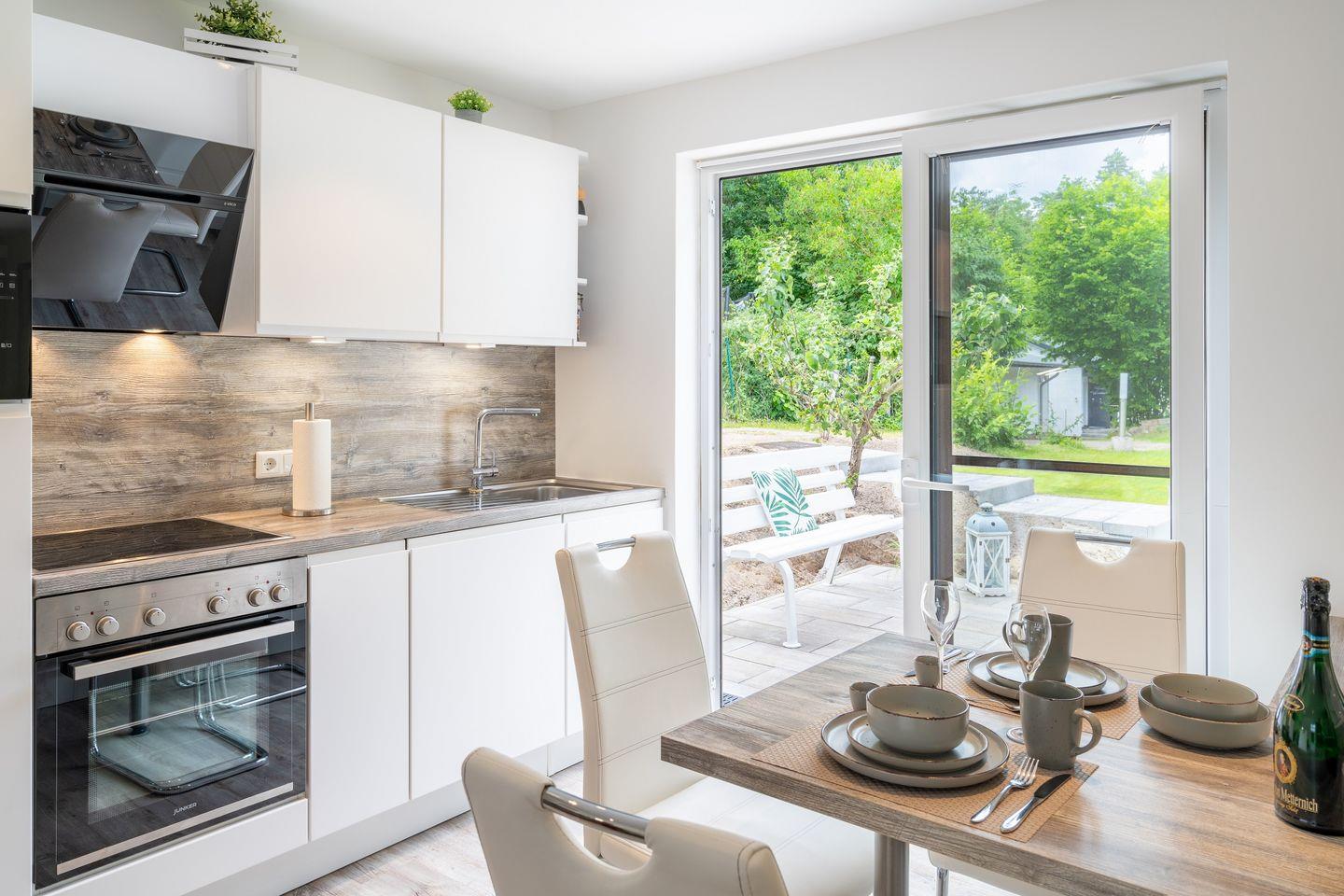 Das Ferienhaus verfügt über ein liebevoll gestaltetes Schlafzimmer, ein modernes Badezimmer mit bodengleicher Dusche und ein offenes Wohnkonzept, das die Wohnküche und den gemütlichen Wohnbereich harmonisch miteinander verbindet. Die voll ausgestattete Küche lässt keine Wünsche offen und verfügt über einen Backofen, eine Spülmaschine, einen Kühlschrank sowie eine Kaffeemaschine. Genießen Sie Ihr Frühstück am Esstisch und lassen Sie die Seele baumeln!