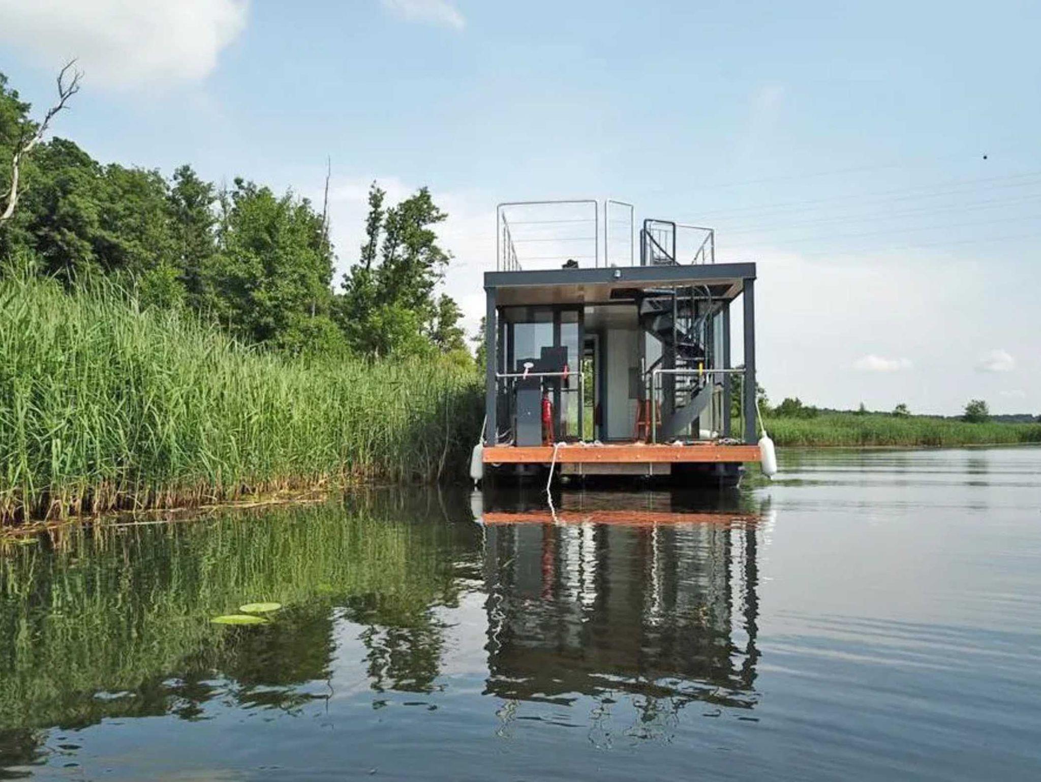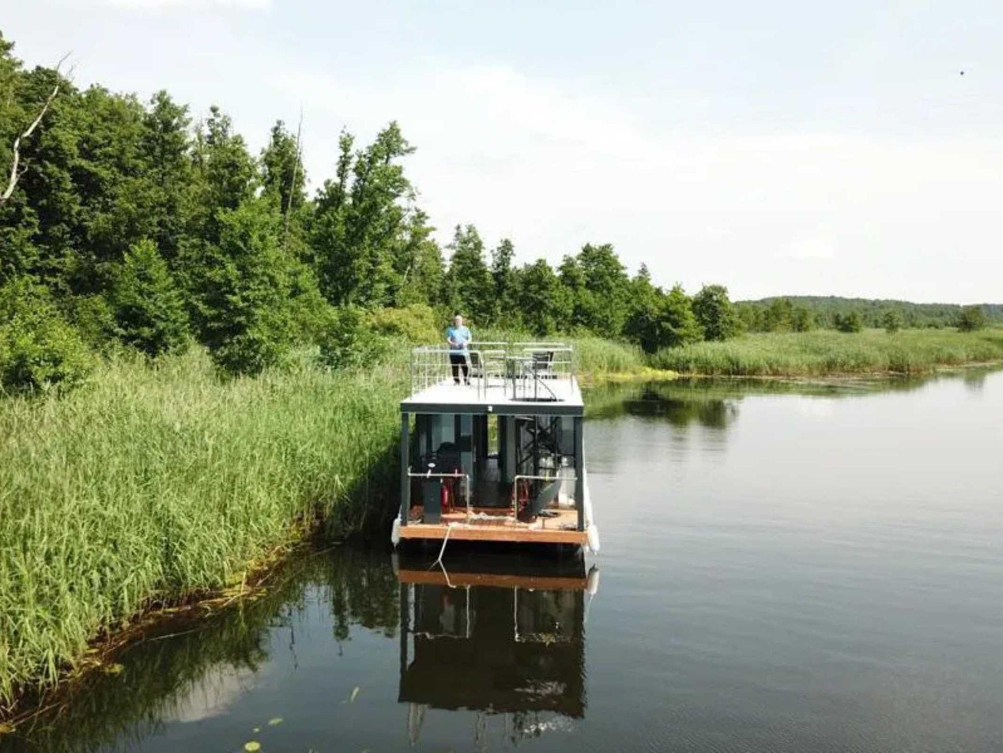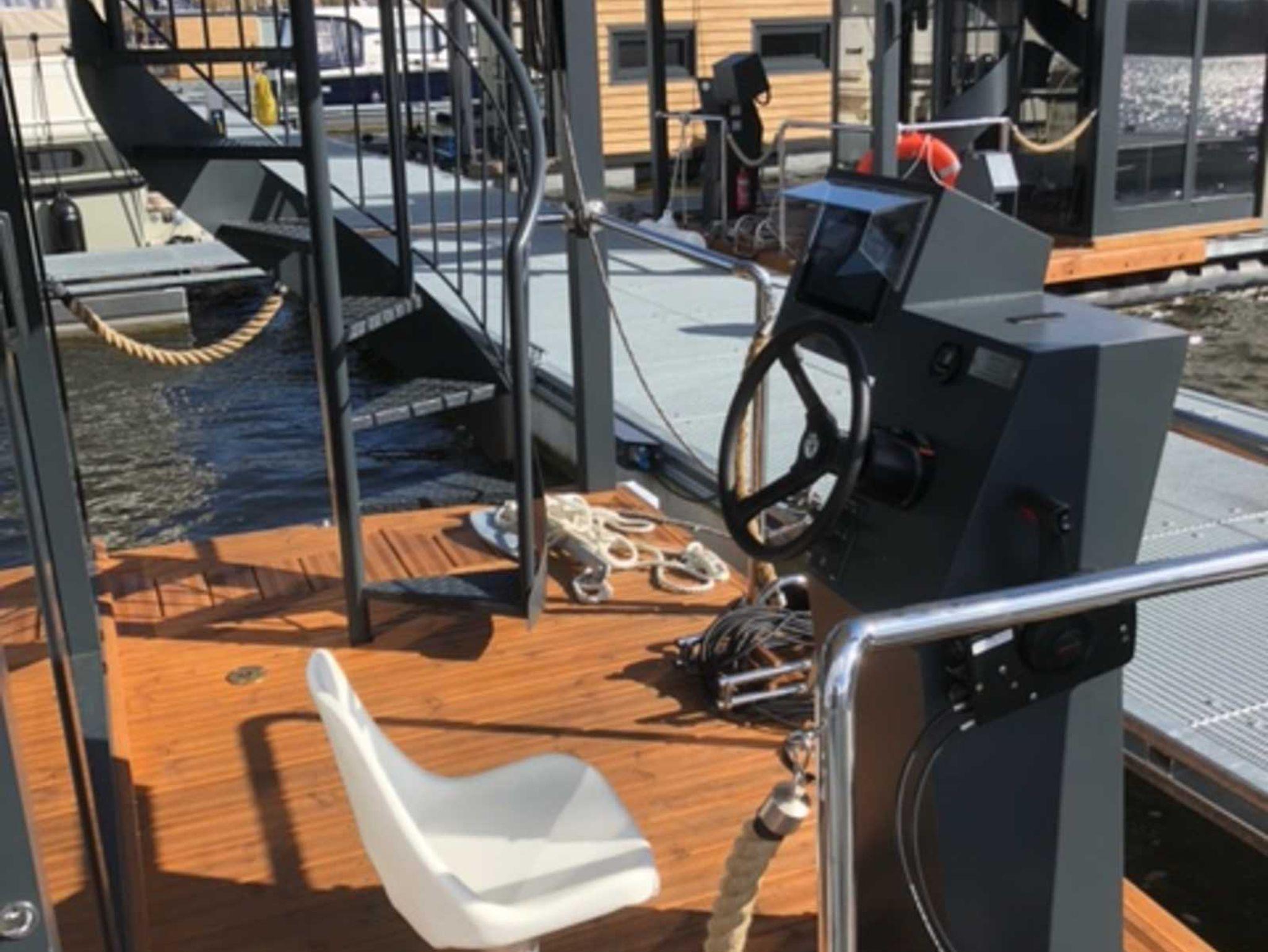 Es handelt sich um ein Hausboot vom Typ Woodstream 10,5 mit den Abmessungen 10,5 Meter x 3,5 Meter und 0,50 Meter Tiefgang. Ausgestattet mit einem 15 PS Motor mit Bugstrahlruder und Bugterrasse mit Fahrerstand,: einer Oberterasse mit Lounge-Möbeln, 1 großem Wohnraum mit Couchecke (Schlafcouch) und Kamin, kompletter Küche und Essplatz für 4 Personen, 2 Schlafräume für je 2 Personen, sowie einem großzügigem Bad mit Dusche und WC.