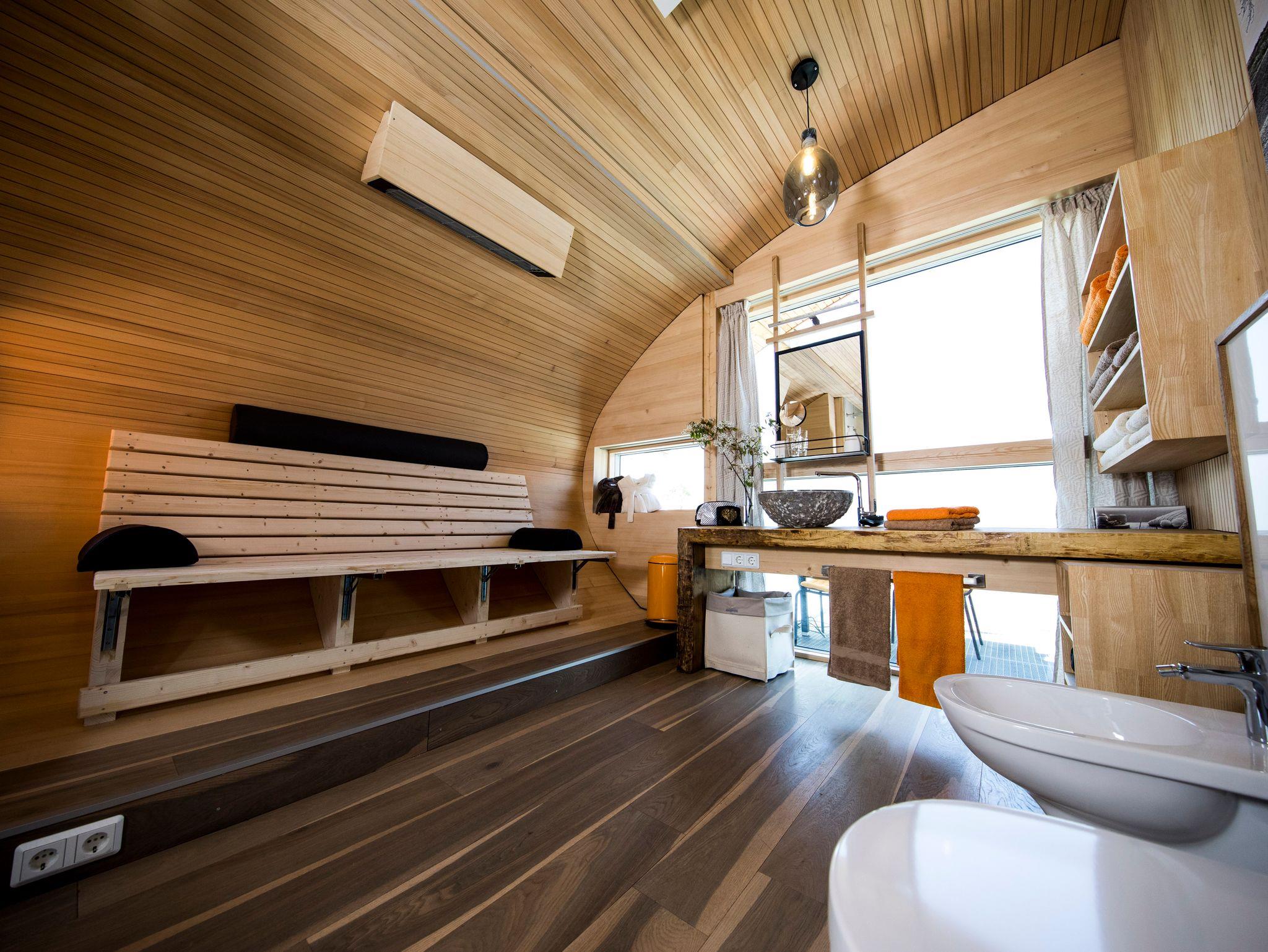 Im UFO47 erwartet Dich ein luftig, helles Wohngefühl. Den zentralen Blickfang bildet der Focus-Hängekamin, kinderleicht zu befeuern und wärmender Mittelpunkt zur Kuschelzeit. Die beiden Schlafzimmer sind zum Wohnraum hin nur mit Glas getrennt, eines der Schlafzimmer hat ein Smart-TV-Gerät. Wer frühmorgens nicht von den ersten Sonnenstrahlen an der Nase gekitzelt werden will, verdunkelt die Bettnische in der heimeligen,runden Bettnische mit Vorhängen. Ausblicke hat man im UFO47 nach allen vier Himmelsrichtungen, auf einem der drei Balkone kann man immer ein sonniges oder schattiges Plätzchen finden. Das große Wellness-Bad verwöhnt mit einer Infrarot-Liege und besonderen Einrichtungsideen vom Schreiner-Designer! Auch die passgenau konzipierte Küche lässt keine Wünsche offen, und dann ist da noch der ganz besondere Chillingplace im Bullauge mit Blick auf den Schwimmteich.... einfach galaktisch!