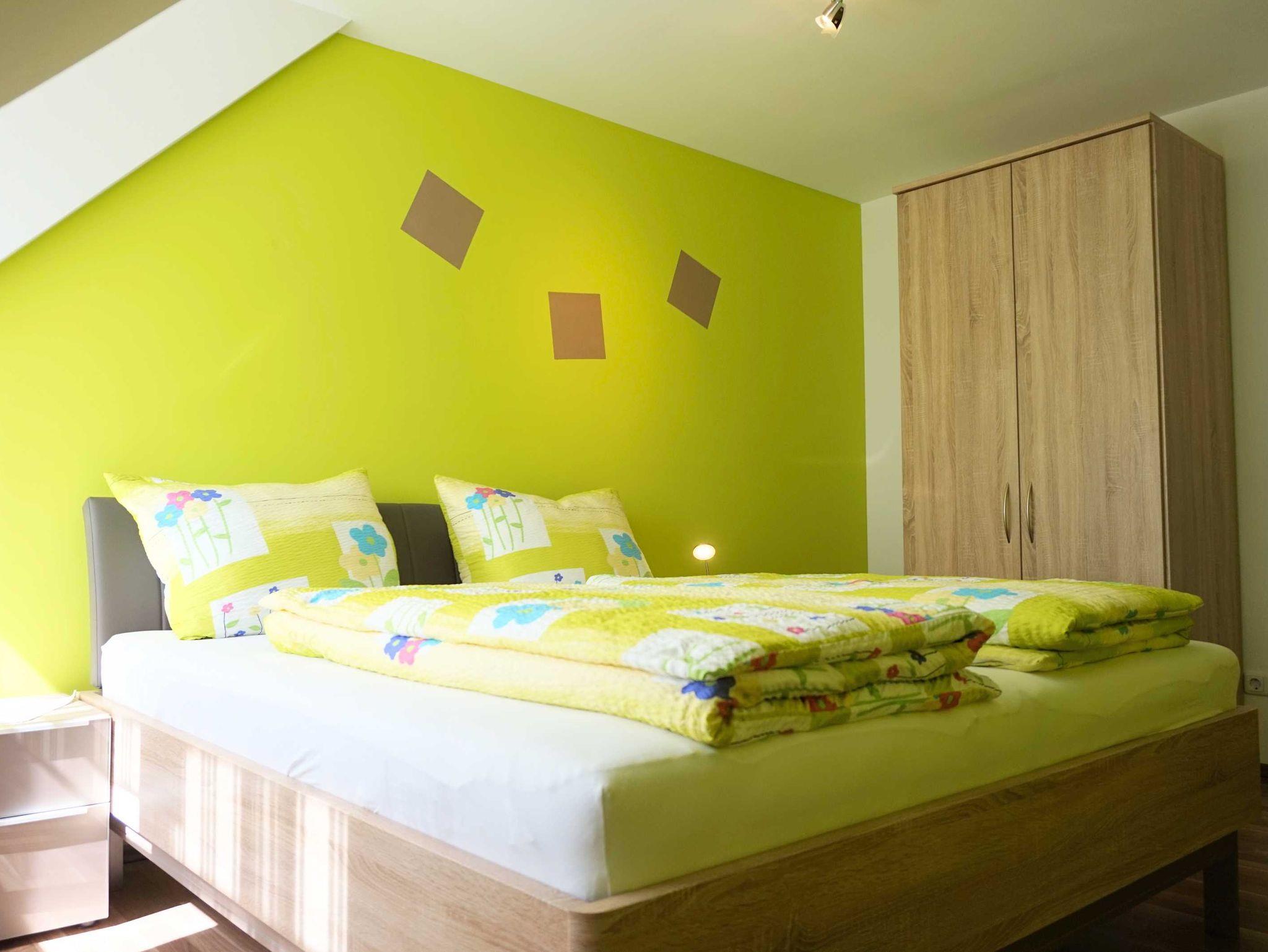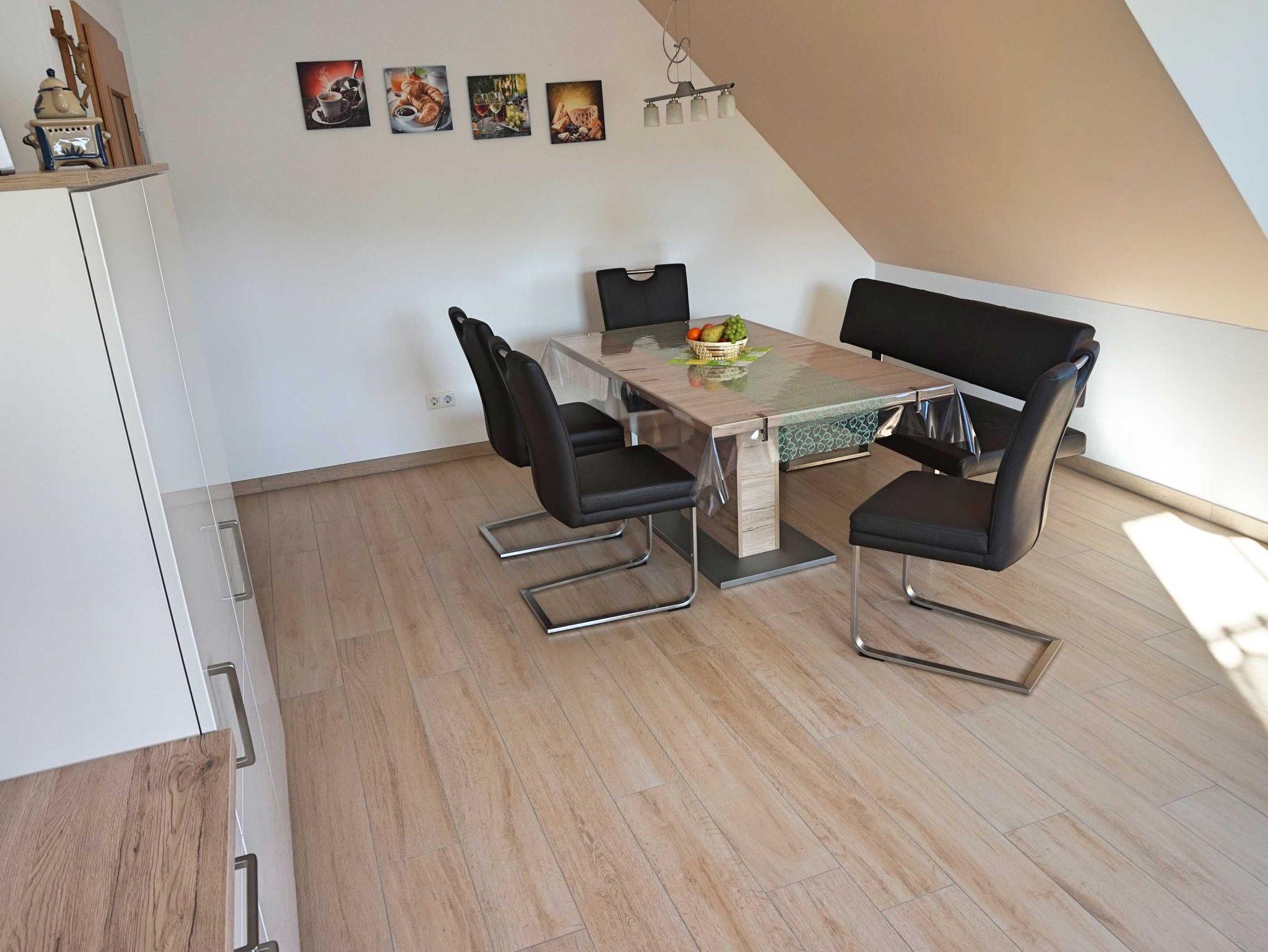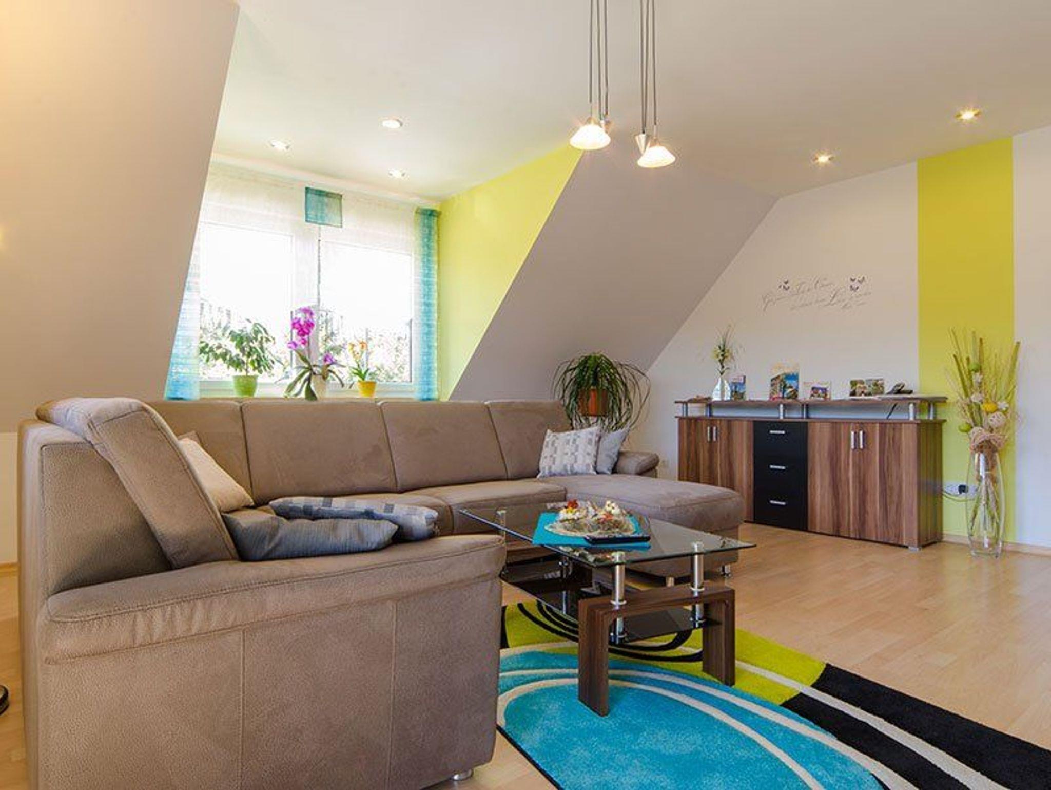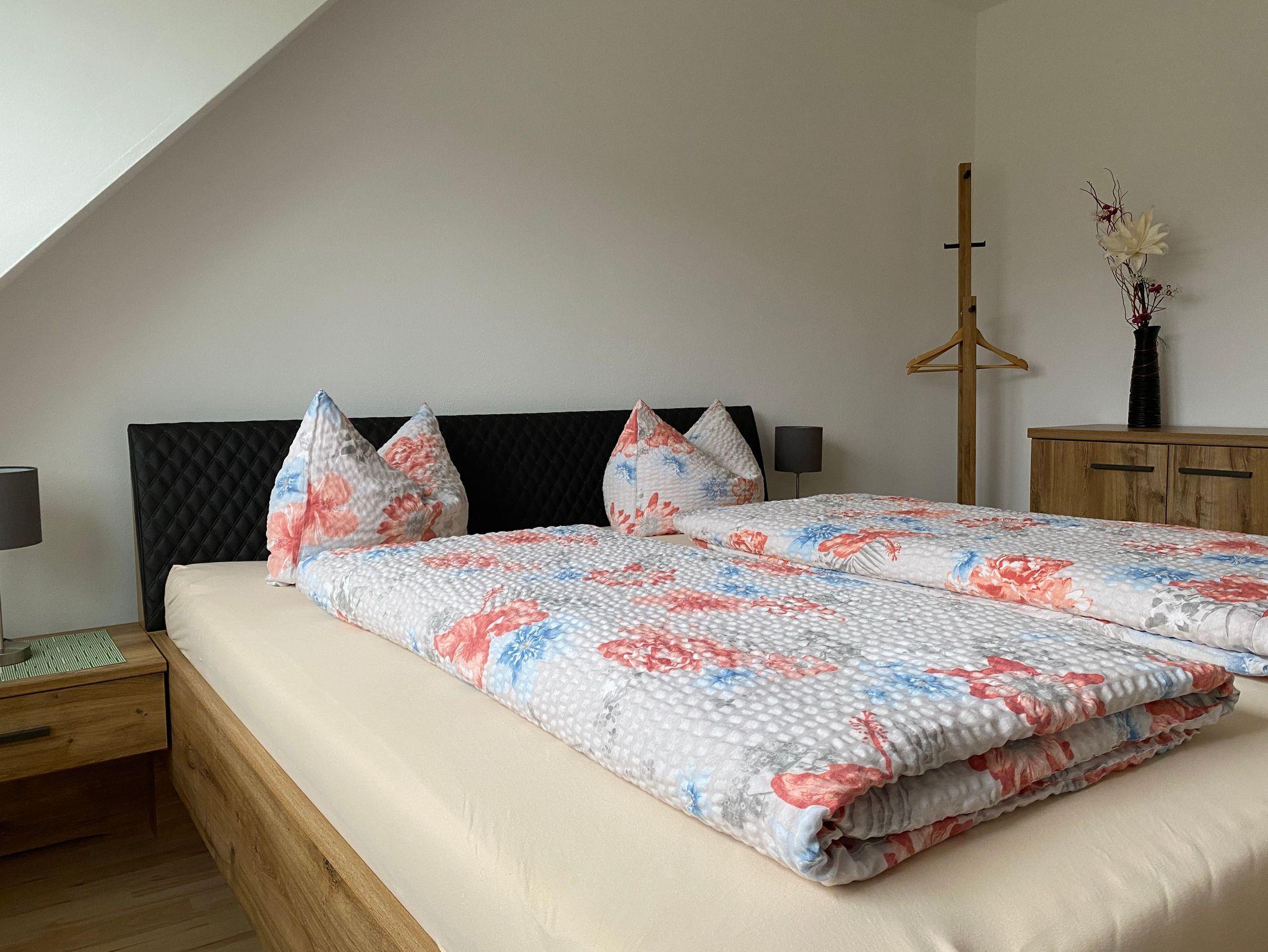 Wir bieten Ihnen eine neu komfortable Ferienwohnung für 2 bis 5 Personen (alternativ bis 7 Personen nutzbar). Unsere Ferienwohnung befindet sich im Dachgeschoss. Auf ca.100 qm Wohnfläche lässt es sich wohlfühlen mit einem Doppelschlafzimmer, zwei Kinderzimmer (ein Kinderzimmer kann auch als Doppelzimmer genutzt werden), Küche, Bad, Wohnzimmer mit Schlafcouch und Balkon.
