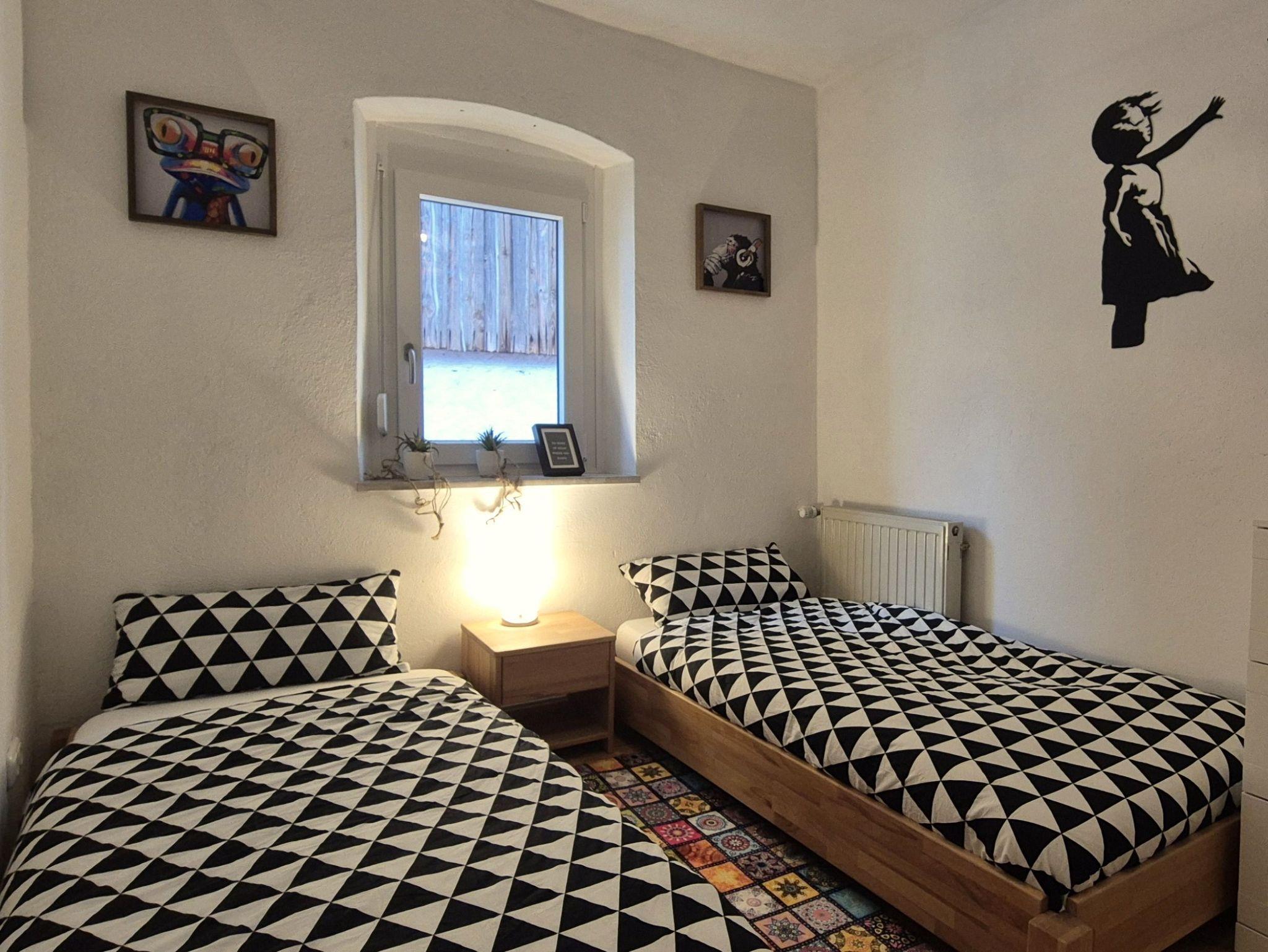 In diesem Zimmer stehen 2 Betten zur Verfügung. Sollte nur eines gebraucht werden, kann man diese aufeinander stapeln und gewinnt so zusätzlichen Platz.