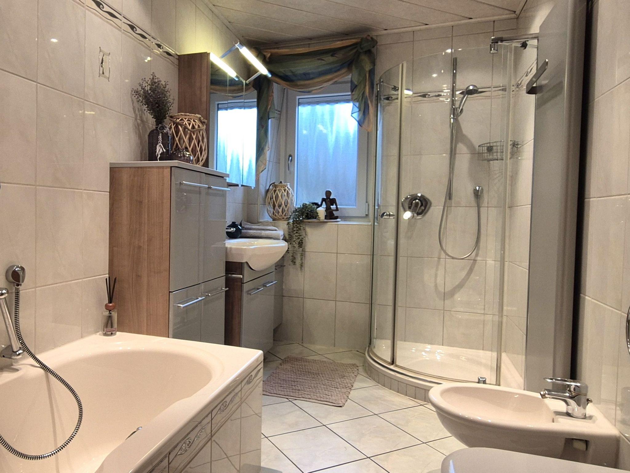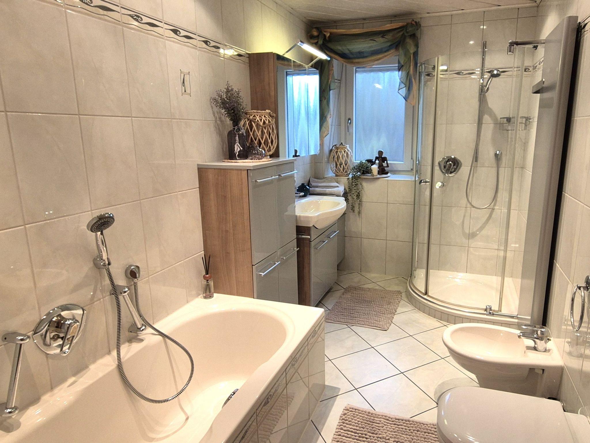 Ein großzügiges Bad mit Dusche, Badewanne und WC befindet sich ebenso im Erdgeschoss.