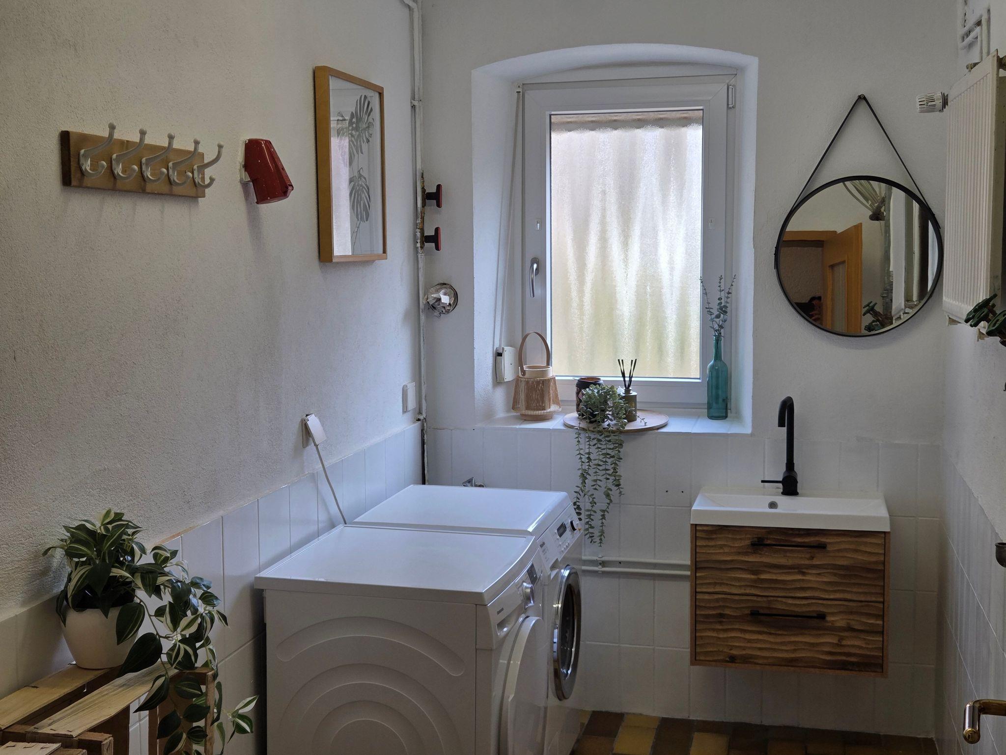 In einem weiteren Raum befindet sich die Waschmaschine, der Trockner, sowie ein weiteres Waschbecken.