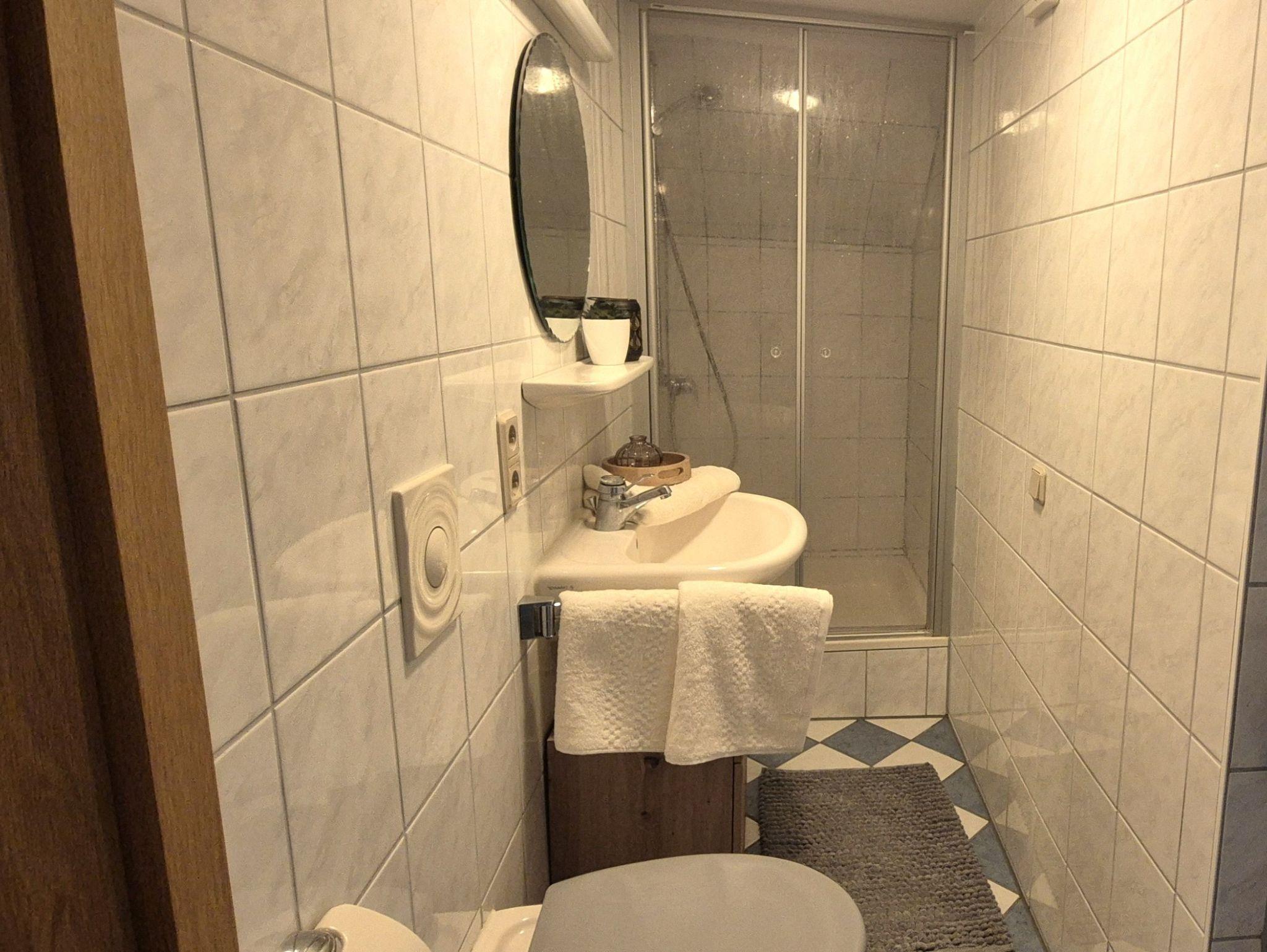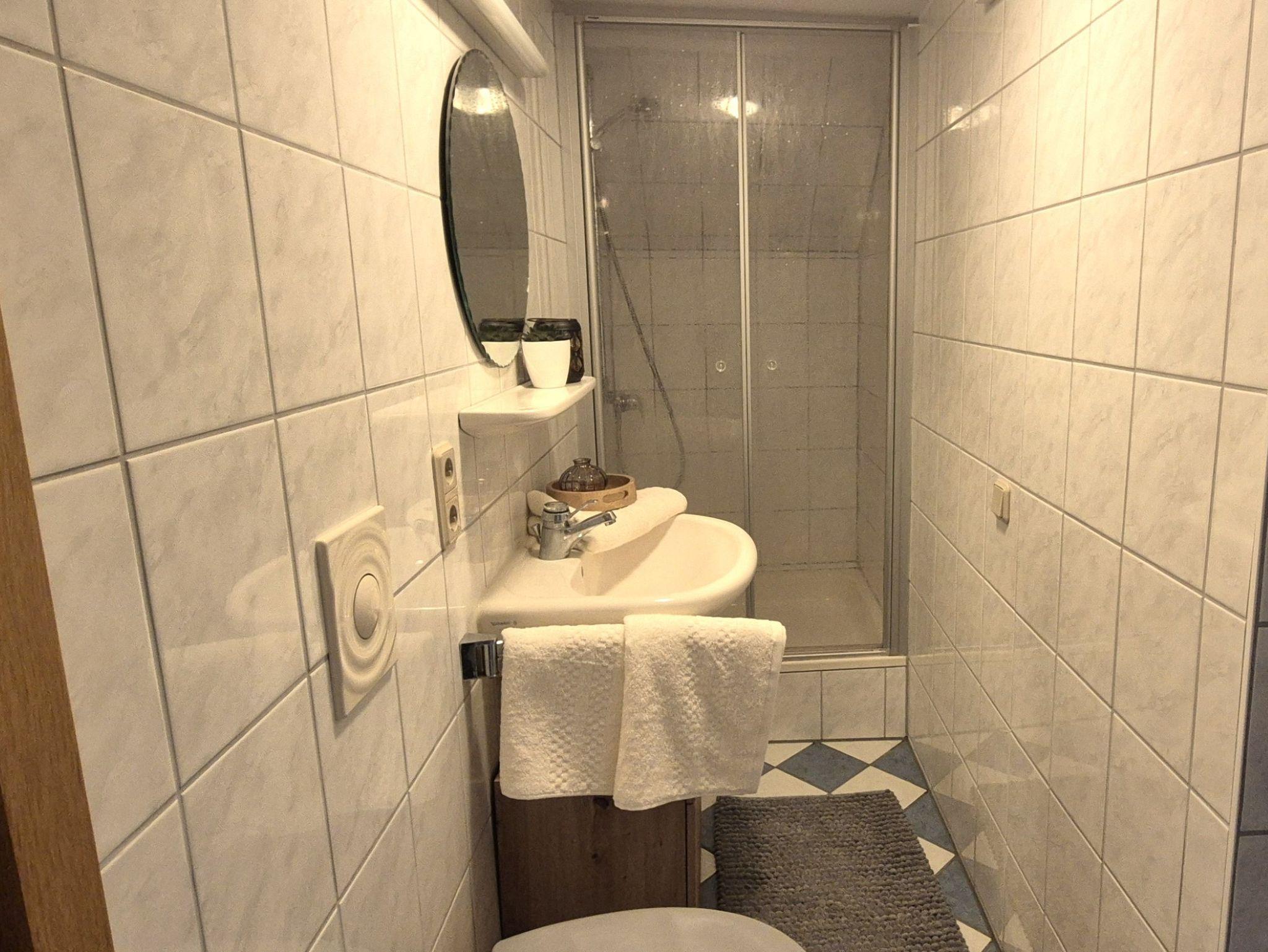 Ein kleines Badezimmer mit Dusche und WC befindet sich ebenfalls im Obergeschoss.