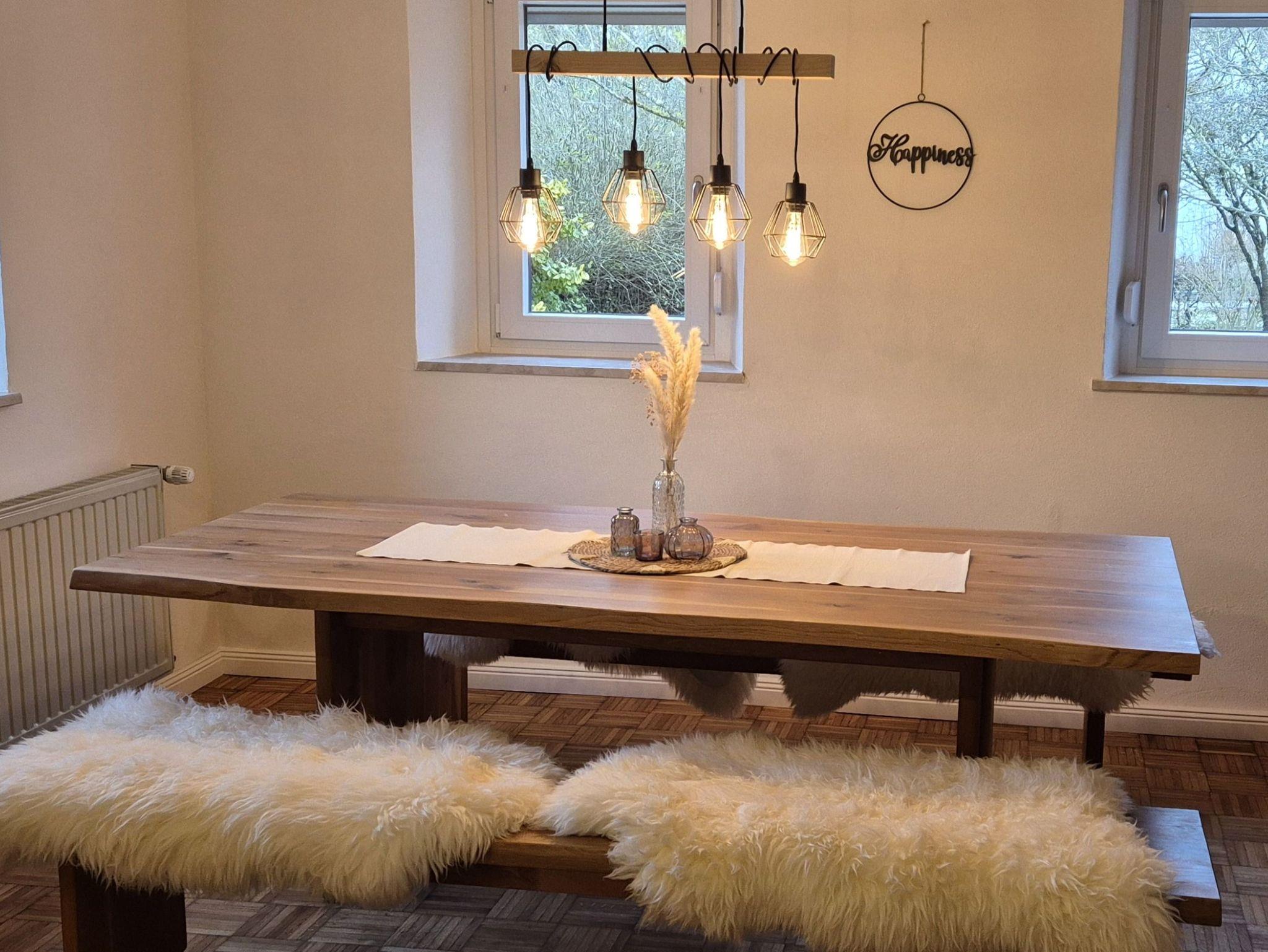 Das großzügige Wohnzimmer bietet einen großen Essplatz für alle, eine Couchecke, sowie einen Leseschaukelstuhl vor dem Schwedenofen.