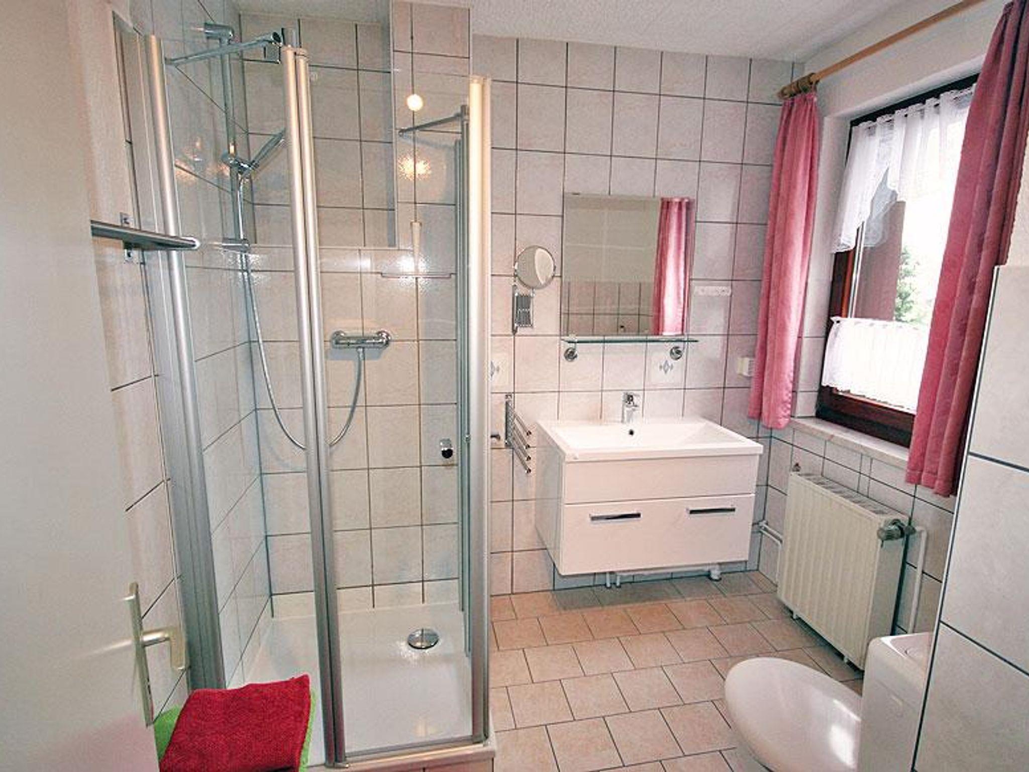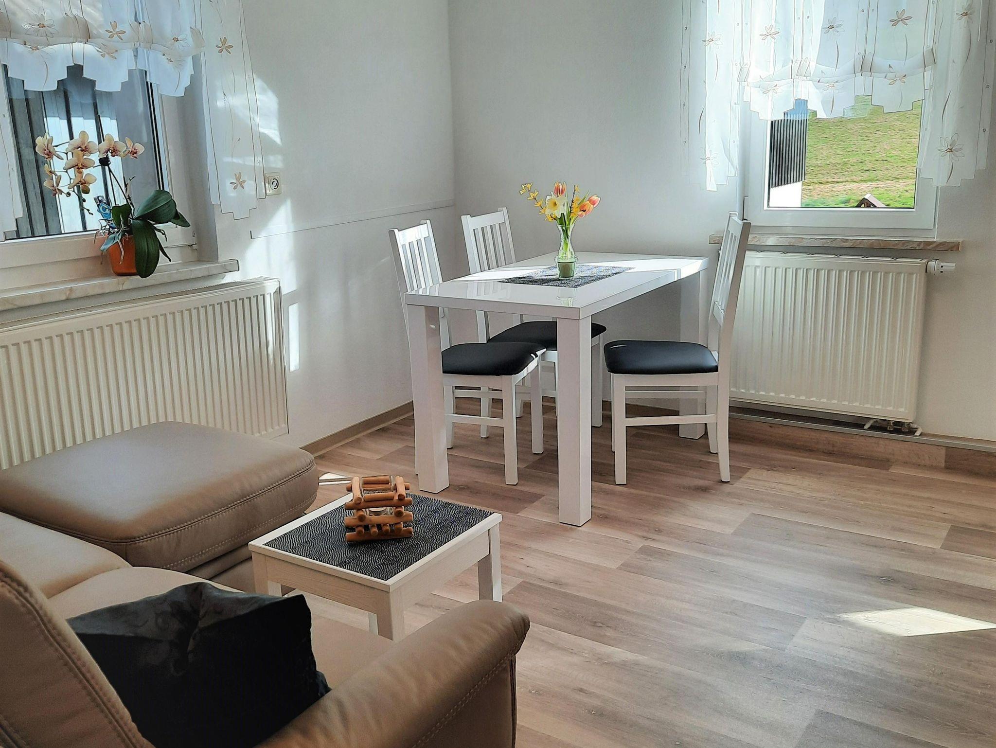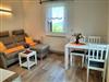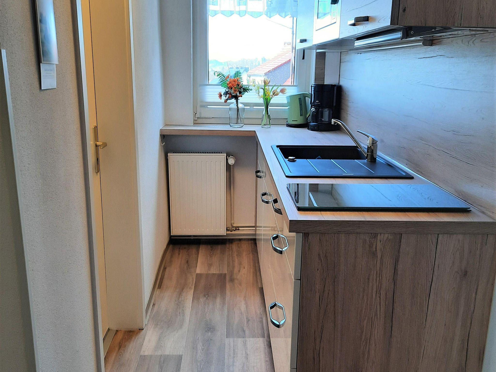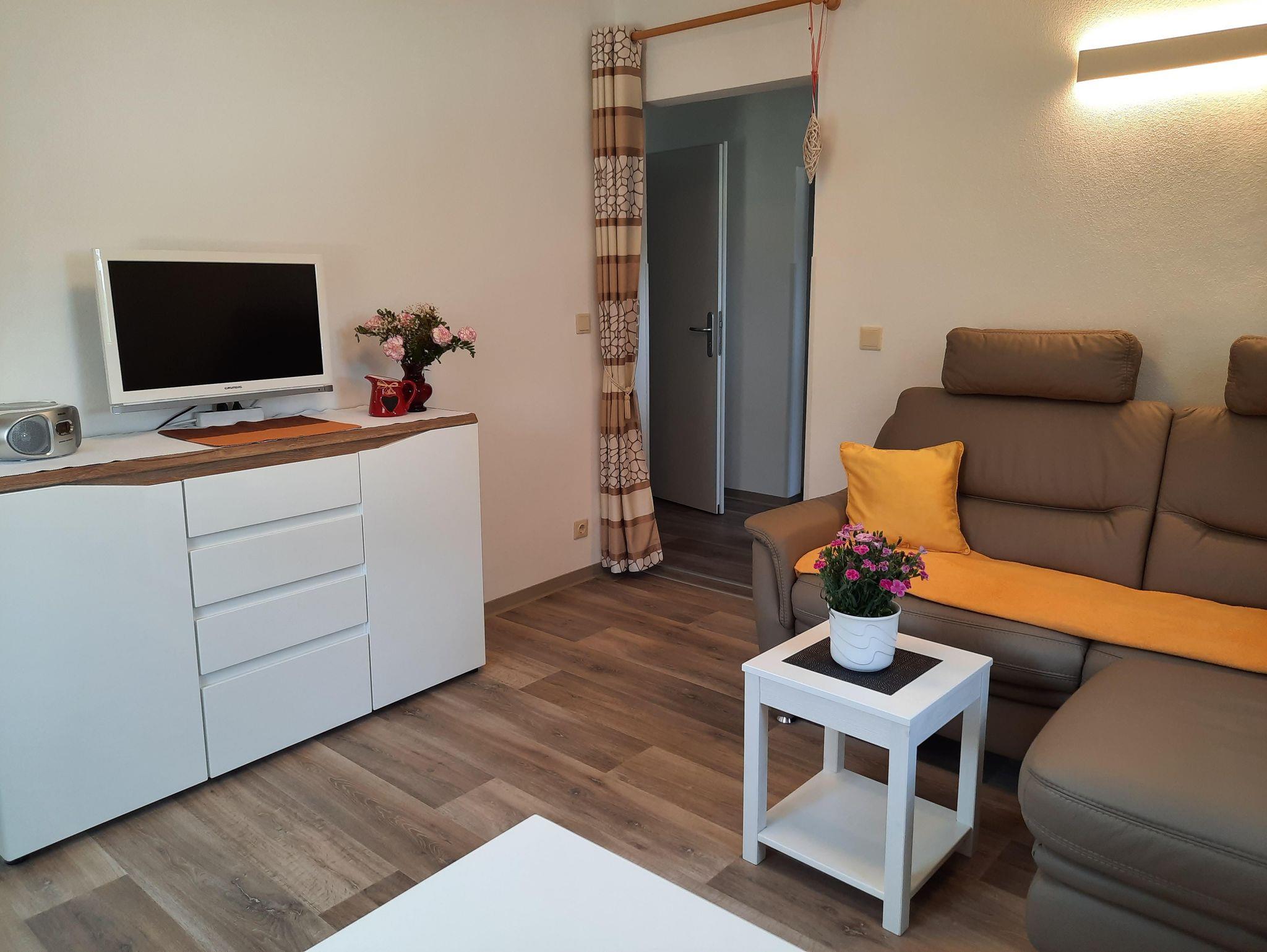 Die Ferienwohnung im Obergeschoss mit einem Schlafraum, der mit Doppelbett (180 cm x 200 cm) und einer Schlafcouch eingerichtet ist. Im Wohnraum steht eine gemütliche Couch , Flachbild TV, Radio und ein Essplatz für 3 Personen zur Verfügung. Die hochwertige Küchenzeile ist mit Kühlschrank, Kaffeemaschine, Mikrowelle, Wasserkocher, Ceranfeld, Toaster und viel Geschirr ausgestattet. Dusche/WC mit großen Waschplatz. Außerdem ist ein kleiner Abstellraum als begehbare Garderobe nutzbar.