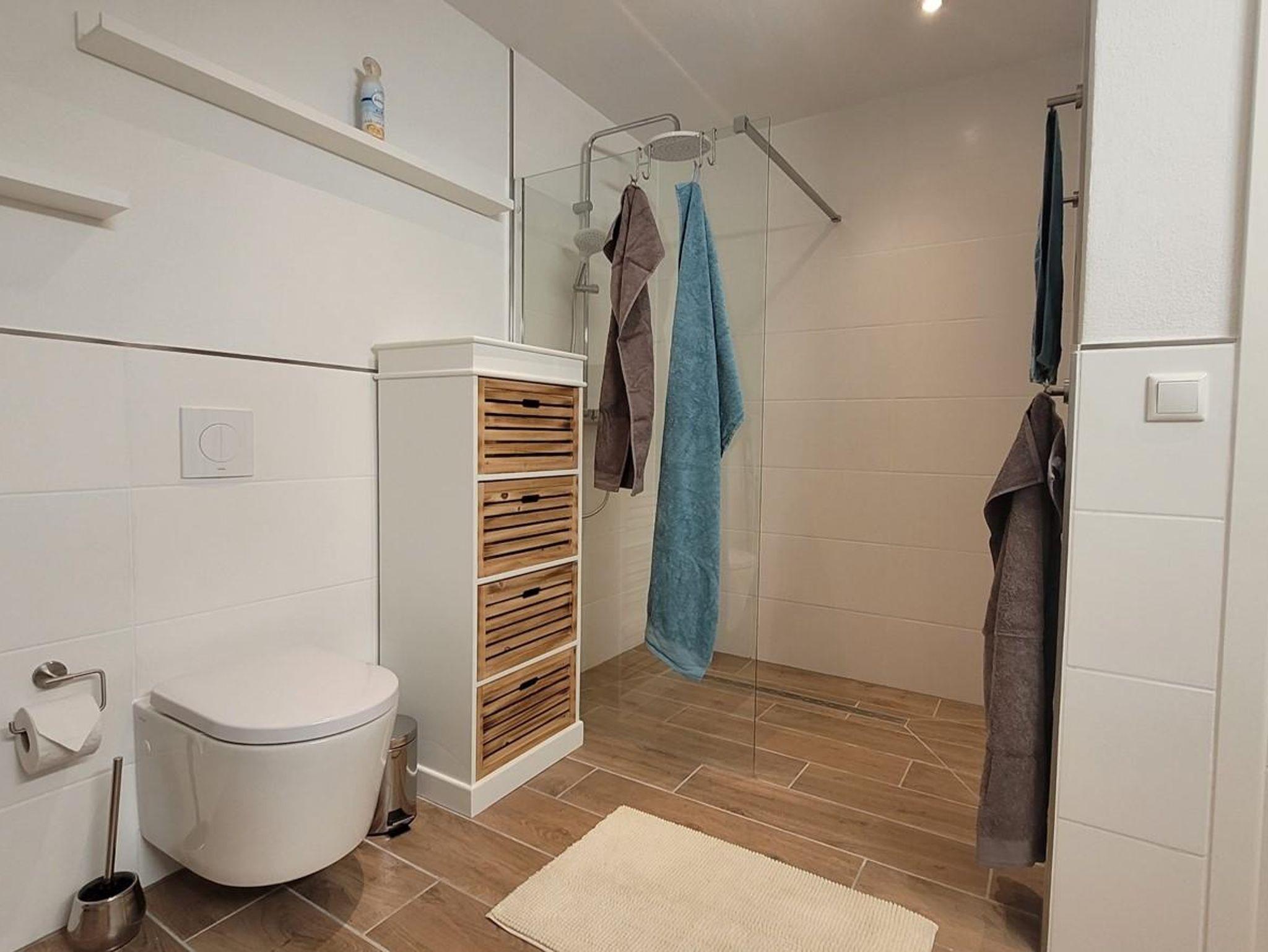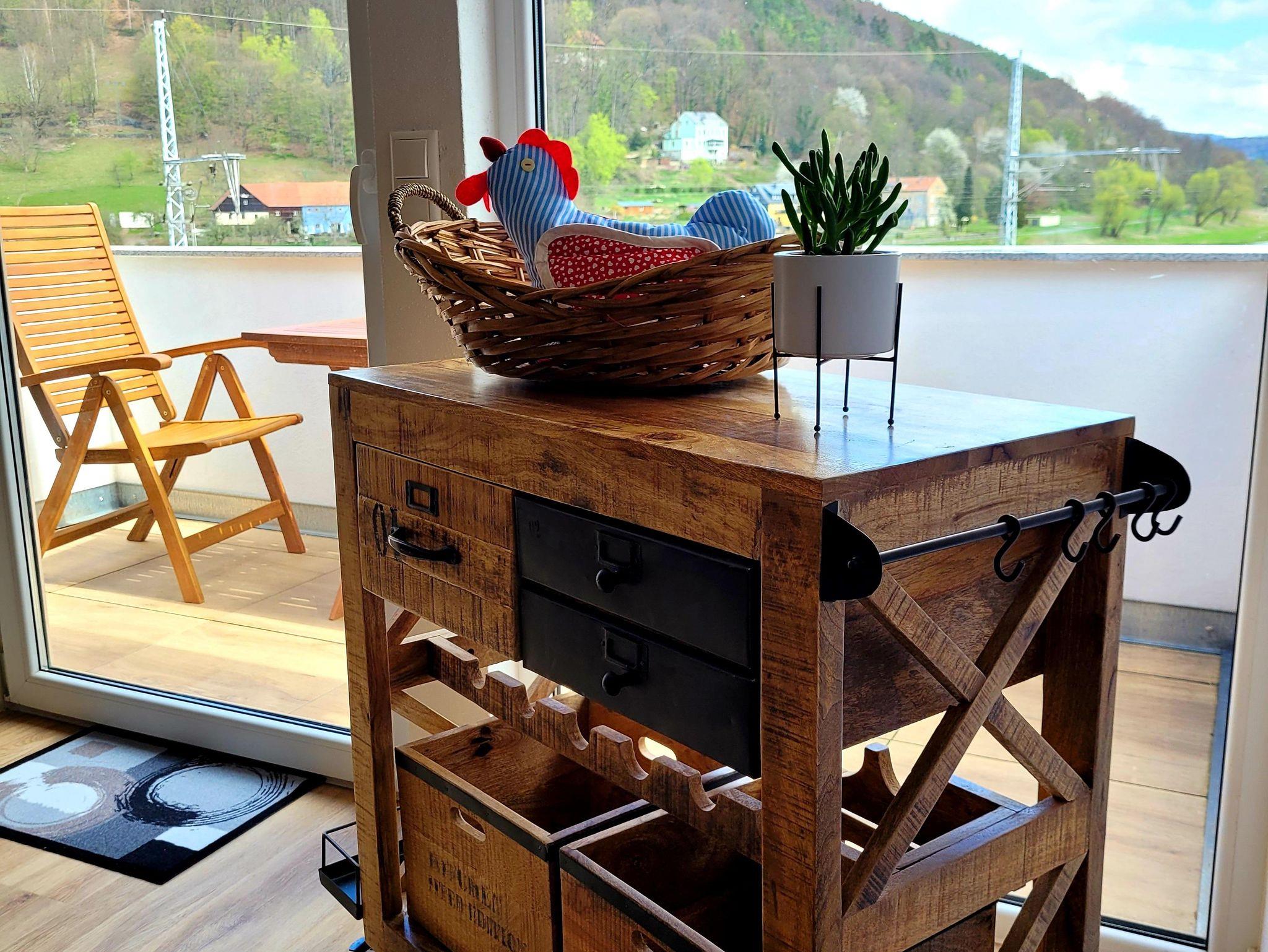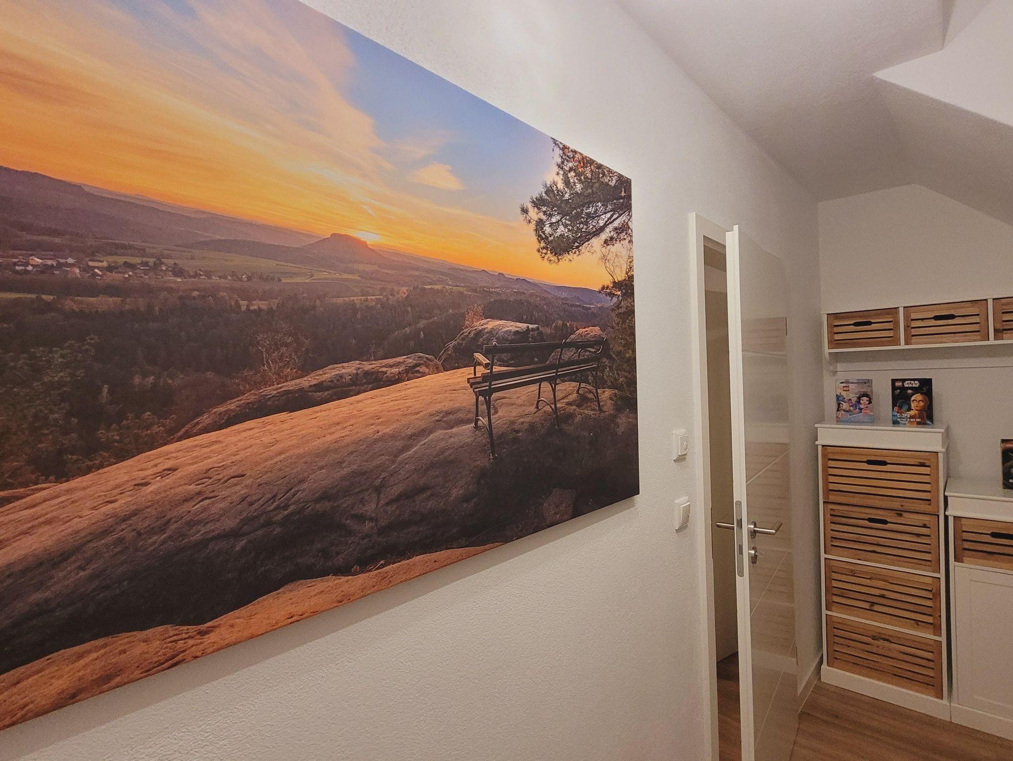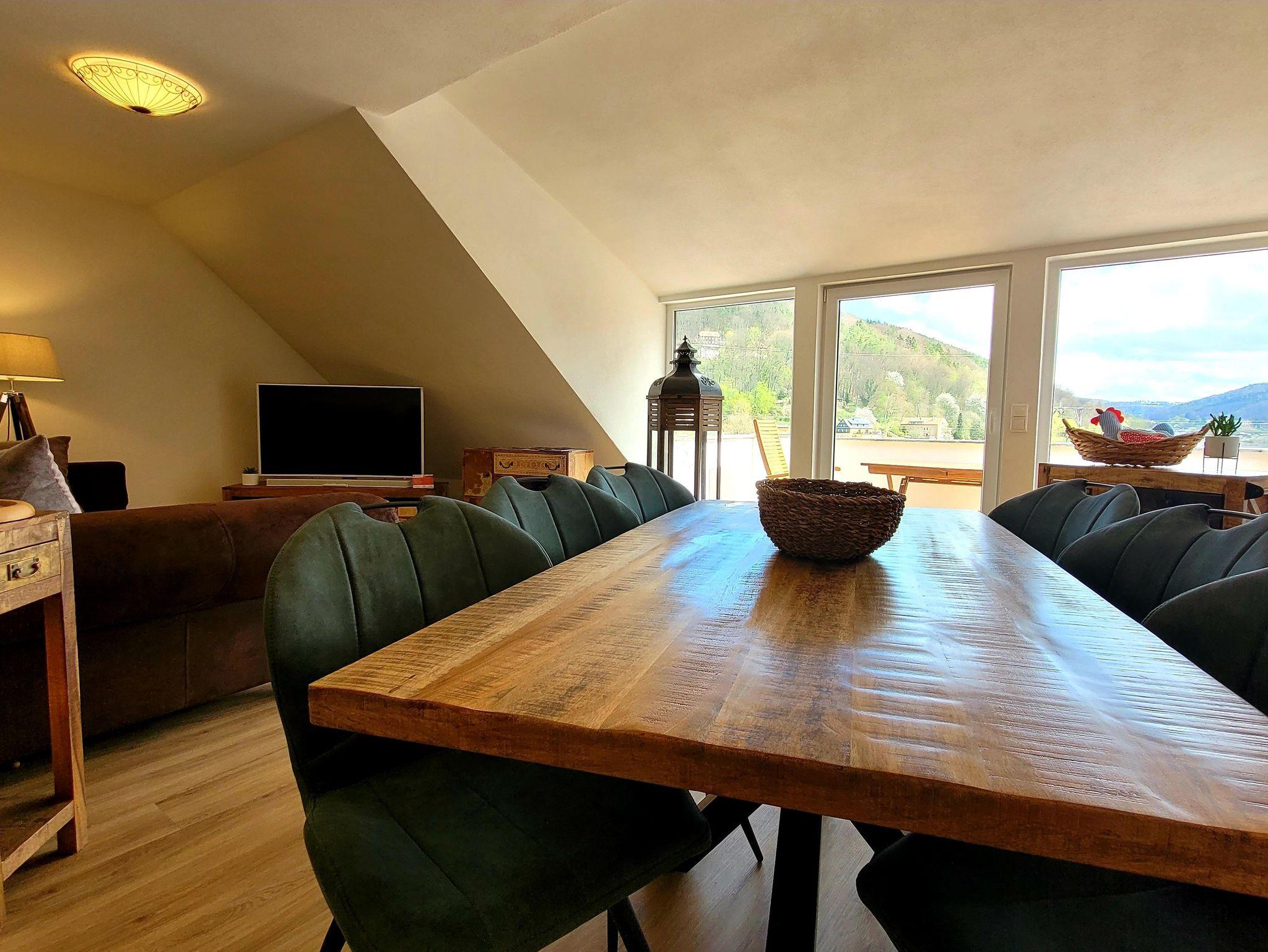 Alle Räume sind neu und hochwertig eingerichtet. In der Morgensonne auf dem Balkon können Sie das Frühstück einnehmen und den Blick ins Elbtal schweifen lassen. Ein Schlafzimmer ist mit einem Wasserbett (2m x 2,20m) und einem Schwebetürschrank ausgestattet. Im zweiten Schlafzimmer stehen zwei Einzelbetten (90cm x 2,00m) zur Verfügung. Diese können natürlich bei Bedarf gern zusammengeschoben werden können. Die offene Küche ist mit einem Cerankochfeld, Backofen, Geschirrspüler, Kaffeemaschine, Toaster, Wasserkocher, Waffelautomat und anderen Dingen ausgestattet. Ein großer moderner Esstisch bietet allen Gästen genügend Platz und ermöglicht einen gemütlichen Ausklang des Tages beim gemeinsamen Abenddinner oder einem Spieleabend. Im angrenzenden Wohnbereich können Sie dann am Abend auf der großzügigen und gemütlichen Echtledercouch entspannen. Und mit einem Glas Wein vor einem großen Curved-TV Kraft für den nächsten Tag schöpfen. Das geräumige Bad mit ebenerdigen Dusche rundet das Ambiente ab. Alle Zimmer sind mit Fußbodenheizung ausgestattet.