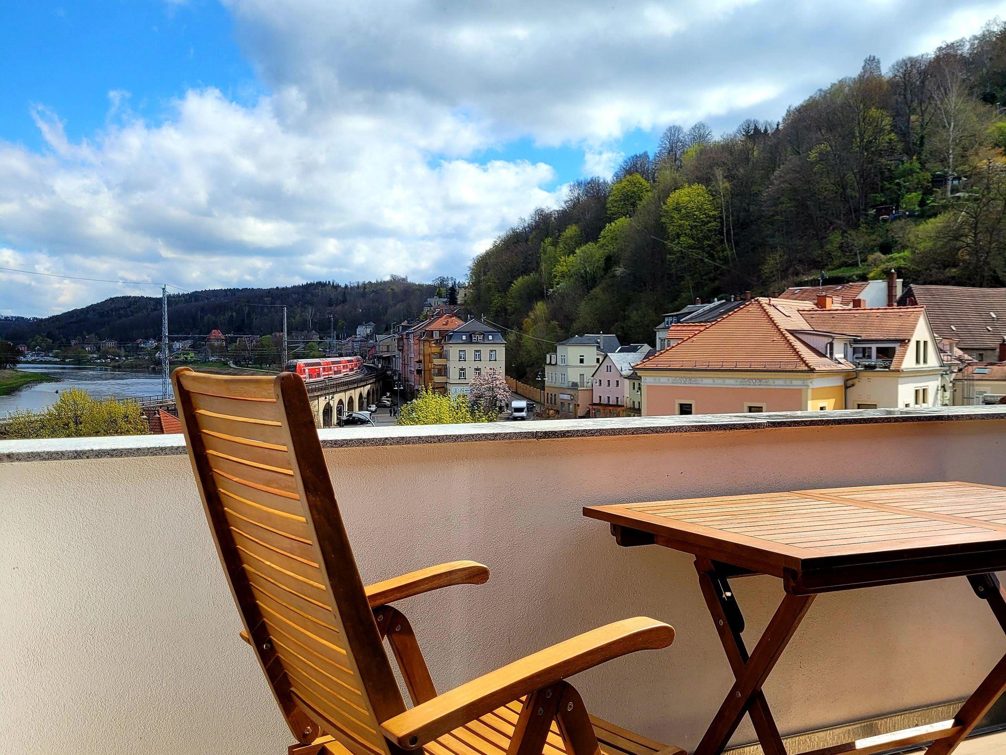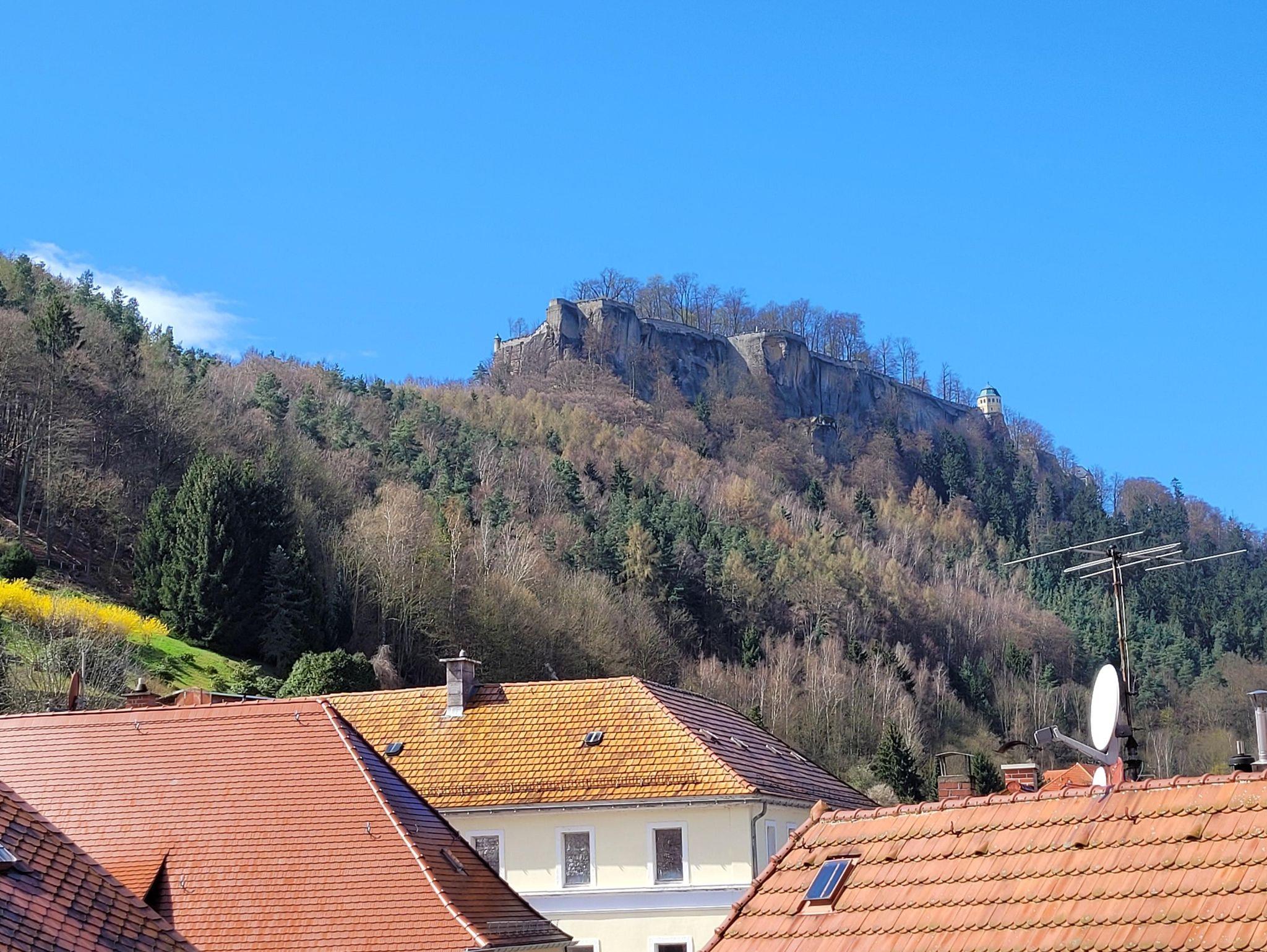 Im Herzen der Sächsischen Schweiz bieten wir bis zu 4 Personen (bei Bedarf +1 Babybett) die Möglichkeit erlebnisreiche Tage oder einen erholsamen Urlaub zu erleben. Selbst das Treppensteigen kann bis auf 5 Stufen zum Fahrstuhl entfallen. Mit ihm erreichen sie ohne Anstrengung unsere Ferienwohnung im Dachgeschoss. Mit den beeindruckenden Aussichten auf die Festung Königstein, die Elbe und den Lilienstein, spüren Sie ihren wohlverdienten Urlaub. Der Lilienstein (415m ü. NN) auf der anderen Elbseite erscheint in greifbarer Nähe und kann mit einer Überfahrt per Fähre und 260 m zu Fuß bergauf erklommen werden. Sie haben die Möglichkeit autofrei aber trotzdem bequem mit öffentlichen Verkehrsmitteln viele Ausflugsziele und Sehenswürdigkeiten zu erreichen. Bushaltestelle oder Bahnhof sind fußläufig zu erreichenden. Empfehlenswert sind die bekannten Städte Dresden, Meißen, Pirna oder Prag. So können Sie auch die immer noch historischen Ansichten, die von Canalettos Gemälden bekannt sind, bewundern. Zum Beispiel in Pirna den Blick „DER MARKTPLATZ ZU PIRNA“, und in Dresden natürlich den bekannten „CANALETTO BLICK“. Möchten Sie ein Fahrrad leihen, kann es im Fahrradgeschäft gleich im Gebäude nebenan gebucht werden. Nach einem anstrengenden Tag können Sie sich dann im empfehlenswerten Kaffee um die Ecke mit einem leckeren Eisbecher belohnen. Für die kleinen und großen Gäste gibt es in der Umgebung zahlreiche Ausflugsziele zu entdecken. So startet zum Beispiel mehrmals täglich der „Festungskraxler“ zur Festung Königstein. Das für Kinder sehr erlebenswerte „Felsenlabyrinth Langenhennersdorf“ ist allerdings nur mit dem Auto erreichbar.