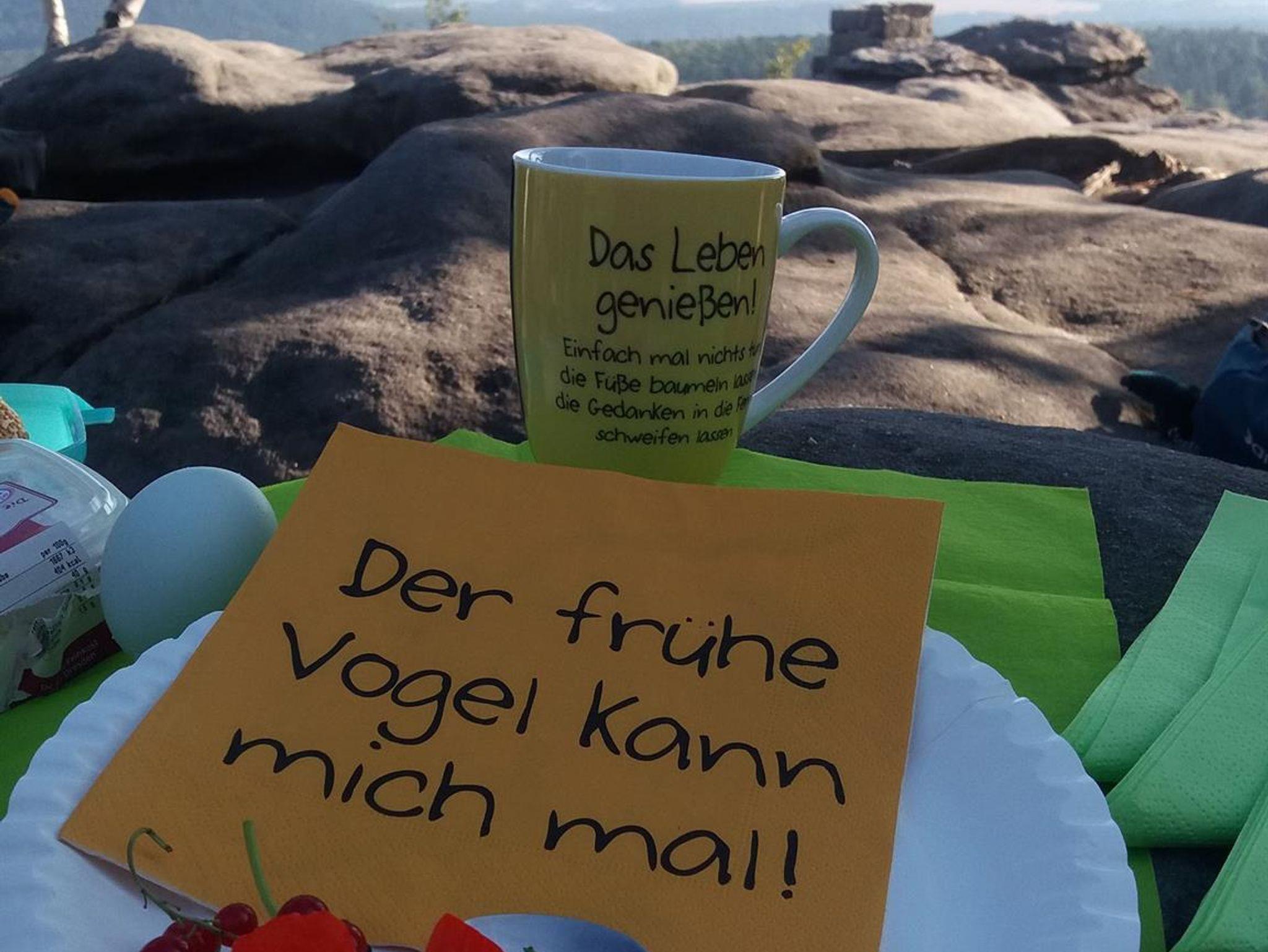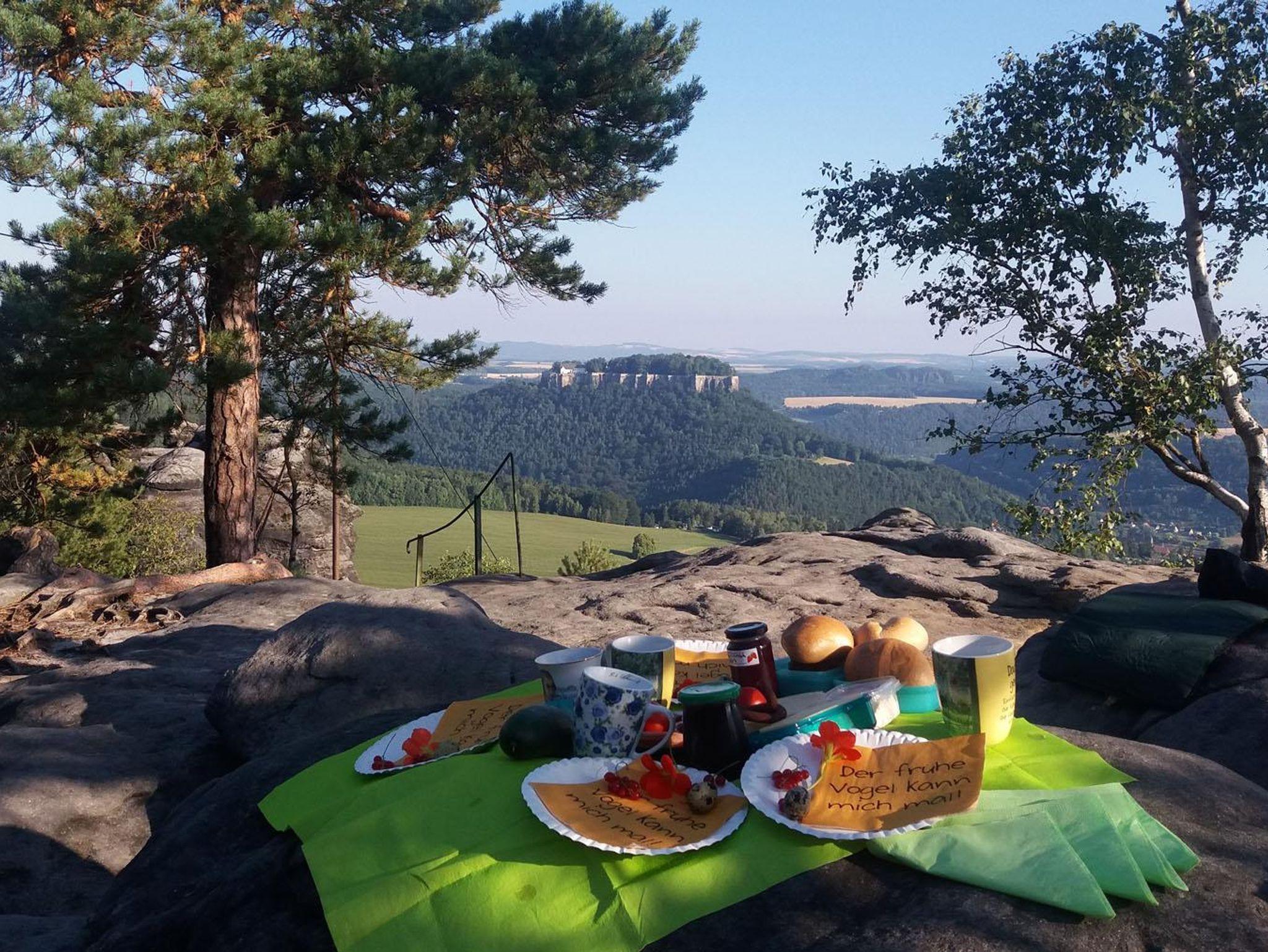 Gern organisieren wir für Sie ein Frühstück auf dem Pfaffenstein mit Blick zur Festung Königstein oder auf den Lilienstein.