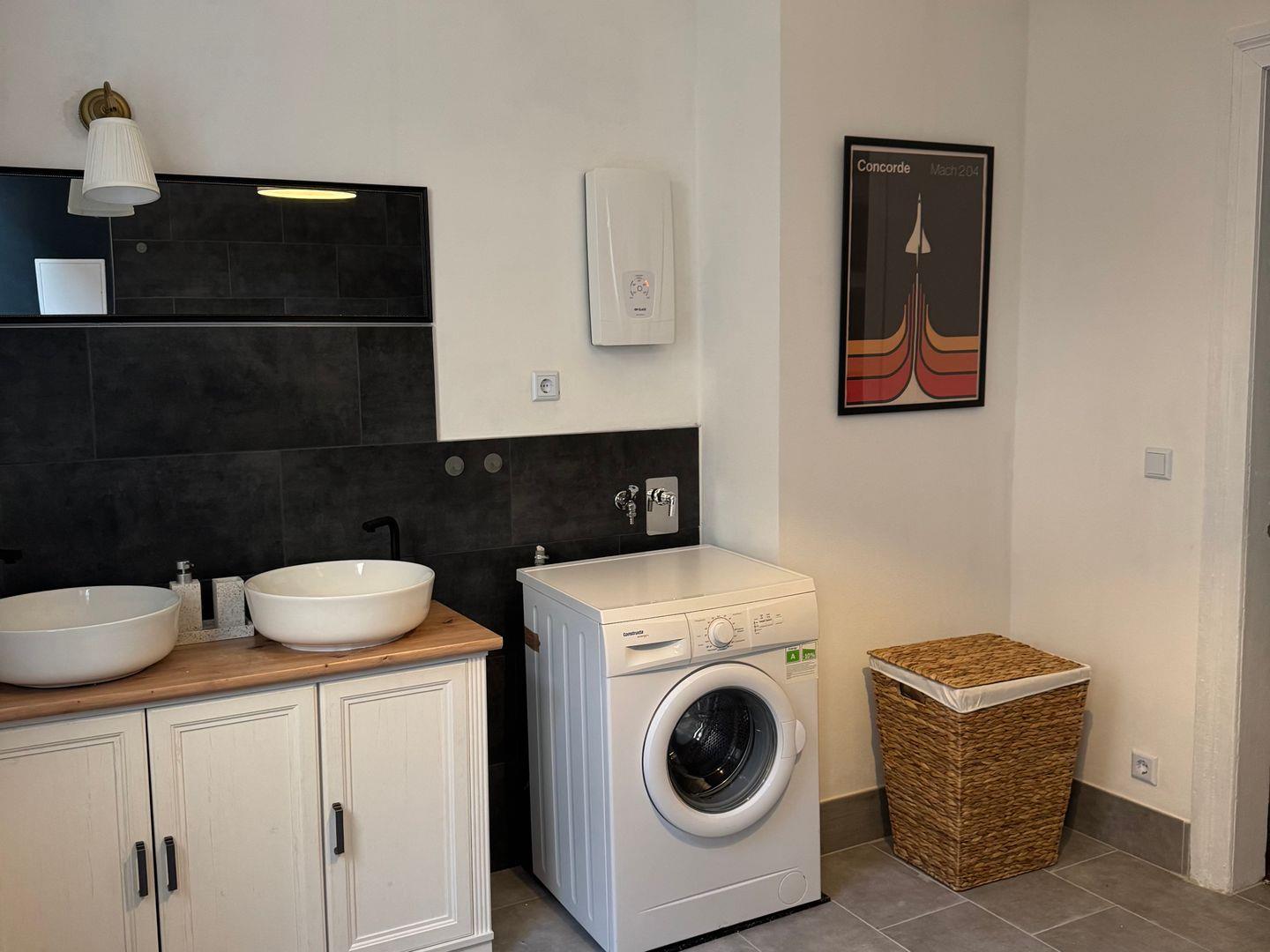 Die moderne, geschlossene Küche ist mit allem ausgestattet, was Ihren Aufenthalt angenehm gestaltet: ein Herd, ein Backofen mit Elektroanschluss, sowie ein großer Kühlschrank stehen zur Verfügung. Darüber hinaus sind Wasserkocher, Kaffeemaschine, Toaster, ausreichend Geschirr, Besteck und Küchenutensilien vorhanden. Für längere Aufenthalte oder Familien mit kleinen Kindern wird auch eine Waschmaschine zur Eigennutzung bereitgestellt, ergänzt durch einen Wäscheständer.