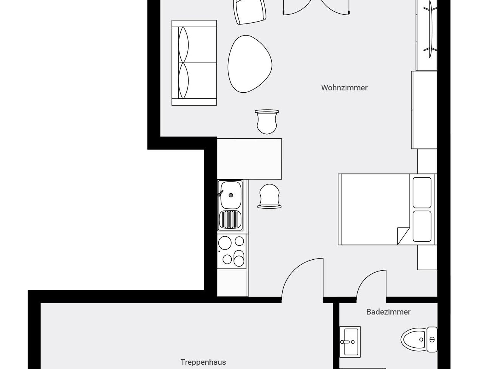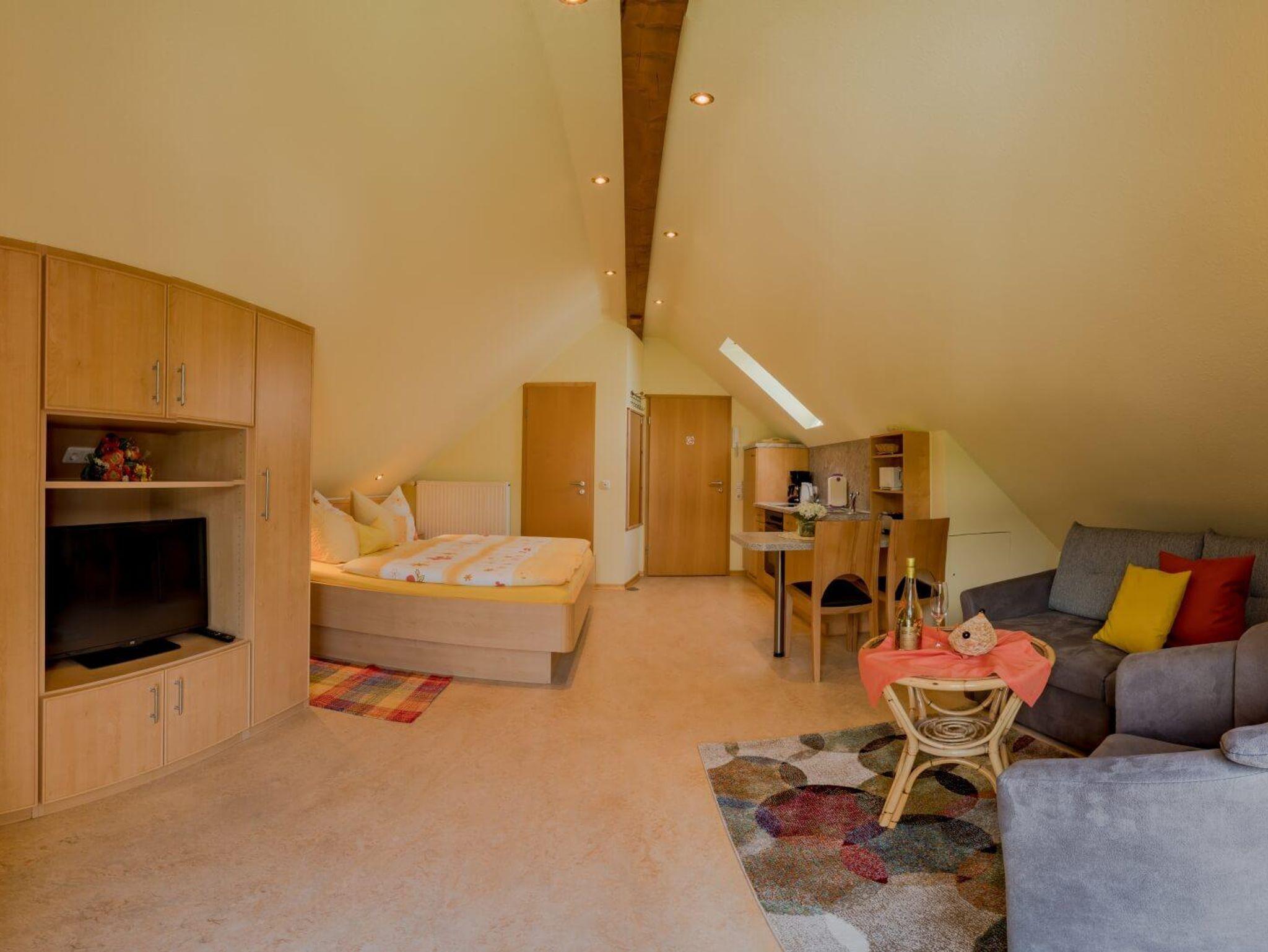 1-Zimmer-Appartment mit moderner Einbaküche, Wohnecke und Schlafnische mit Doppelbett, SAT-TV, Radio, Balkon. Haustiere nur auf Anfrage, Aufpreis pro Tag 10 €.