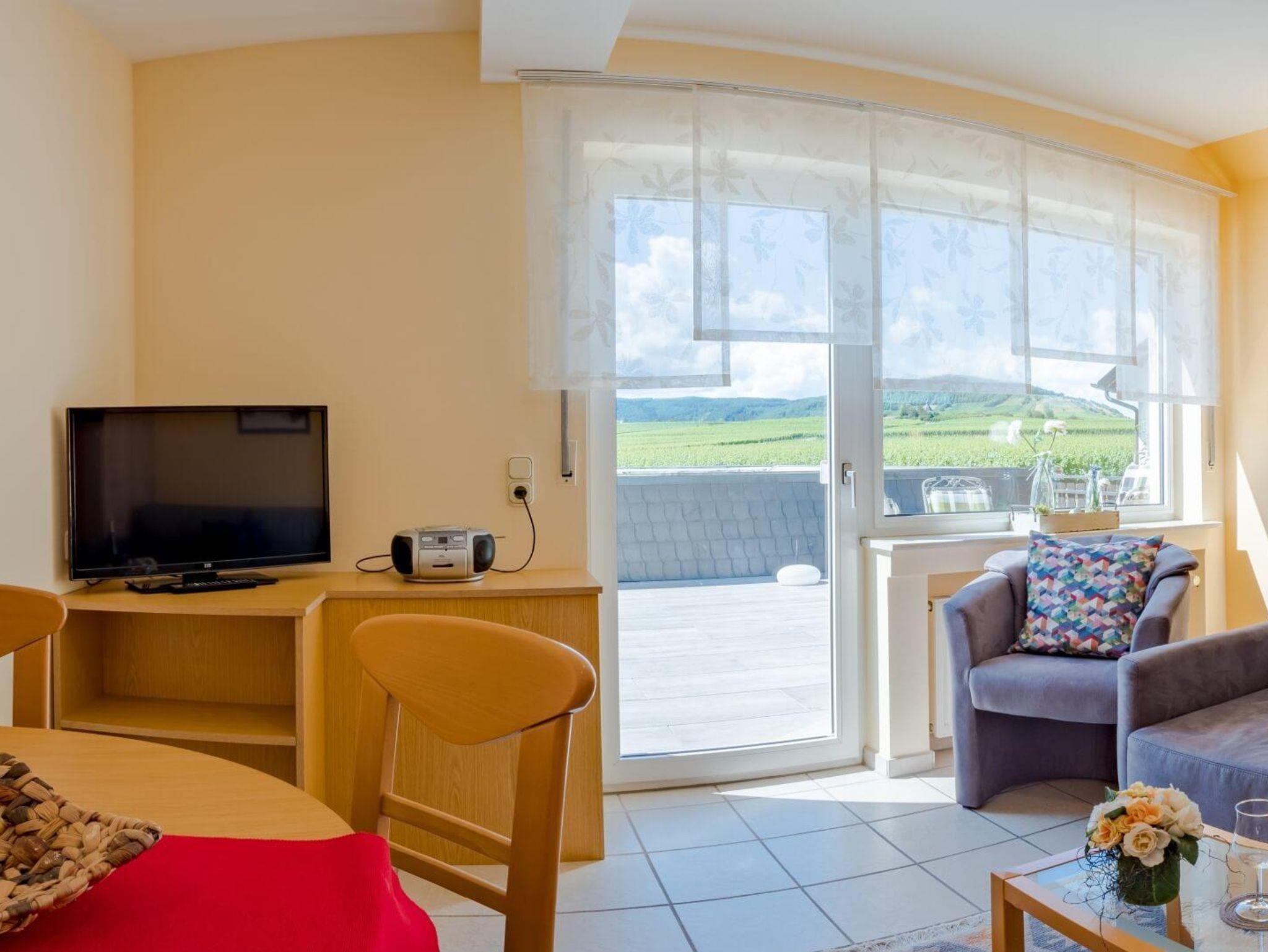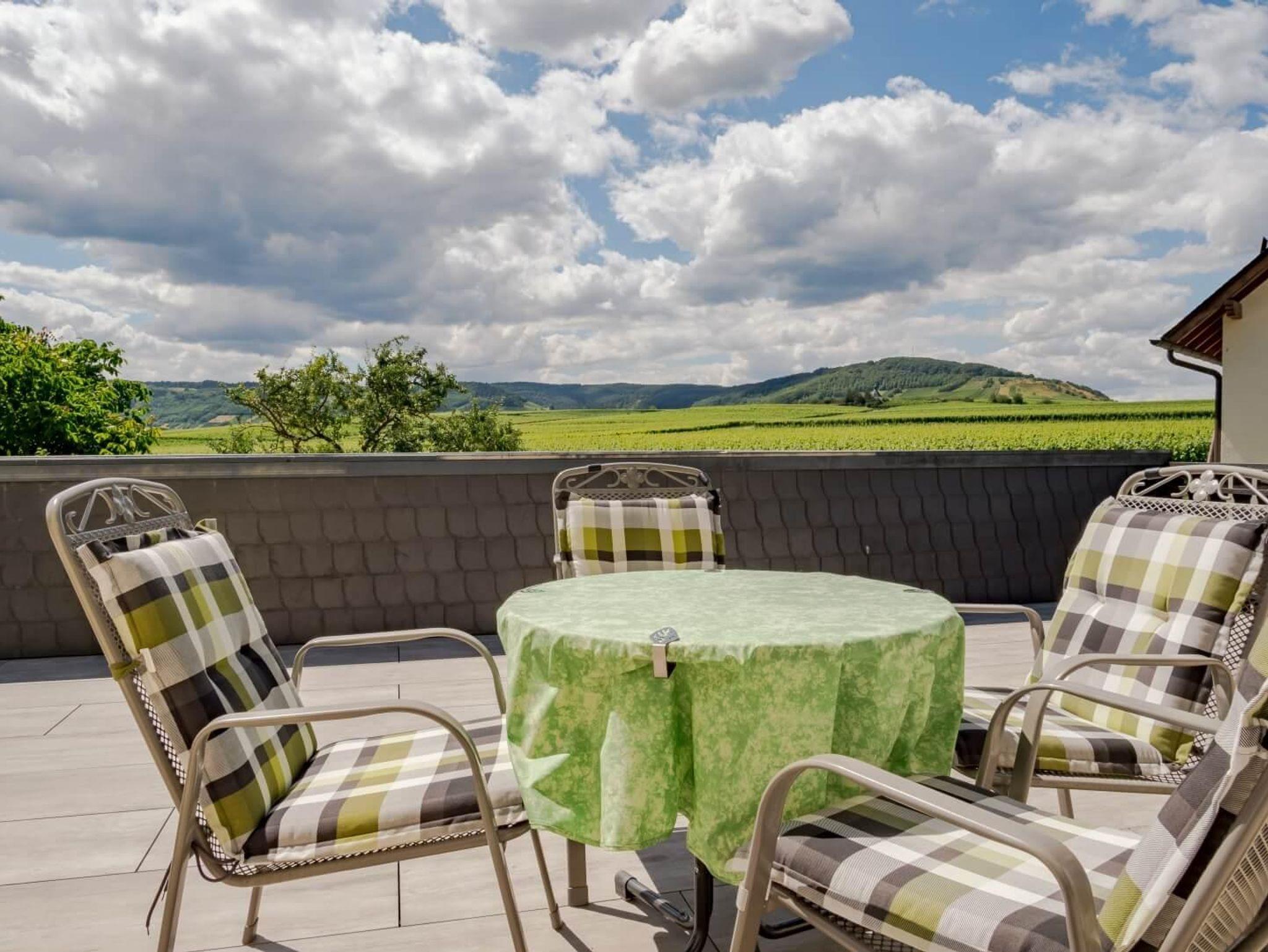 Neun komfortable, mit viel Liebe zum Detail eingerichtete Ferienwohnungen und ein gemütliches Weinstübchen zum geselligen Beisammensein, stehen auf unserem fämiliär geführten Ferienweingut für Sie bereit. Die Küchen in unseren Ferienwohnung sind komplett ausgestattet. Von unserem Haus bzw. Balkons haben Sie eine herrliche Aussicht auf das Moseltal. Für alle Gäste steht eine gemütliche Sitzecke im Freien, eine große Liegewiese, Kinderspielplatz und Parkplatz direkt am Haus zur Verfgügung. Jeden Morgen frische Brötchen vom Bäcker. Eine Betriebsbesichtigung unseres Weingutes mit Umtrunk in unserem gemütlichen Weinstübchen gehört zum Service unseres Hauses.