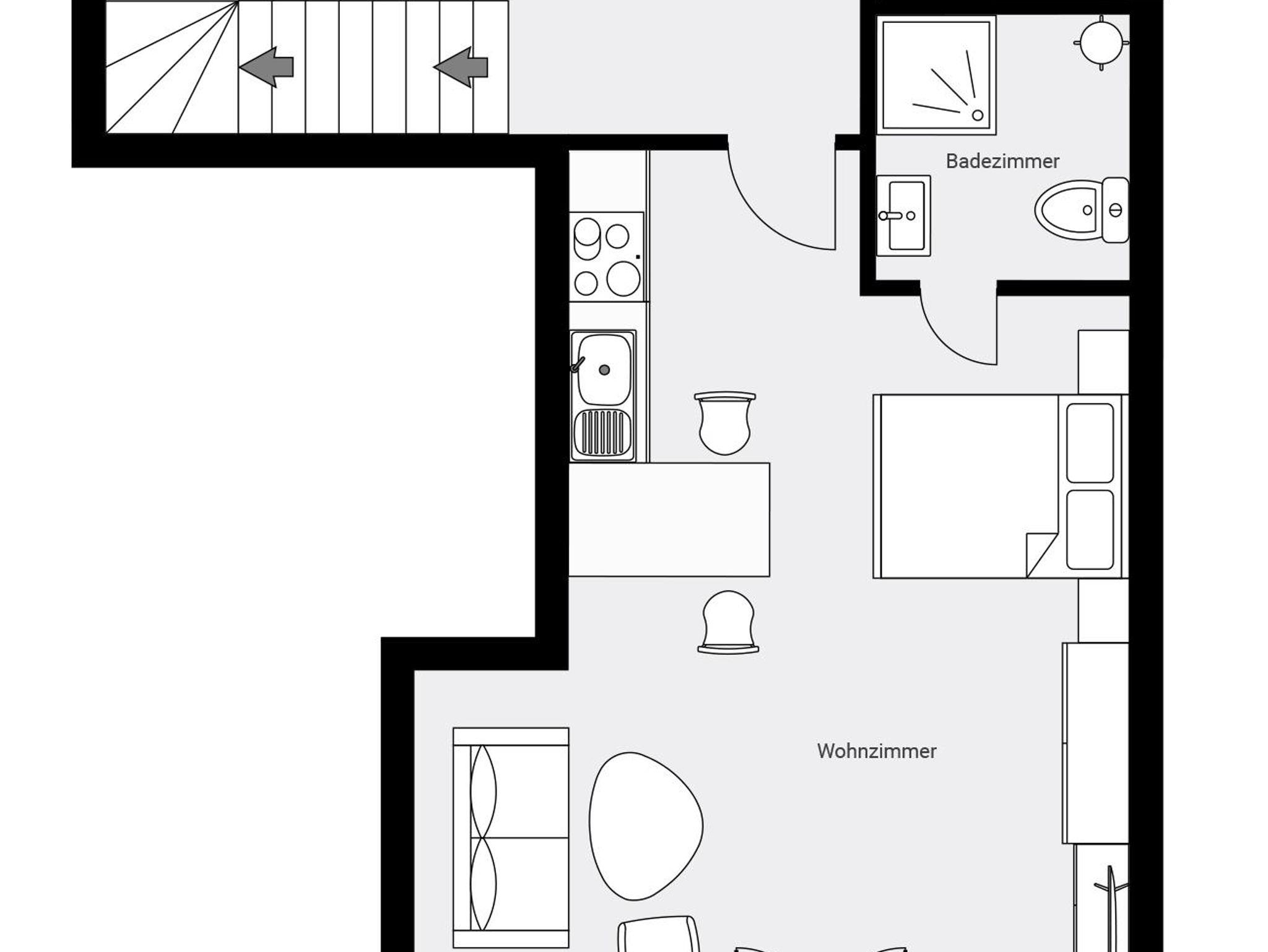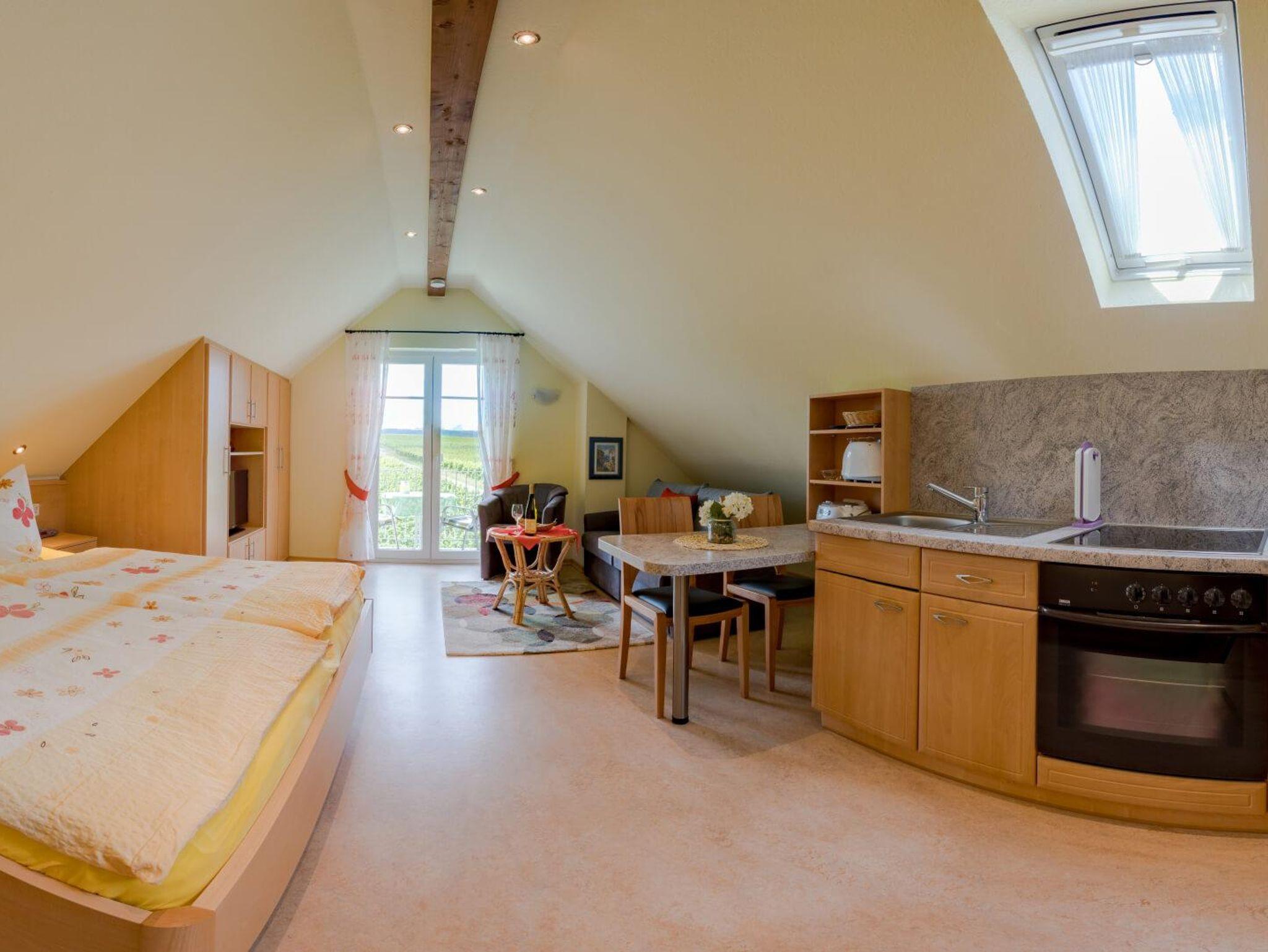 1-Zimmer-Appartment mit moderner Einbauküche, Wohnecke und Schlafnische mit Doppelbett, SAT-TV, Radio, Balkon. Haustiere nur auf Anfrage, Aufpreis pro Tag 10 €.