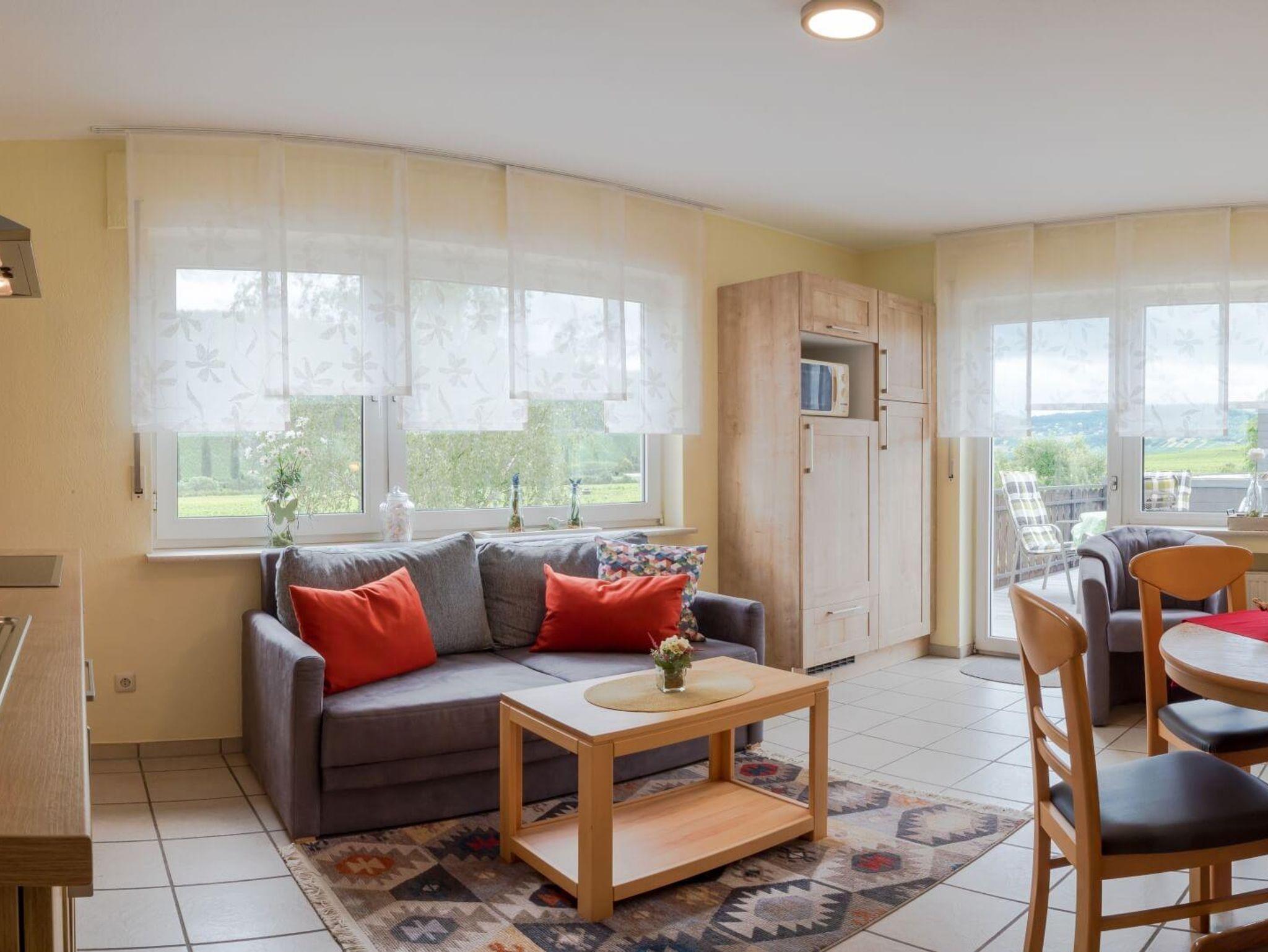 Neun komfortable, mit viel Liebe zum Detail eingerichtete Ferienwohnungen und ein gemütliches Weinstübchen zum geselligen Beisammensein, stehen auf unserem fämiliär geführten Ferienweingut für Sie bereit. Die Küchen in unseren Ferienwohnung sind komplett ausgestattet. Von unserem Haus bzw. Balkons haben Sie eine herrliche Aussicht auf das Moseltal. Für alle Gäste steht eine gemütliche Sitzecke im Freien, eine große Liegewiese, Kinderspielplatz und Parkplatz direkt am Haus zur Verfgügung. Jeden Morgen frische Brötchen vom Bäcker. Eine Betriebsbesichtigung unseres Weingutes mit Umtrunk in unserem gemütlichen Weinstübchen gehört zum Service unseres Hauses.