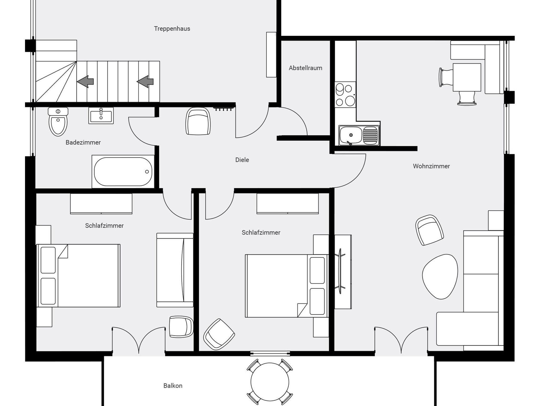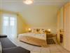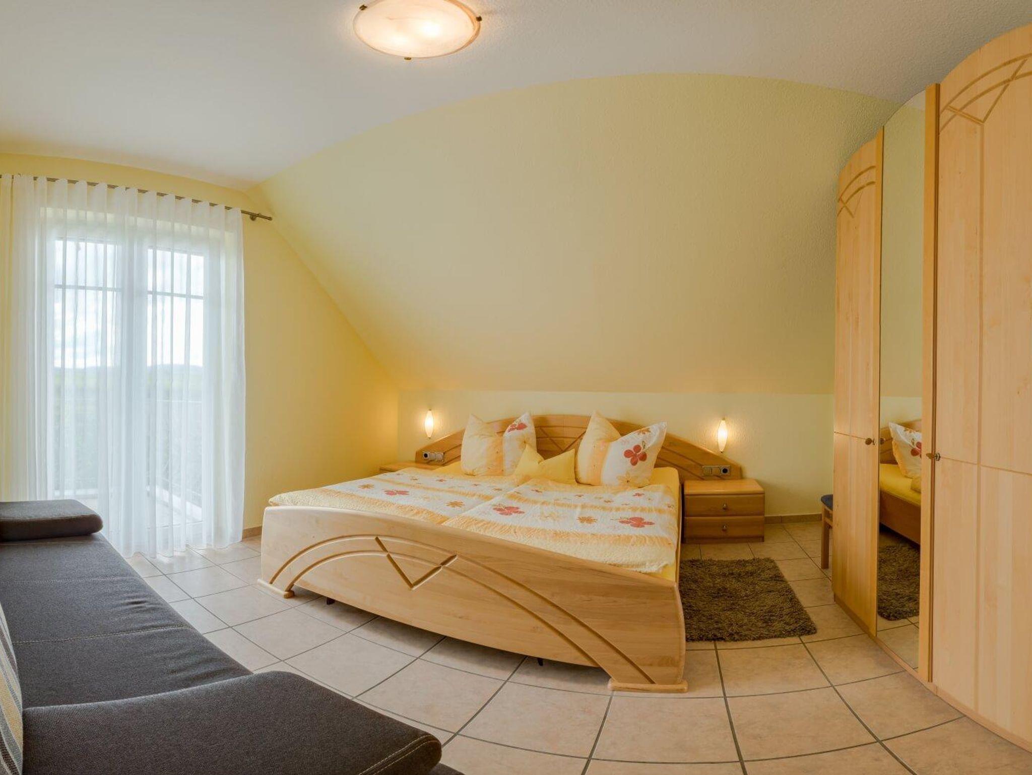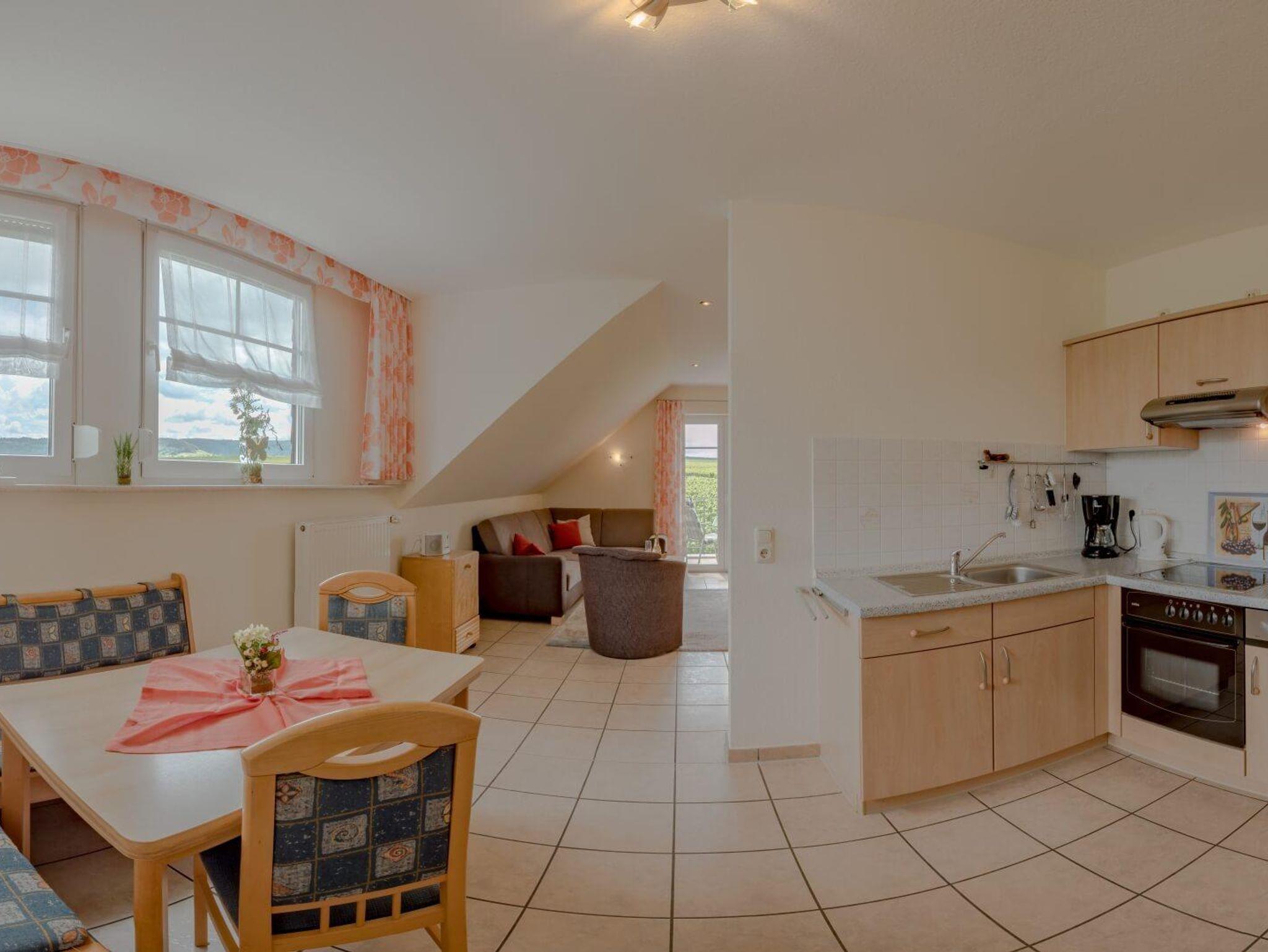 Ferienwohnung für 2-5 Personen, Wohn-Schlafraum mit abgetrennter Kochnische und Eckbankgruppe, 2 Schlafzimmer, SAT-TV, Balkon. Haustiere nur auf Anfrage, Aufpreis pro Tag 10 €.