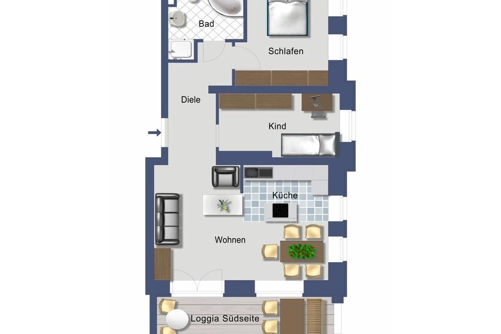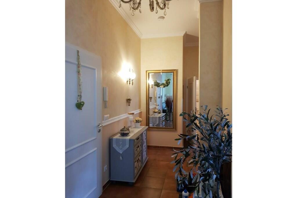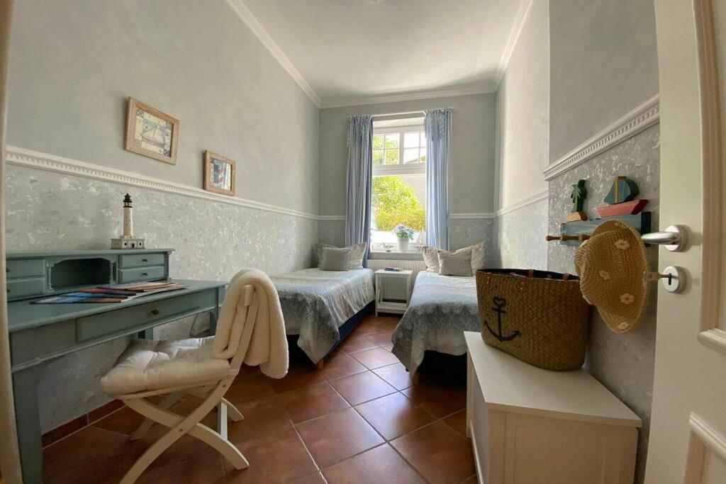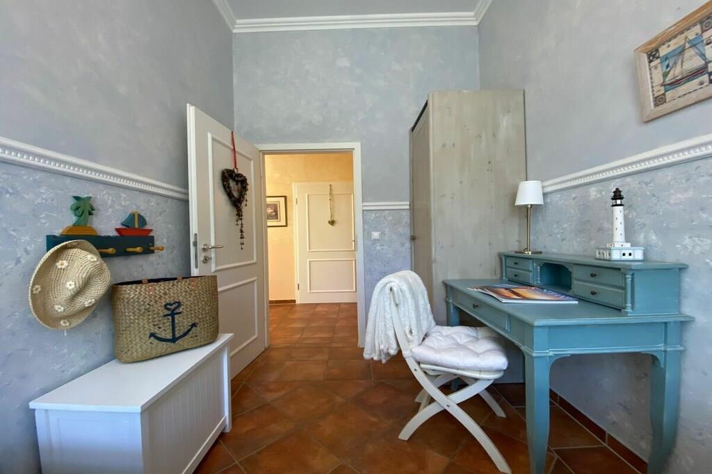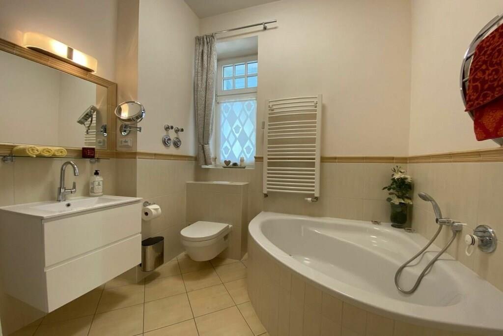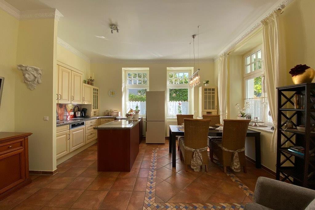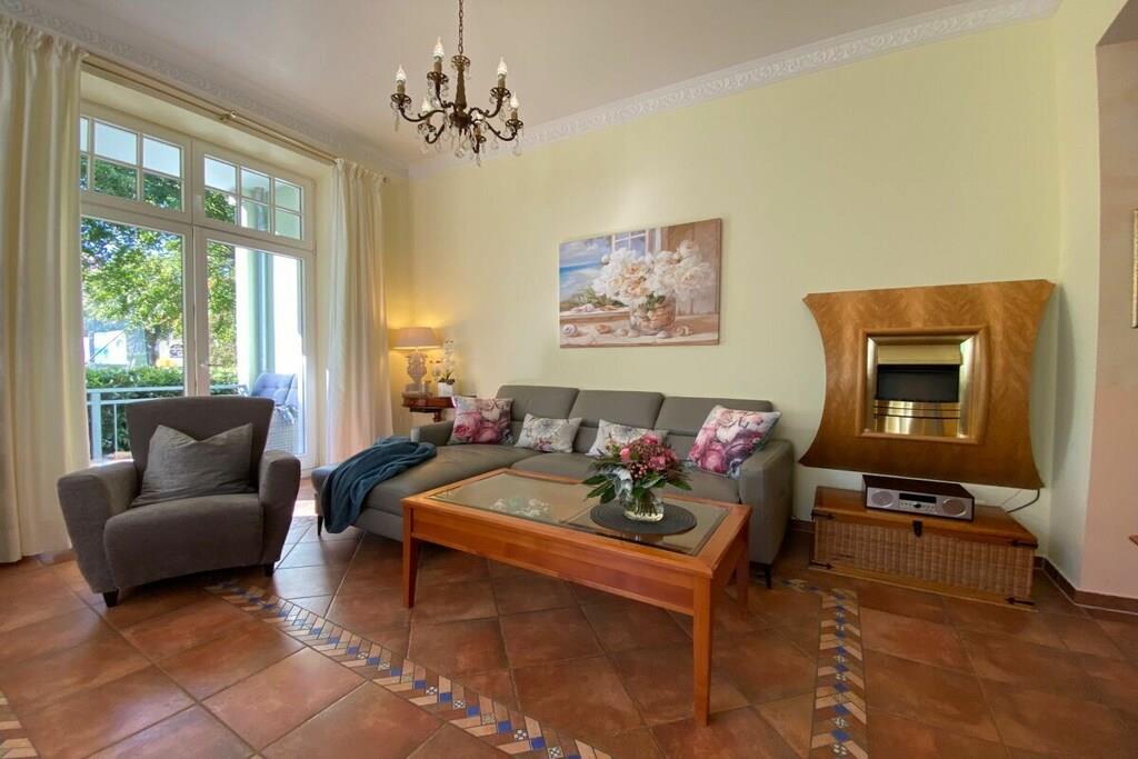 Wir setzen strenge Hygienemaßnahmen in Zeiten von Corona nach geltenden Schutz- und Hygienestandards bei der Endreinigung um. Bei können Sie sich sicher fühlen. Eine frisch in 2023 renovierte Wohlfühlfewo mit Altbau Charme, schönen Stuckdecken & modernster Technik freut sich auf Ihren Aufenthalt! Großzügige 3 Zi.-Wohnung im Hochpaterre mit sonn. WZ, bequem möbliert mit gemütlicher Couchgarnitur, Kamin, Fachbild-TV, Musikanl. superschnellem Wlan Internetzugang - gr. mediterrane Eßgruppe & off. Countryküche mit Kochinsel & edlen Granitarbeitsflächen sowie Vollausstattung! Zur WZ Südseite liegt 12 m² gr. Loggia mit mod. Sitz-/Eßmöbeln an & XL-Strandkorb! SZ I - sonnengelbes Doppel-SZ im Laura Ashley Stil sep. TV, Kommode, Kleiderschr. SZ II - maritimes Raumkonzept mit 2 Einzelbetten, Schreibtisch und Kleiderschrank. Vollbad mediterran mit Fenster, sep. Dusche, Rundeckbadewanne, Waschtisch, WC, Drehschrank, 2 gr. Spiegel;