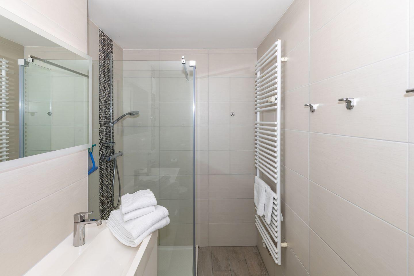 Zwei moderne Bäder mit Dusche, WC und Doppelwaschtisch bieten höchsten Komfort. Waschraum, Aufzug und Tiefgaragenstellplatz (24) stehen zur Verfügung. Bitte beachten Sie: Doppelparker mit max. 1,50 m Höhe.
