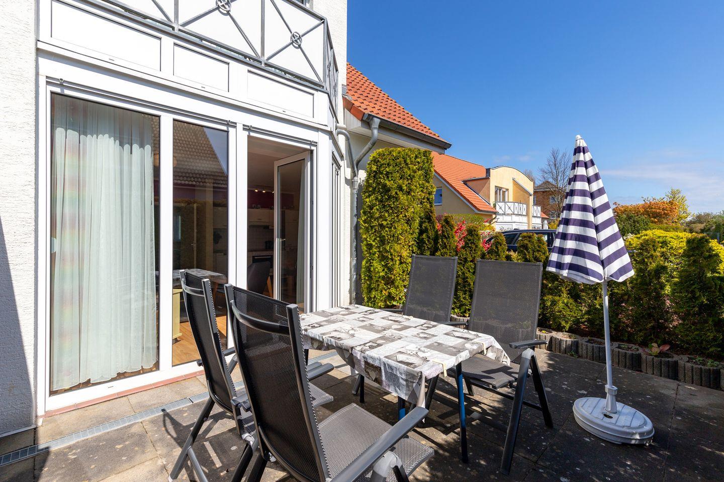 – Terrasse mit Tisch, 4 Stühlen, Sonnenschirm und Grill