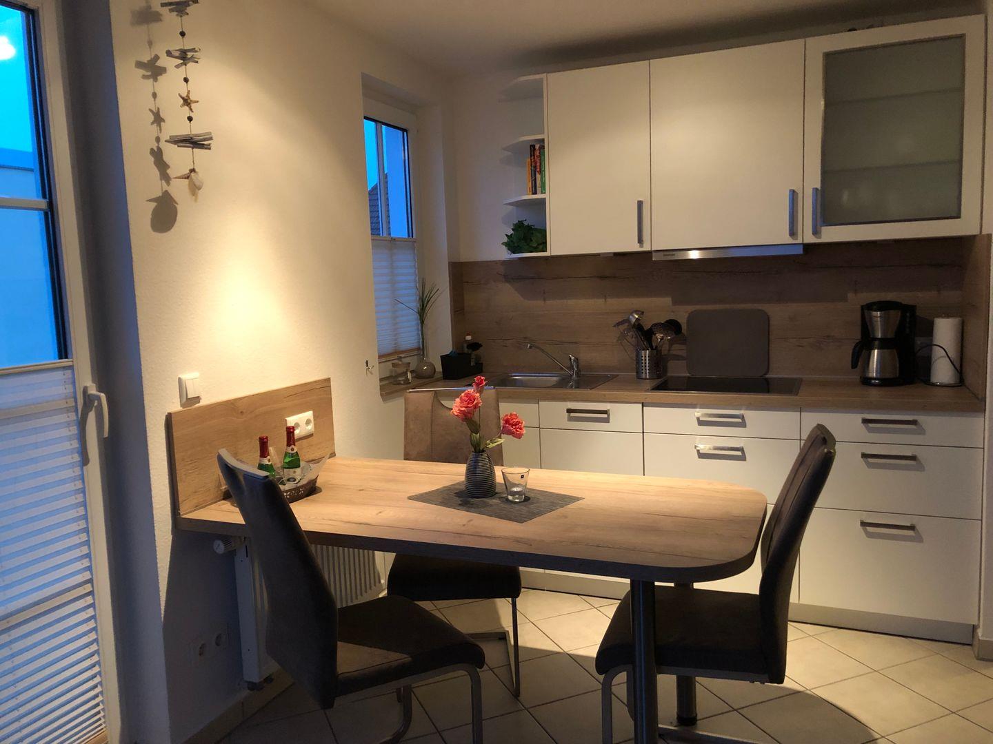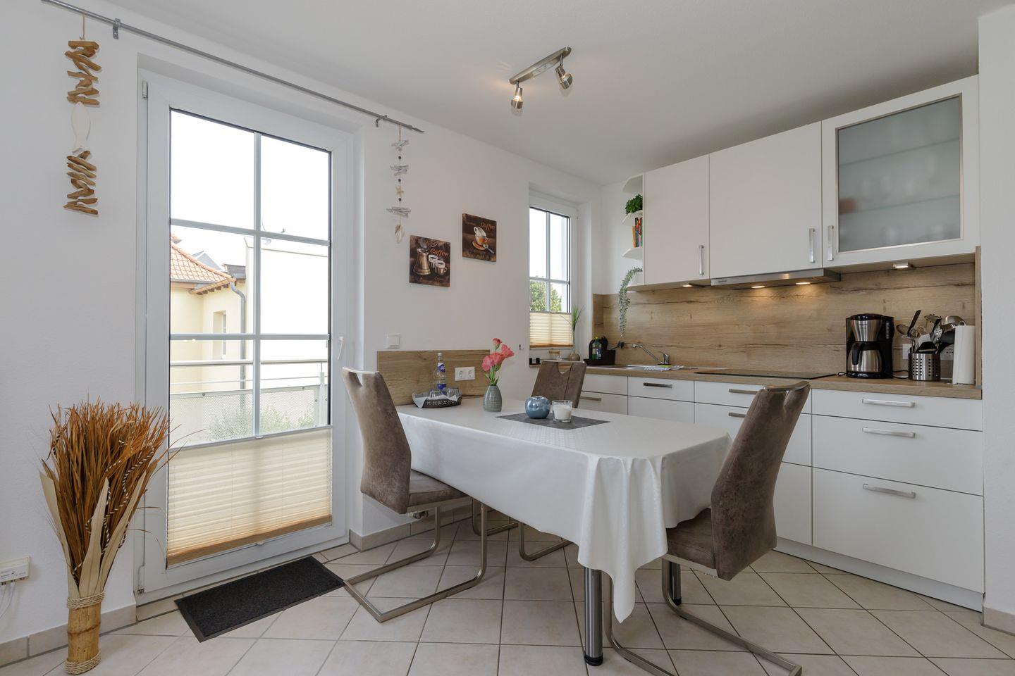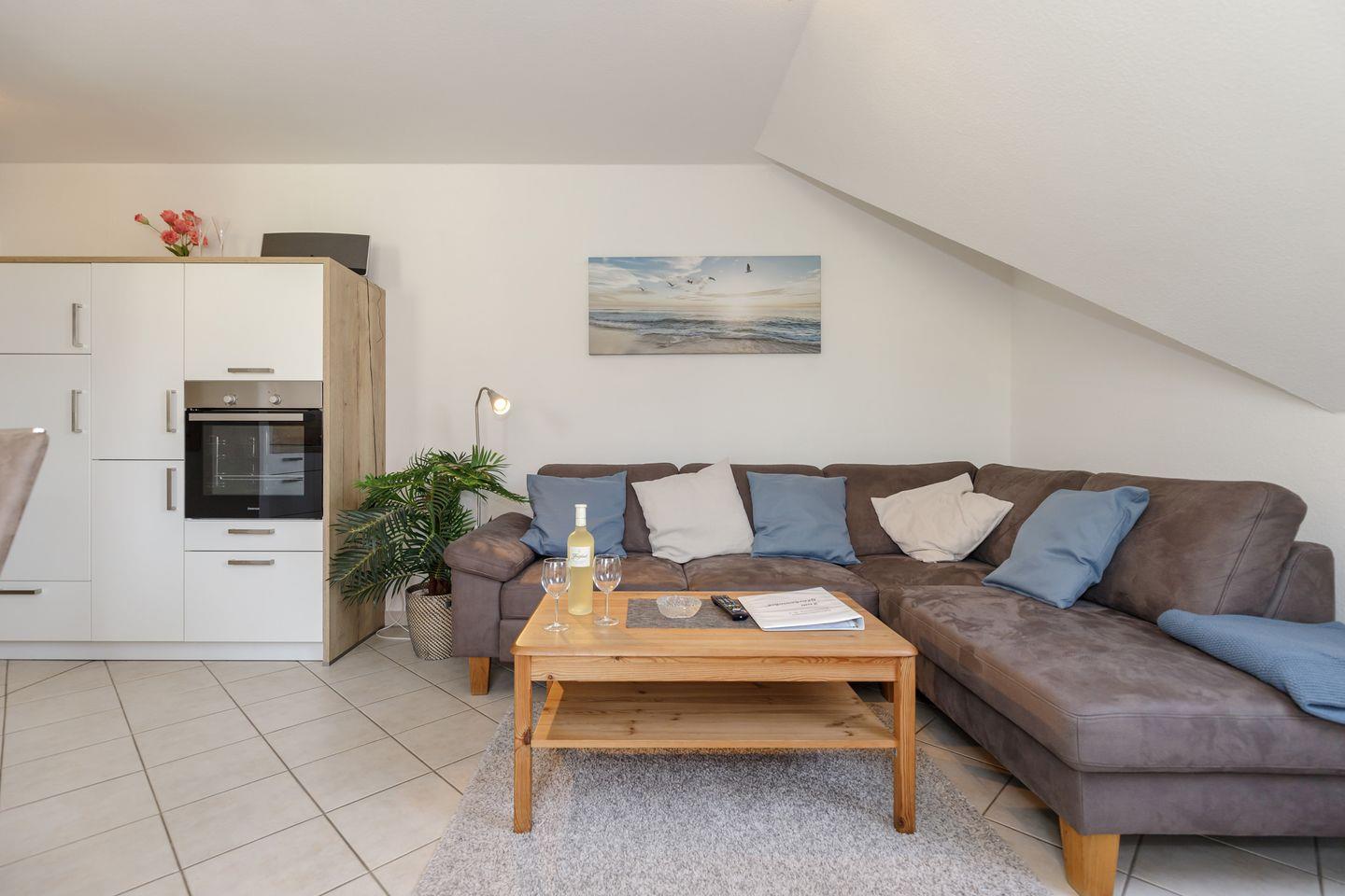 Der Wohnbereich ist behaglich gestaltet und bietet mit seiner großen Eckcouch (mit Schlaffunktion 1,40 x 2,00 m) und einem 55-Zoll-Flachbild-TV ideale Voraussetzungen für entspannte Stunden. Ein Radio, DVD-Player, Bücher und eine kleine Spielesammlung sorgen auch an Regentagen für Abwechslung. Die offene, frisch renovierte Küchenzeile ist perfekt ausgestattet – mit 4-Platten-Cerankochfeld, Backofen, Geschirrspüler, Kühlschrank mit Gefrierfach, Mikrowelle, Toaster und Wasserkocher. Der angrenzende Essbereich mit drei Stühlen lädt zum gemeinsamen Frühstück oder Abendessen ein.