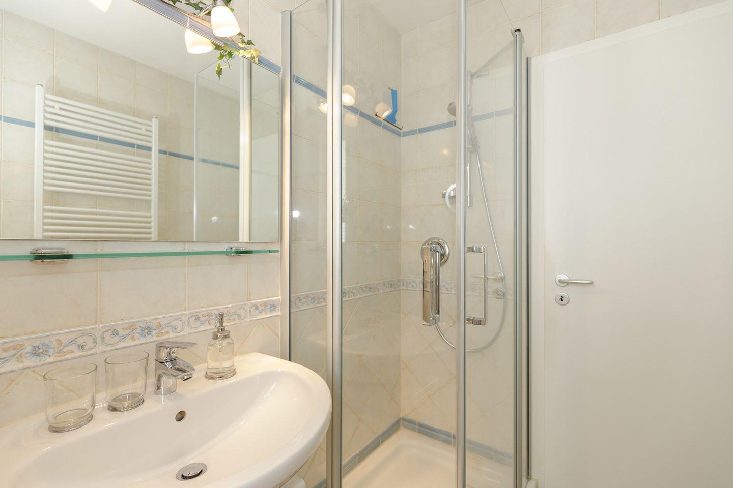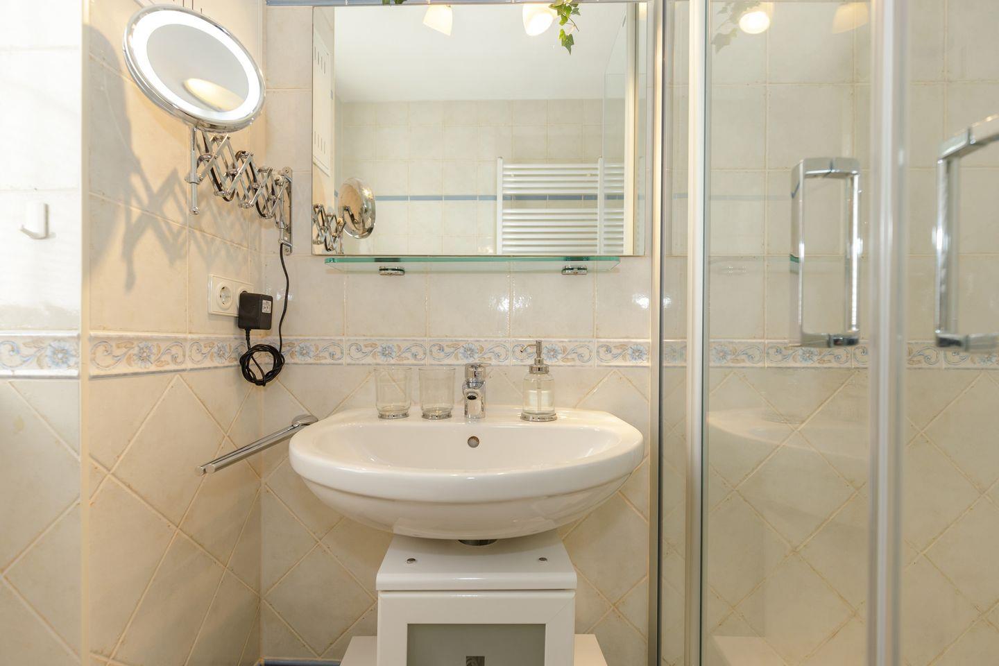 Das Schlafzimmer bietet ein hochwertiges Boxspringbett (180 x 200 cm, H2+H3-Matratzen) für erholsamen Schlaf, einen 42-Zoll-Flachbild-TV, Kleiderschrank, Spiegel und ausreichend Platz für Ihr Gepäck. Das Badezimmer mit Tageslicht ist modern ausgestattet – mit Dusche, WC, Waschtisch und beleuchtetem Kosmetikspiegel.