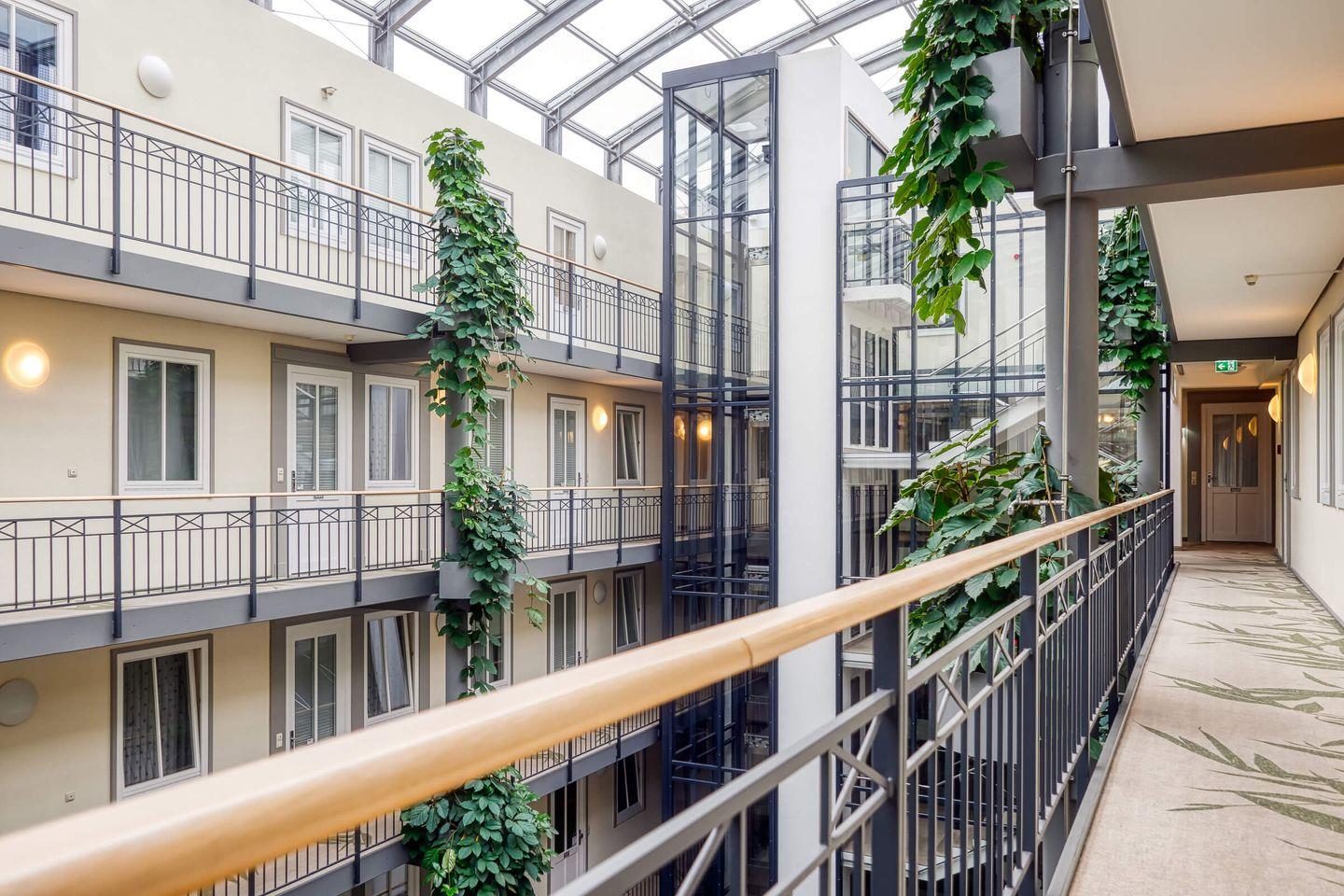 Über ein großzügiges, überdachtes und bepflanztes Atrium, erreichen Sie die Ferienwohnung von der Tiefgarage aus über die Treppe oder den Fahrstuhl. Der Südeingang des Hauses ermöglicht einen barrierefreien Zugang - das nördliche Portal führt auf kurzem Weg zum Strand.