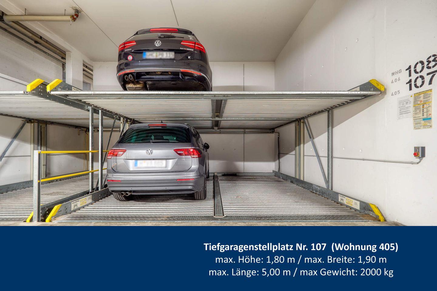Zur Wohnung gehört ein Tiefgaragenstellplatz (keine Ladestation für E-Autos). Die Anfahrt zur Tiefgarage erfolgt über die Poststraße (Koordinaten N 54,15108 / O 11,72894 bzw. N 54° 9' 3.888" / O 11° 43' 44.184"). Der Stellplatz 107 nimmt Fahrzeuge mit den Abmessungen auf: max. Breite von 1,90 m, einer Länge von 5,00 m, einer maximalen Höhe von 1,80 m und einem Gewicht von bis zu 2000 kg. Ihr Fahrzeug ist somit sicher und bequem untergebracht, sodass Sie Ihre Zeit in dieser einzigartigen Umgebung sorglos genießen können.