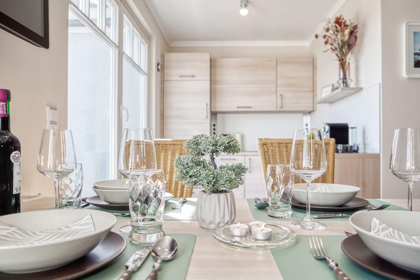 Flachbild-TV, WLAN und ein Bluetooth-fähiges Radio/CD runden das Angebot ab. Die Küche (u.a. mit 3 Cerankochfelder, Backofen, Kühlschrank mit Gefrierfach, Geschirrspüler, Wasserkocher, De Longhi Kapselautomat, Senseo (Kaffeepads) und eine Filter-Kaffeemaschine) ist komfortabel ausgestattet.