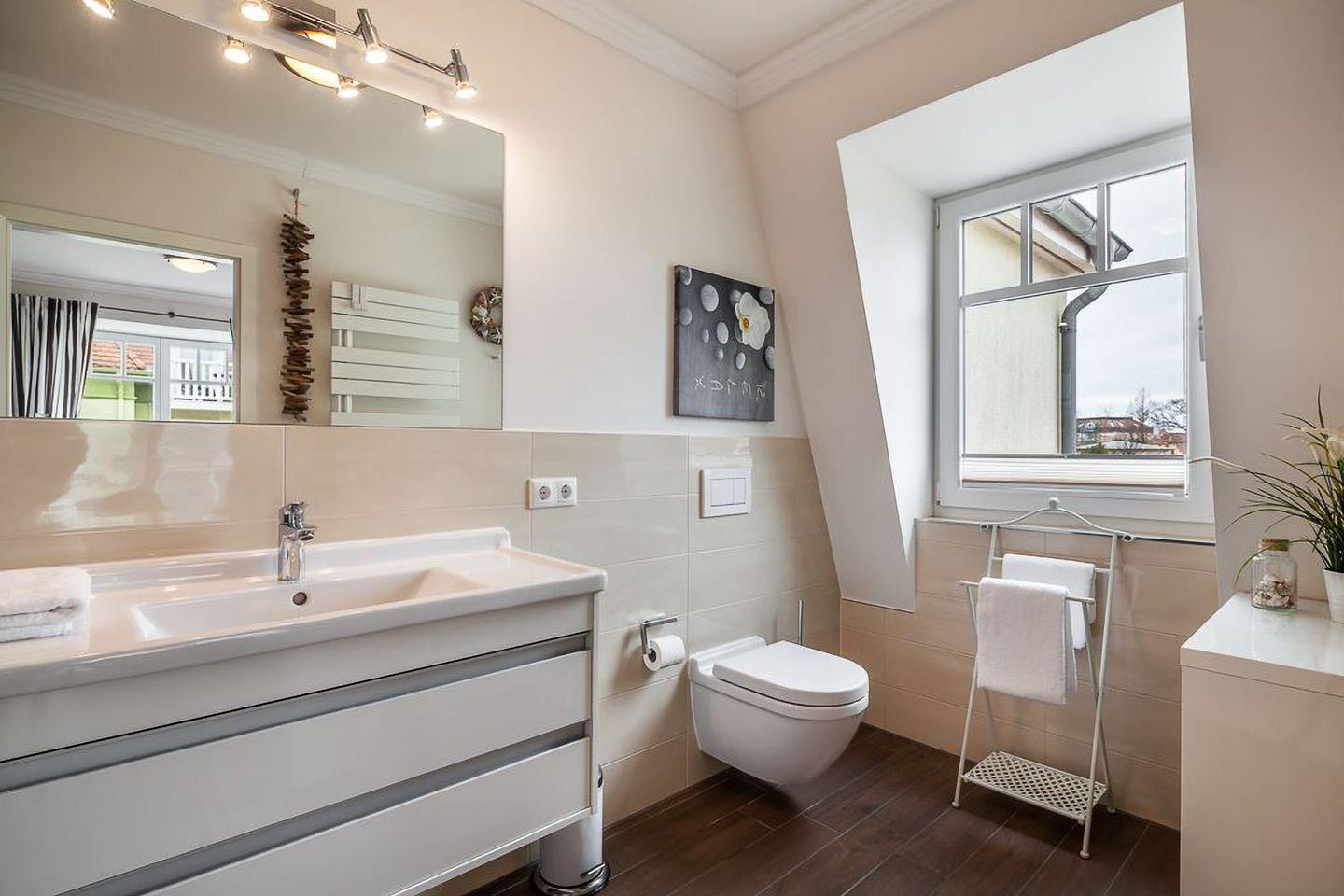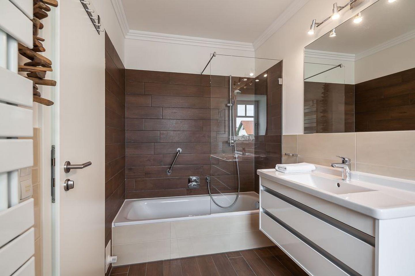 Zwei moderne Tageslichtbäder – eines mit Dusche, das andere mit Badewanne – bieten stilvolle Ausstattung und höchsten Komfort. Handtuchwärmer, Föhn und große Spiegel runden das Bild ab.
