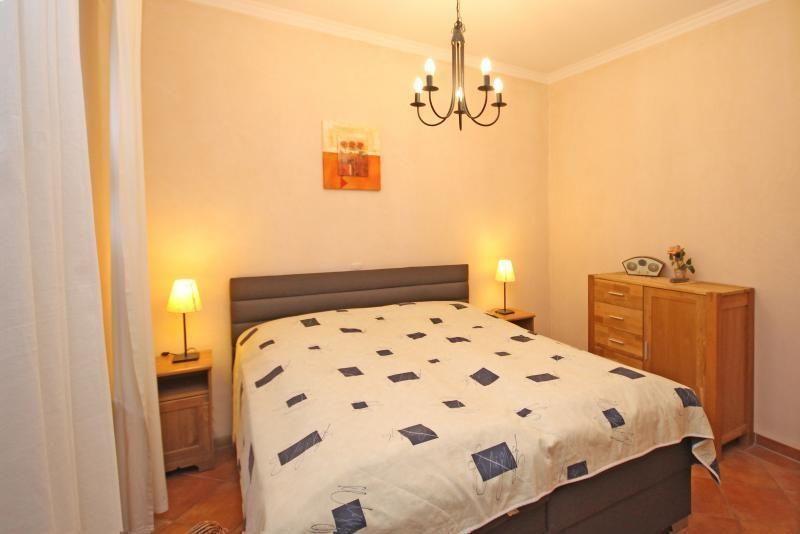 Das freundliche Schlafzimmer ist mit einem bequemen Doppelbett (Boxspringbett mit getrennten Matratzen), Nachttischen, einer Kommode sowie einem geräumigen Kleiderschrank eingerichtet. Weiterhin stehen Ihnen hier ein zusätzliches TV-Gerät sowie ein Radiowecker zur Verfügung.