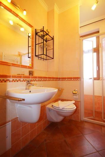 Das mediterran gestaltete Badezimmer (mit Tageslicht / Fenster) verfügt über eine Dusche (seniorenfreundlich mit niedrigem Einstieg), Waschbecken und WC, einen Handtuch-Heizkörper, Fön sowie Fußbodenheizung.
