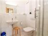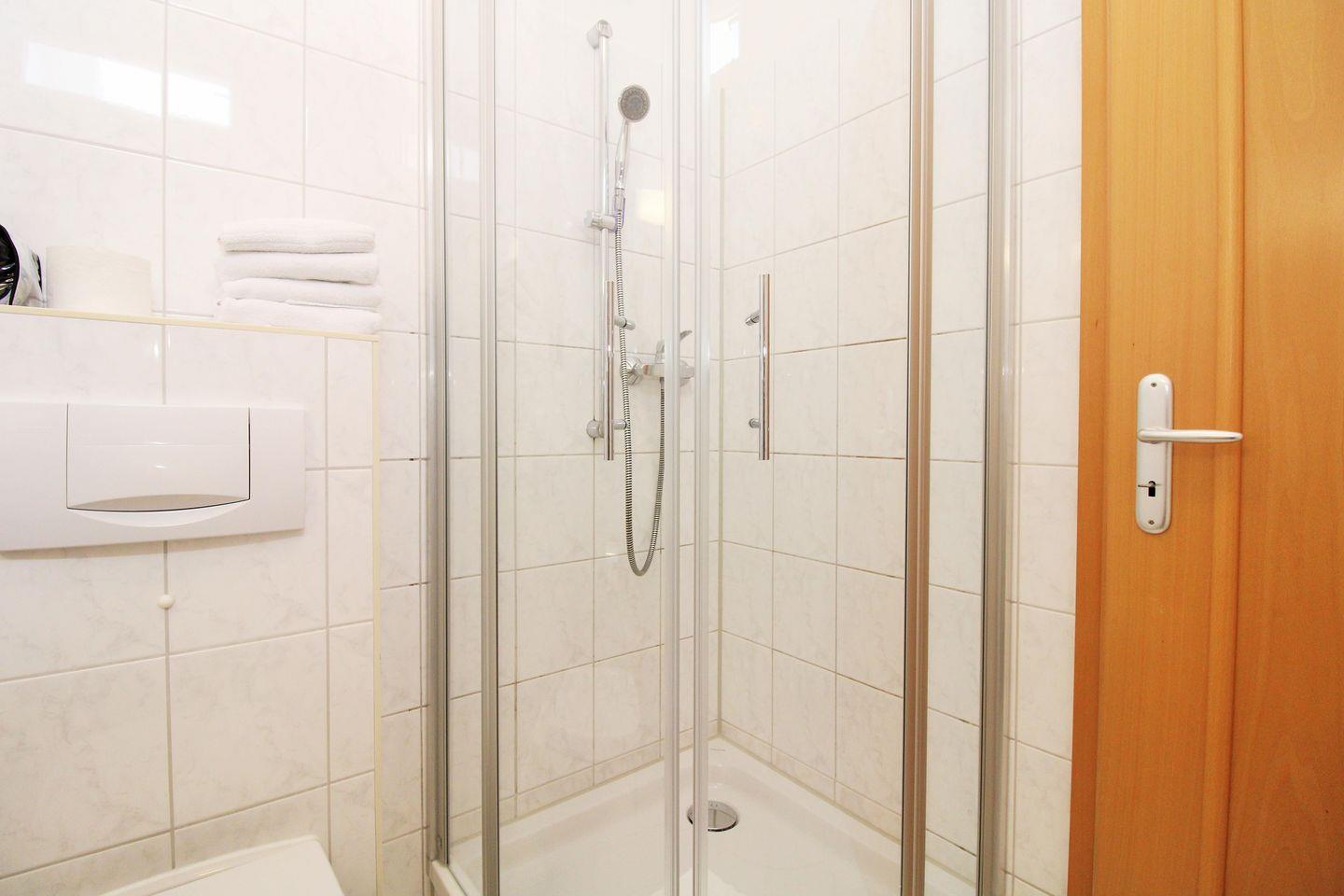 Das freundliche Badezimmer verfügt über eine moderne Echtglas-Dusche, Waschbecken, WC, Hocker sowie ausreichend Ablagemöglichkeiten.