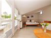 Das großzügige und helle 1. Schlafzimmer ist mit einem bequemen Doppelbett, Nachttischen, 2 geräumigen Kleiderschränken, 2 Kommoden sowie einem separaten Sitzbereich mit 2 bequemen Sesseln und einem Couchtisch eingerichtet. Das Zimmer besitzt 2 große bodentiefe Fenster (französischer Balkon) mit freiem Blick ins Grüne.