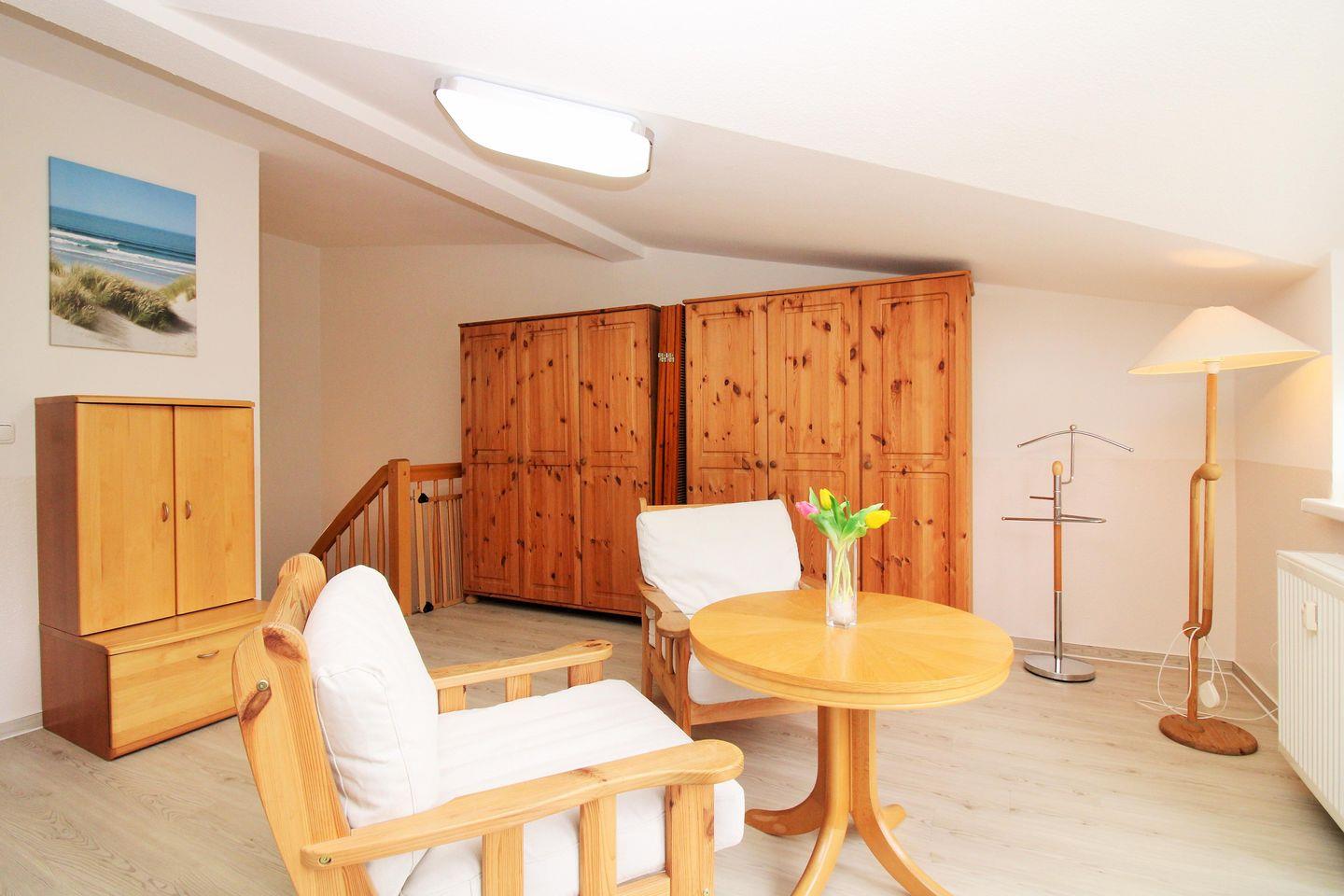 Die strandnahe, freundliche und sehr geräumige 3-Zimmer-Studiowohnung (ca. 74 m²) über 2 Etagen (mit innenliegender Treppe vom EG ins 1. OG) im hinteren Hausbereich des Gebäudes besitzt ein hohes Maß an Funktionalität und ist komplett eingerichtet. Der Bodenbelag in allen Wohnräumen ist moderner Vinyl-Designbelag, das Bad / WC ist gefliest.