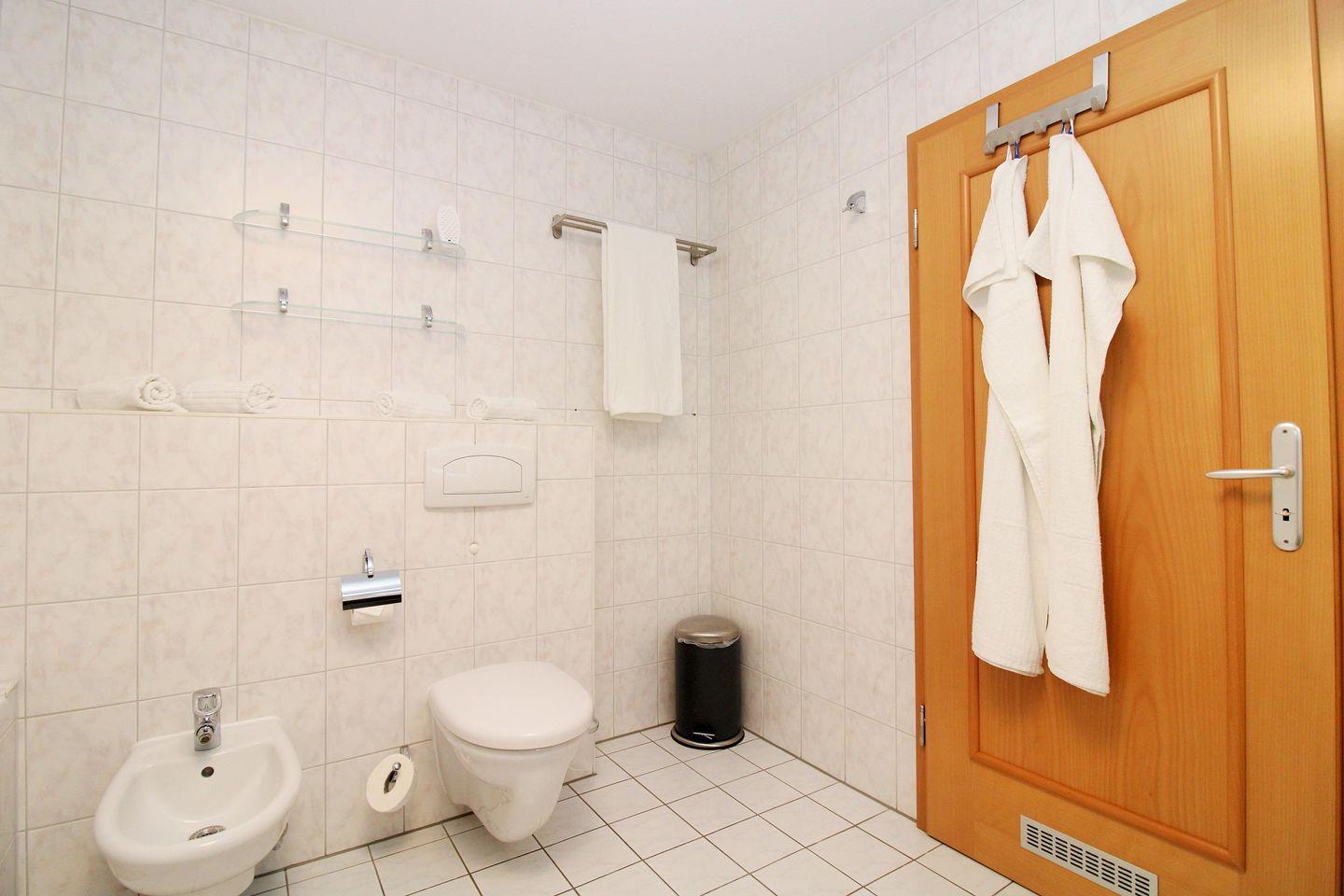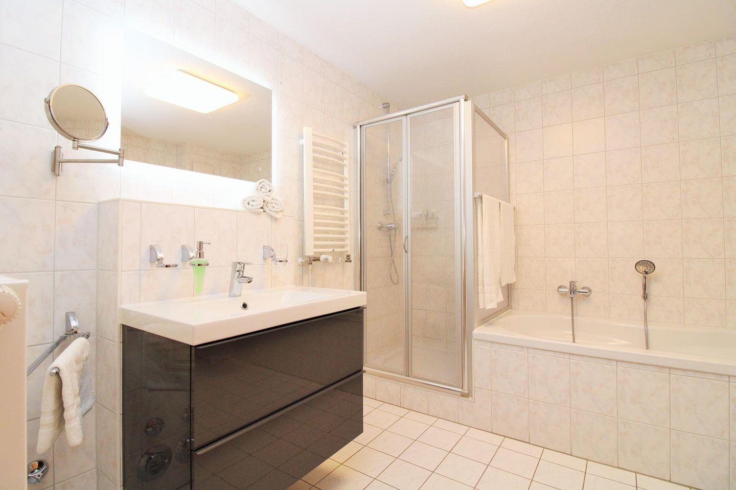 Das geräumige Badezimmer verfügt über eine Badewanne, eine Dusche, Waschbecken mit Unterschrank, WC, Bidet, Kosmetikspiegel, einen Handtuchheizkörper sowie ausreichend Ablageflächen.