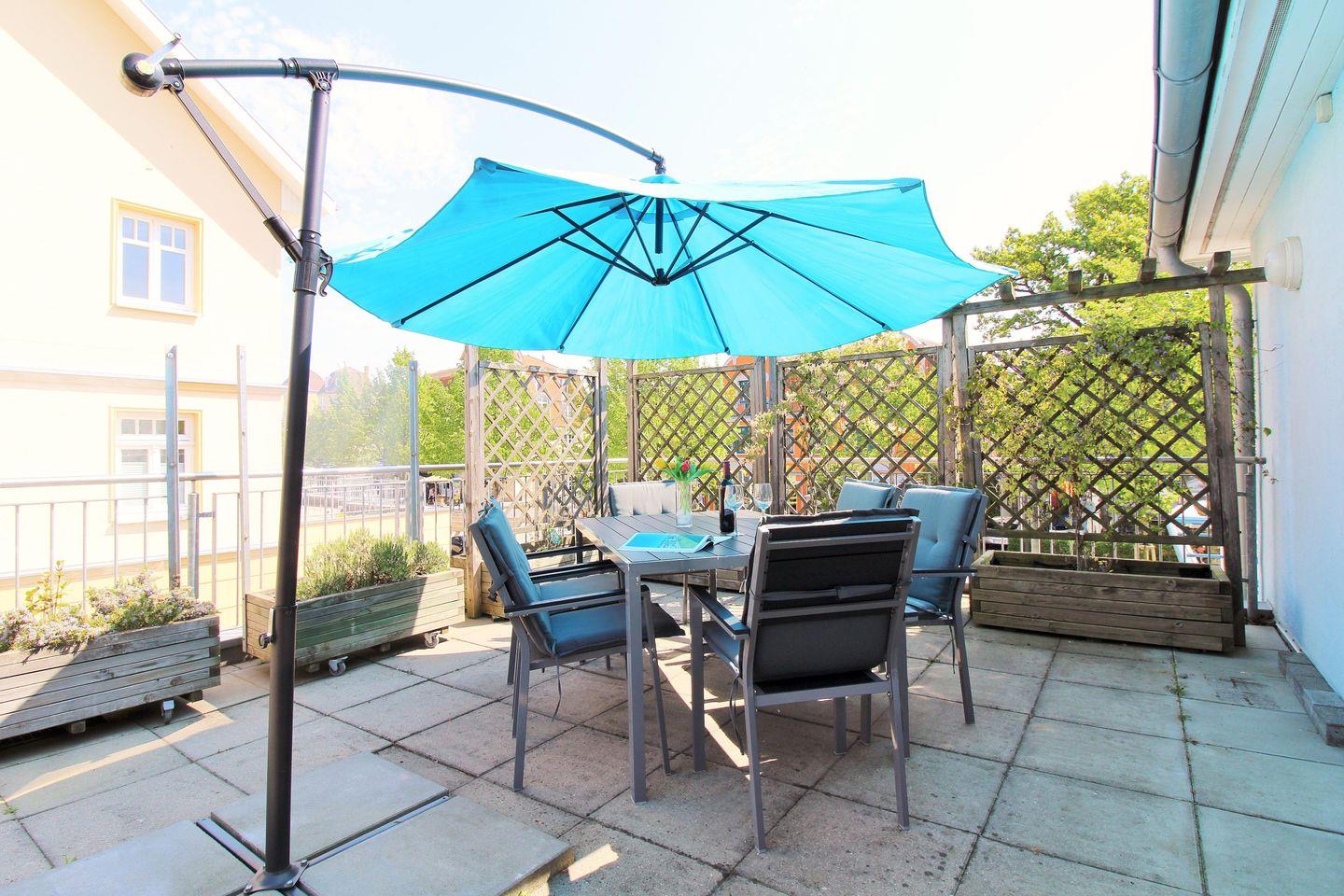 Vom Wohnzimmer aus haben Sie direkten Zugang zu einer ca. 40 m² großen und sonnigen Dachterrasse mit Balkonmöbeln und großem Sonnenschirm. Hier sitzen Sie entspannt und gemütlich im Grünen, um Ihre Mahlzeiten oder abends bei einem guten Glas Wein die lauen Sommernächte zu genießen!