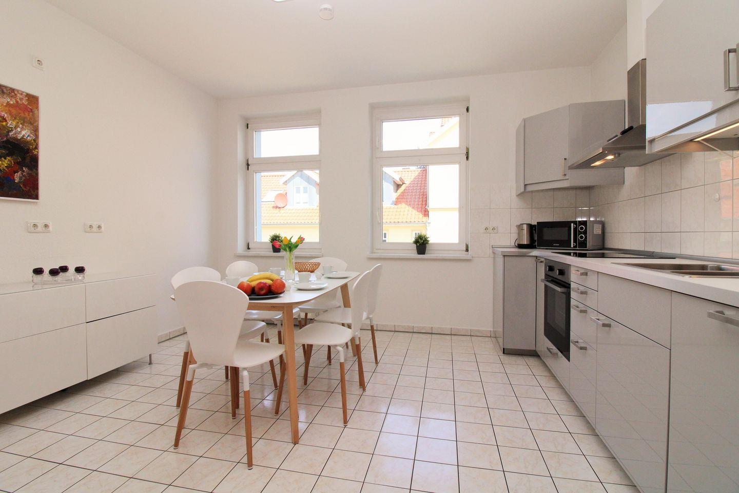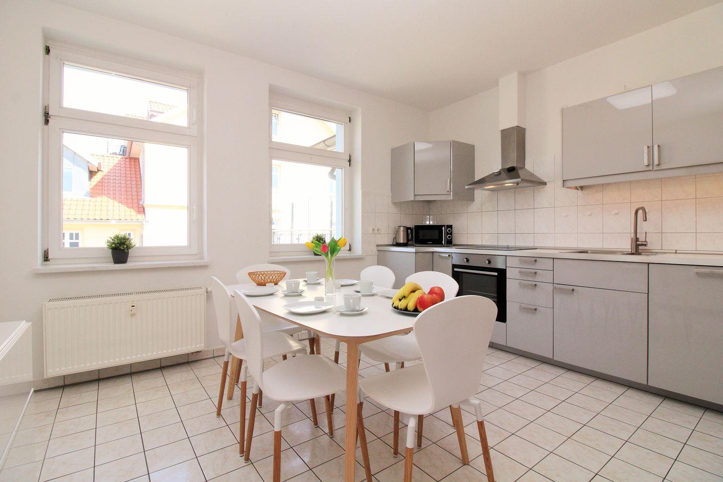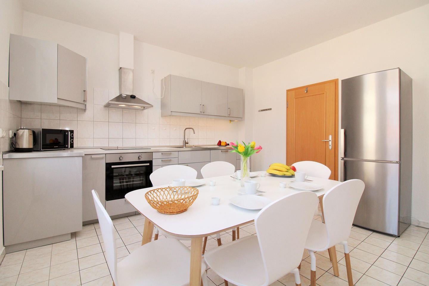 Die separate und sehr geräumige Wohnküche beinhaltet eine komplett ausgestattete Einbauküchenzeile in gehobener Ausstattung mit 4-Zonen-Ceran-Kochfeld, Dunstabzug, Backofen, Mikrowelle, Kühlschrank, Gefrierschrank, Geschirrspülmaschine, Kaffeemaschine, Wasserkocher und Toaster. Die Küche ist mit Geschirr, Gläsern, Besteck und Töpfen komplett ausgestattet.