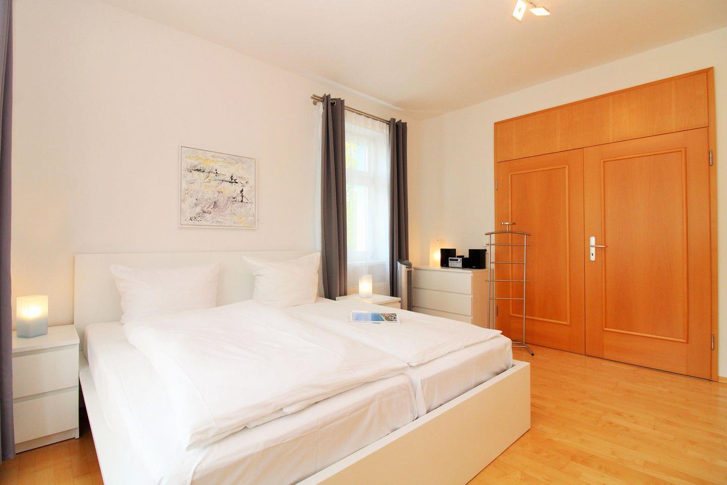 Das moderne und lichtdurchflutete 1. Schlafzimmer ist mit einem bequemen Doppelbett, Nachttischen, 2 geräumigen Kleiderschränken sowie einer Kommode eingerichtet. Besonders hervorzuheben ist in diesem Raum eine separate und in einem Erker räumlich etwas abgetrennte gemütliche Sitzgruppe mit bequemen Korbmöbeln. Zu Ihrer Unterhaltung steht Ihnen hier ebenfalls eine Stereoanlage mit Radio und CD-Player zur Verfügung.
