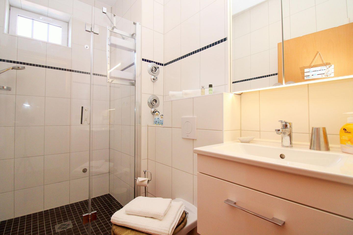Das moderne Badezimmer (mit Tageslicht / Fenster) verfügt über eine Dusche mit eben-erdigem Einstieg (seniorenfreundlich!), Waschbecken, WC sowie ausreichend Ablage-möglichkeiten.