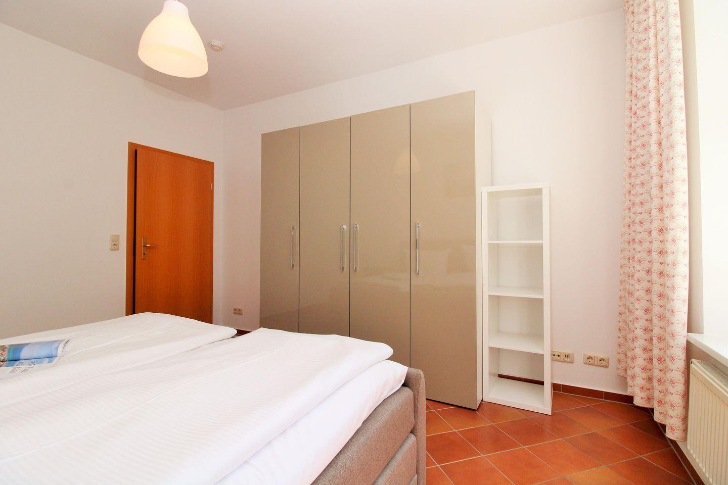 Das geräumige Schlafzimmer ist mit einem bequemen Boxspringbett, Nachttischen, einem geräumigen Kleiderschrank sowie einem Regal eingerichtet. Eine zusätzliche bequeme Schlafmöglichkeit für eine weitere 3. und 4. Person bietet die ausziehbare Schlafcouch im Wohnzimmer.